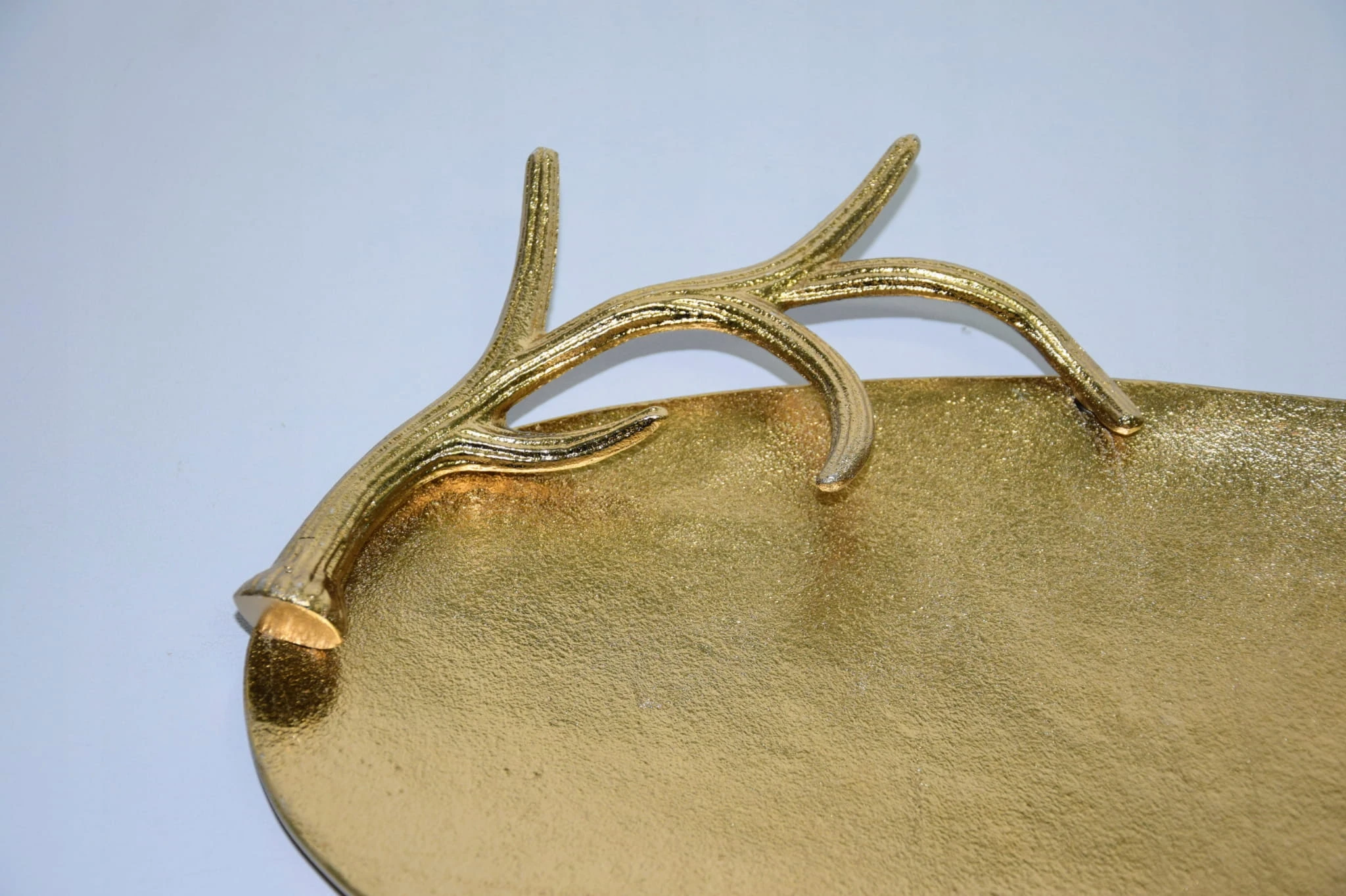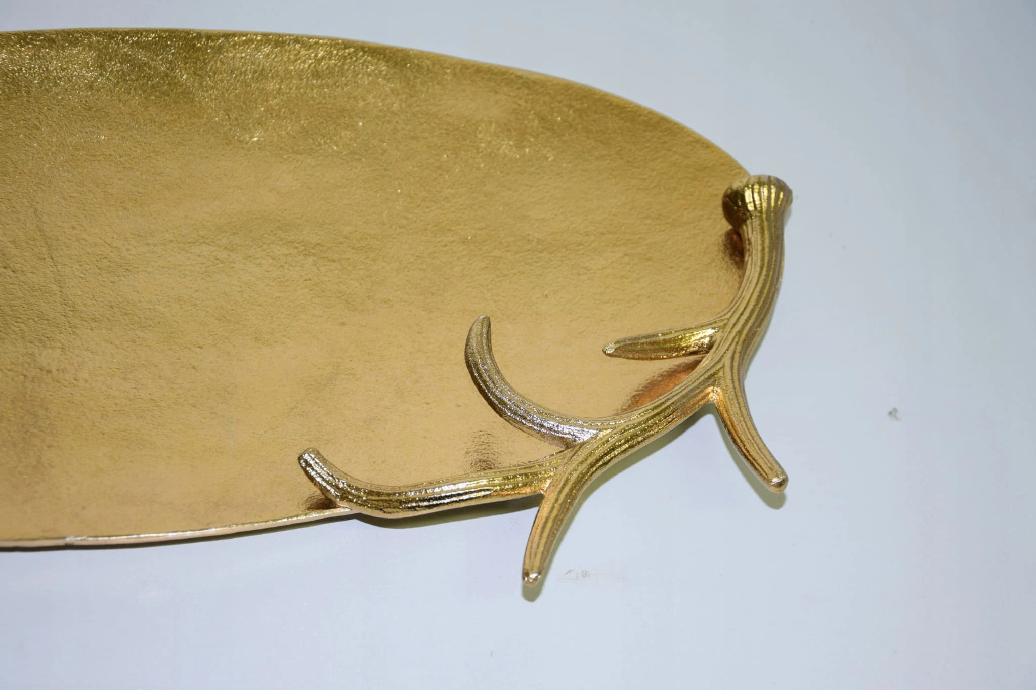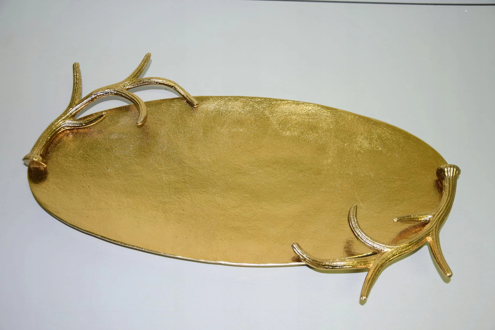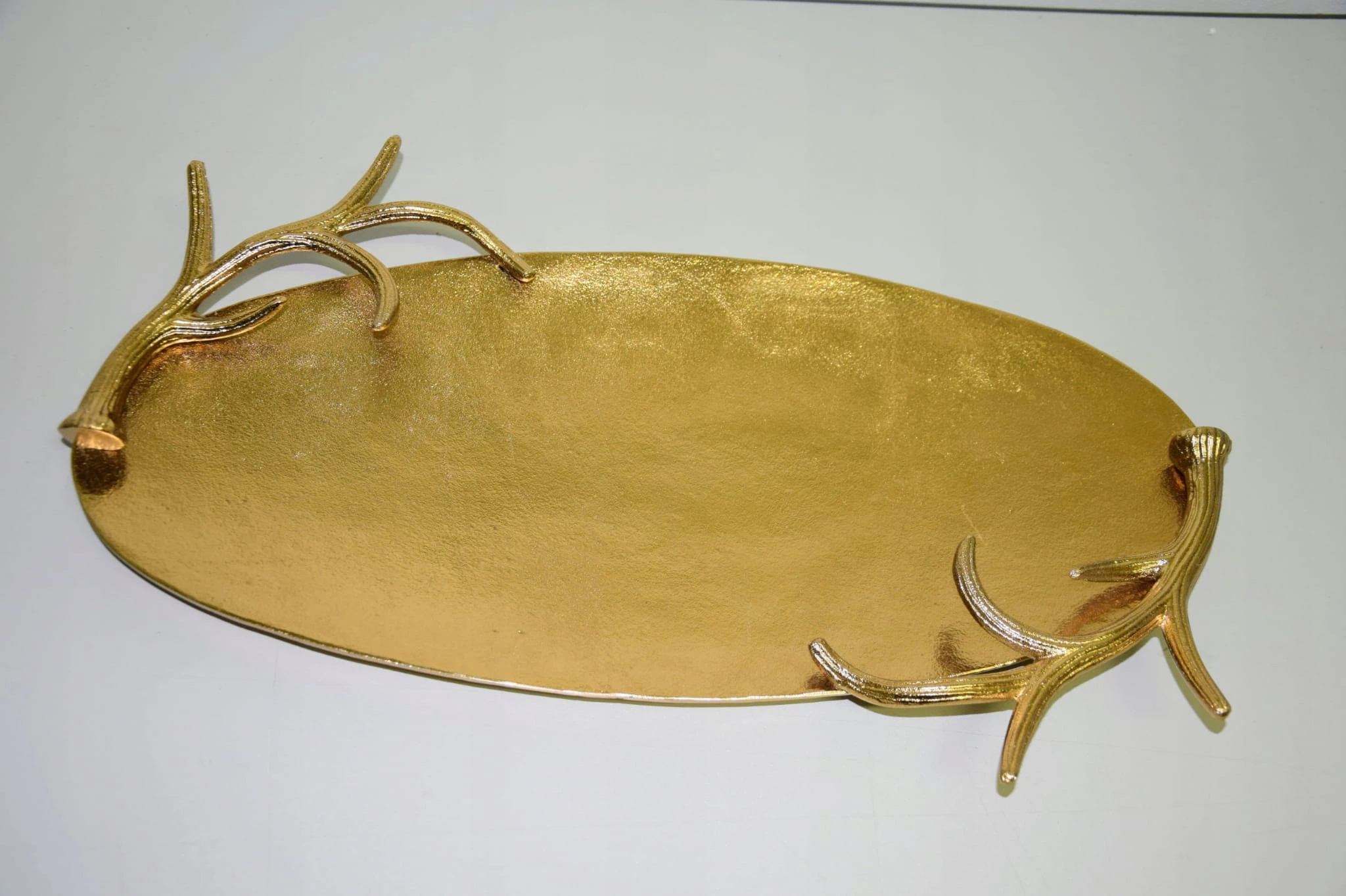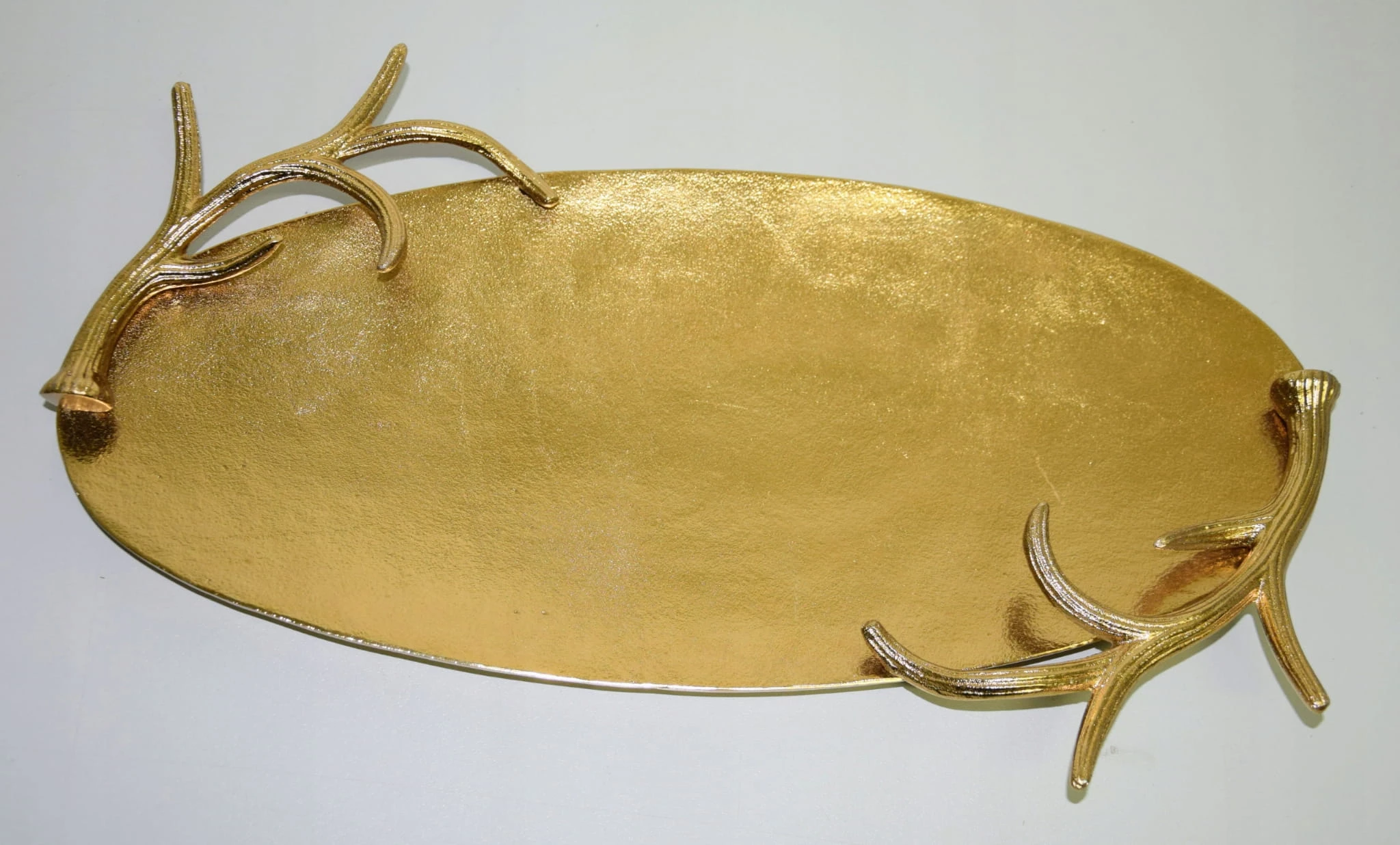 Taca metalowa owalna, srebrna o o wymiarach ok 50X29,5X5,5cm. Wyjątkowo piękna taca – idealna do dekoracji w salonie lub w jadalni. Taca posiada boczne ozdoby z poroży (wszystko wykonane w metalu) – mogą posłużyć jako uchwyty do przenoszenia. Brzeg (poroże) o wysokości ok 4,5 cm. Piękna taca do dekoracji i użytku w kuchni.