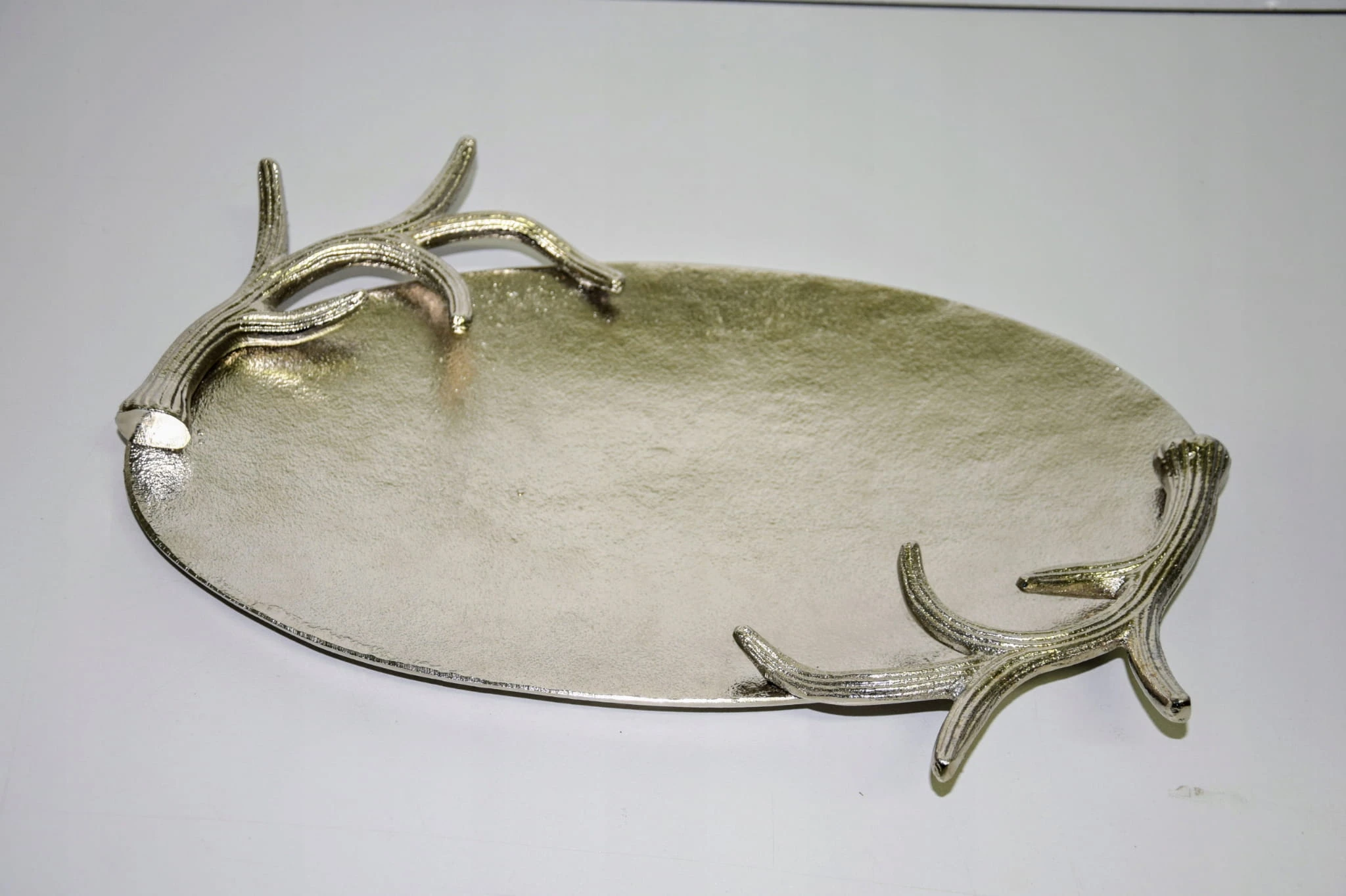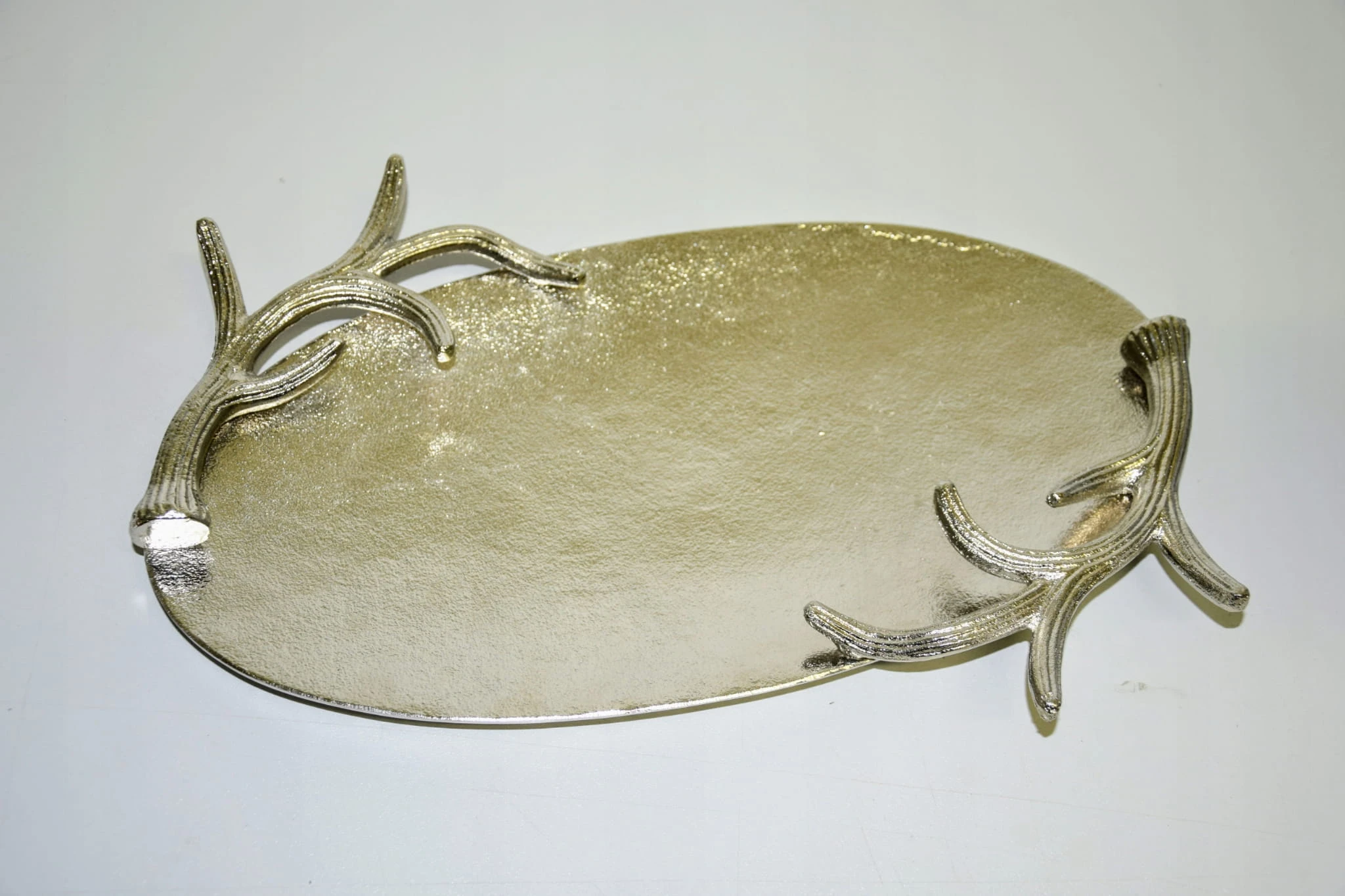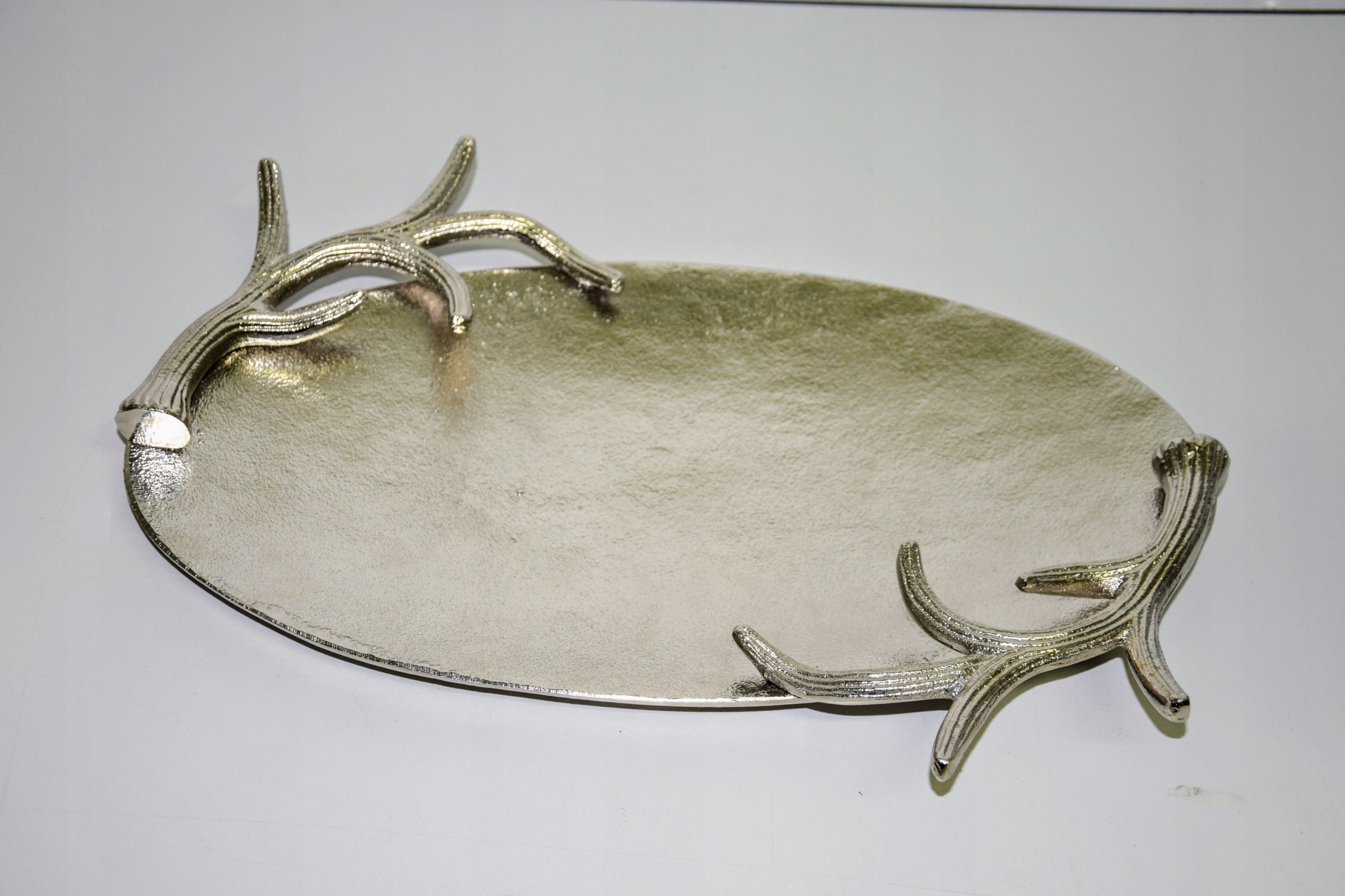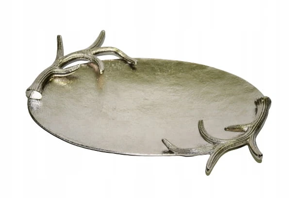 Taca metalowa owalna, srebrna o o wymiarach ok 38,5 x 27 cm. Wyjątkowo piękna taca – idealna do dekoracji w salonie lub w jadalni. Taca posiada boczne ozdoby z poroży (wszystko wykonane w metalu) – mogą posłużyć jako uchwyty do przenoszenia. Brzeg (poroże) o wysokości ok 4,5 cm. Piękna taca do dekoracji i użytku w kuchni.