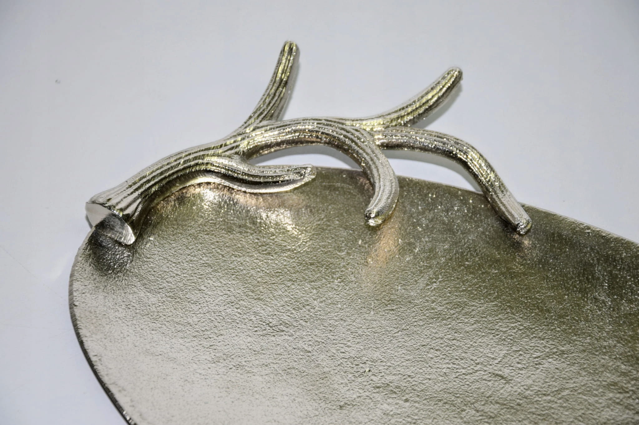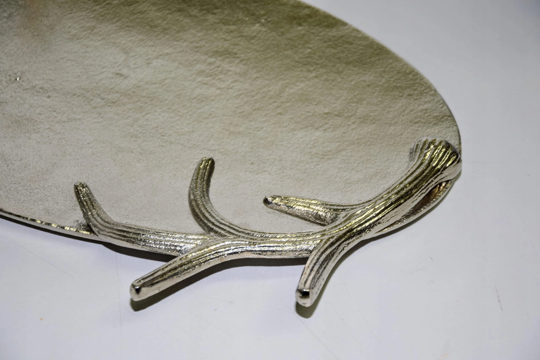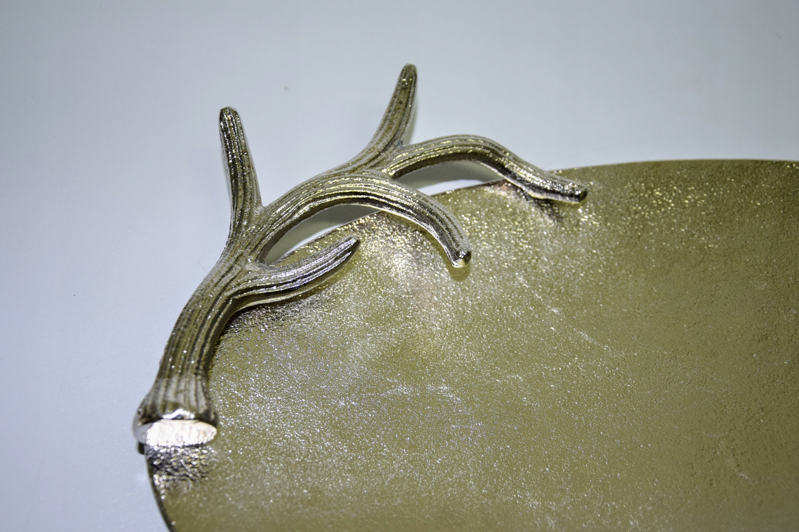 Taca metalowa owalna, srebrna o o wymiarach ok 38,5 x 27 cm. Wyjątkowo piękna taca – idealna do dekoracji w salonie lub w jadalni. Taca posiada boczne ozdoby z poroży (wszystko wykonane w metalu) – mogą posłużyć jako uchwyty do przenoszenia. Brzeg (poroże) o wysokości ok 4,5 cm. Piękna taca do dekoracji i użytku w kuchni.