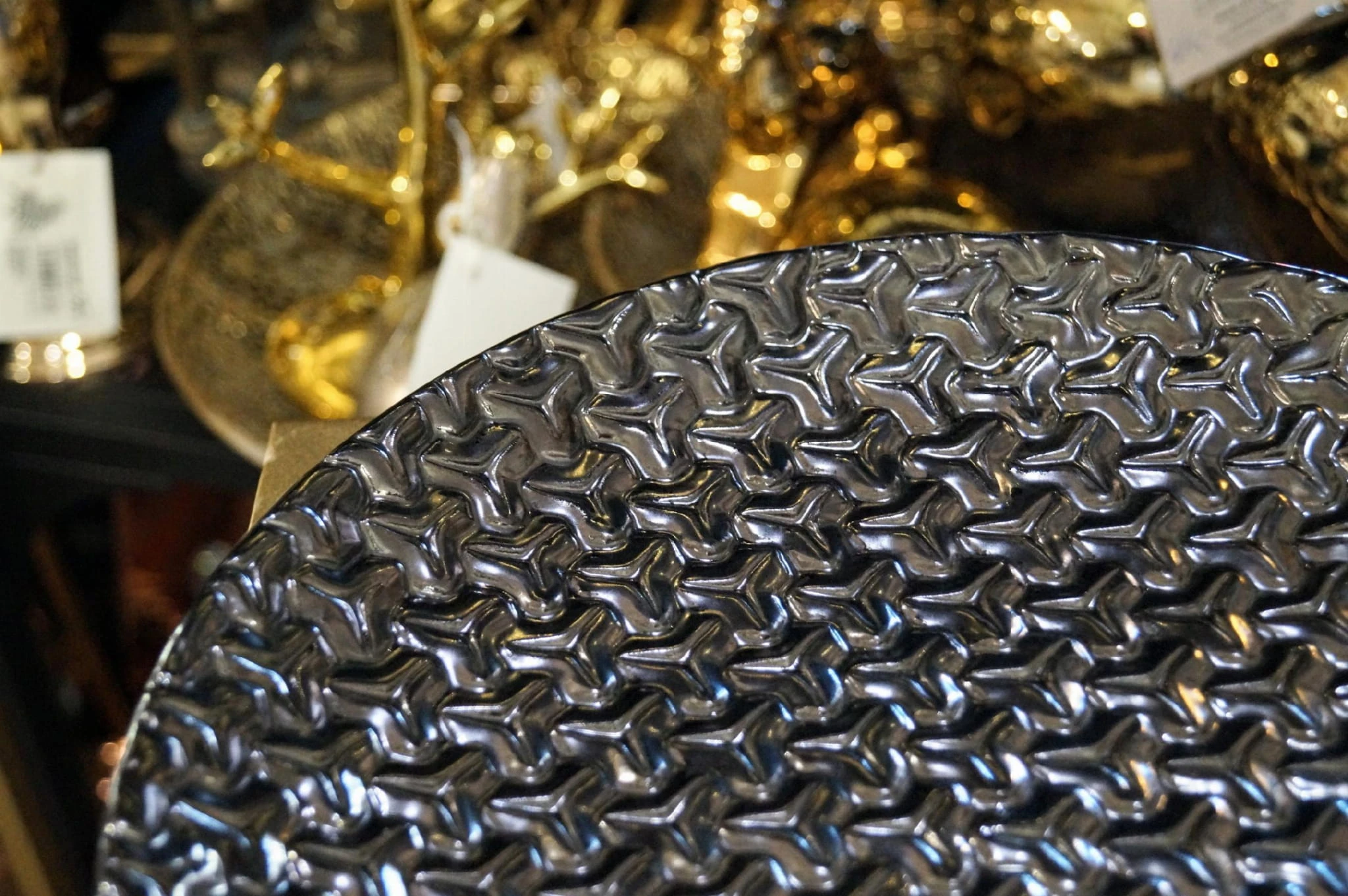 Talerz grafit jest to idealny dodatek do dekoracji. Możemy łączyć go ze świecami, ale również sprawdzi się jako miejsce na biżuterię. Jest on wykonany z ceramiki. Kolorystyka jest bardzo nowoczesna.