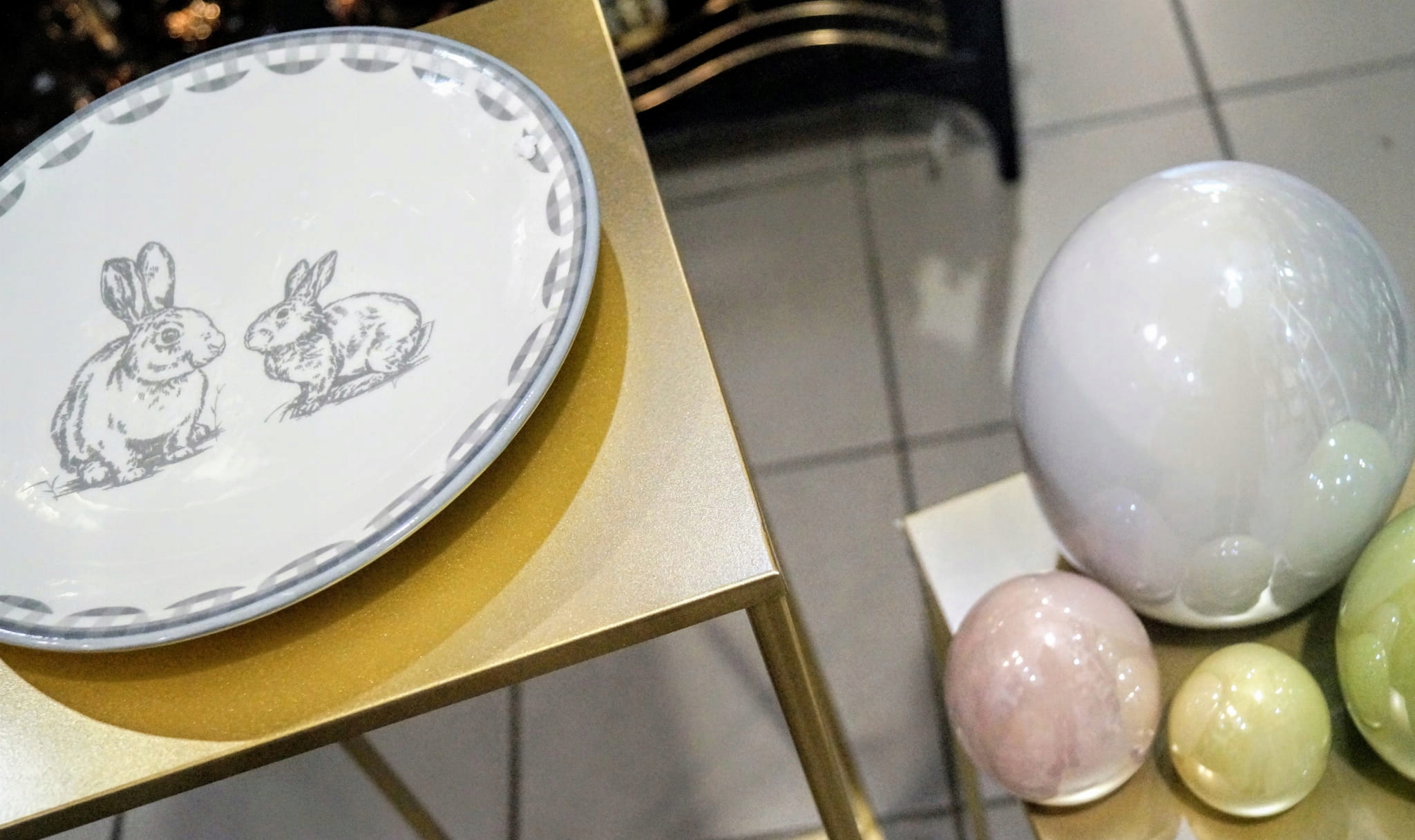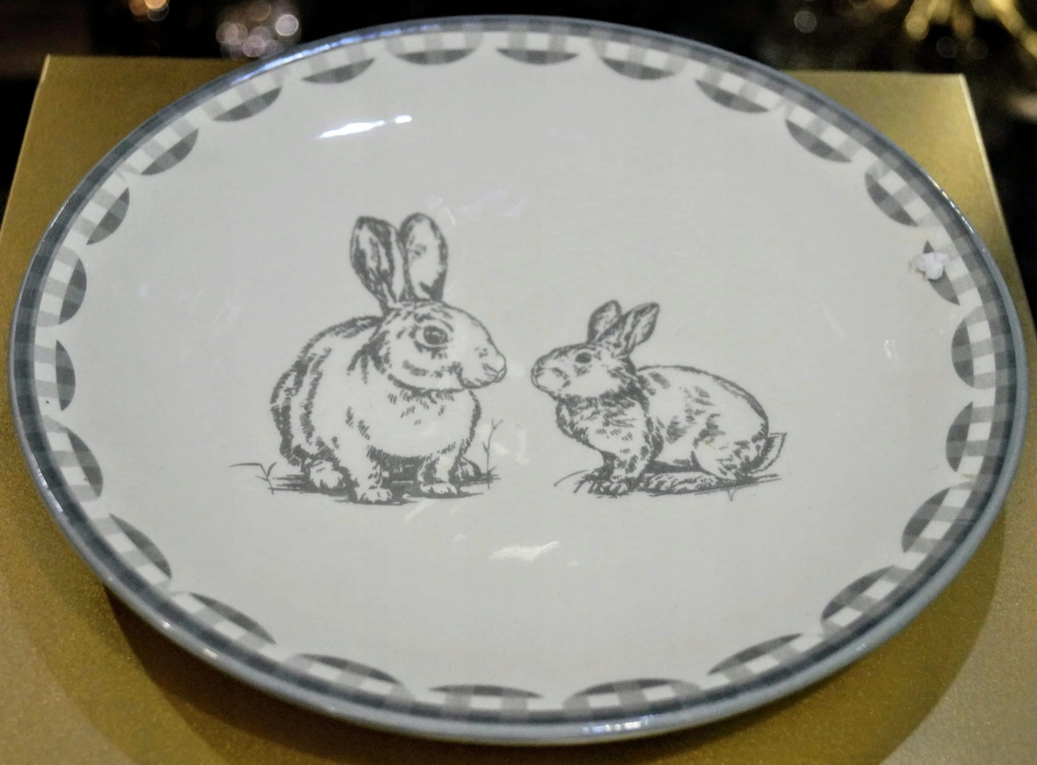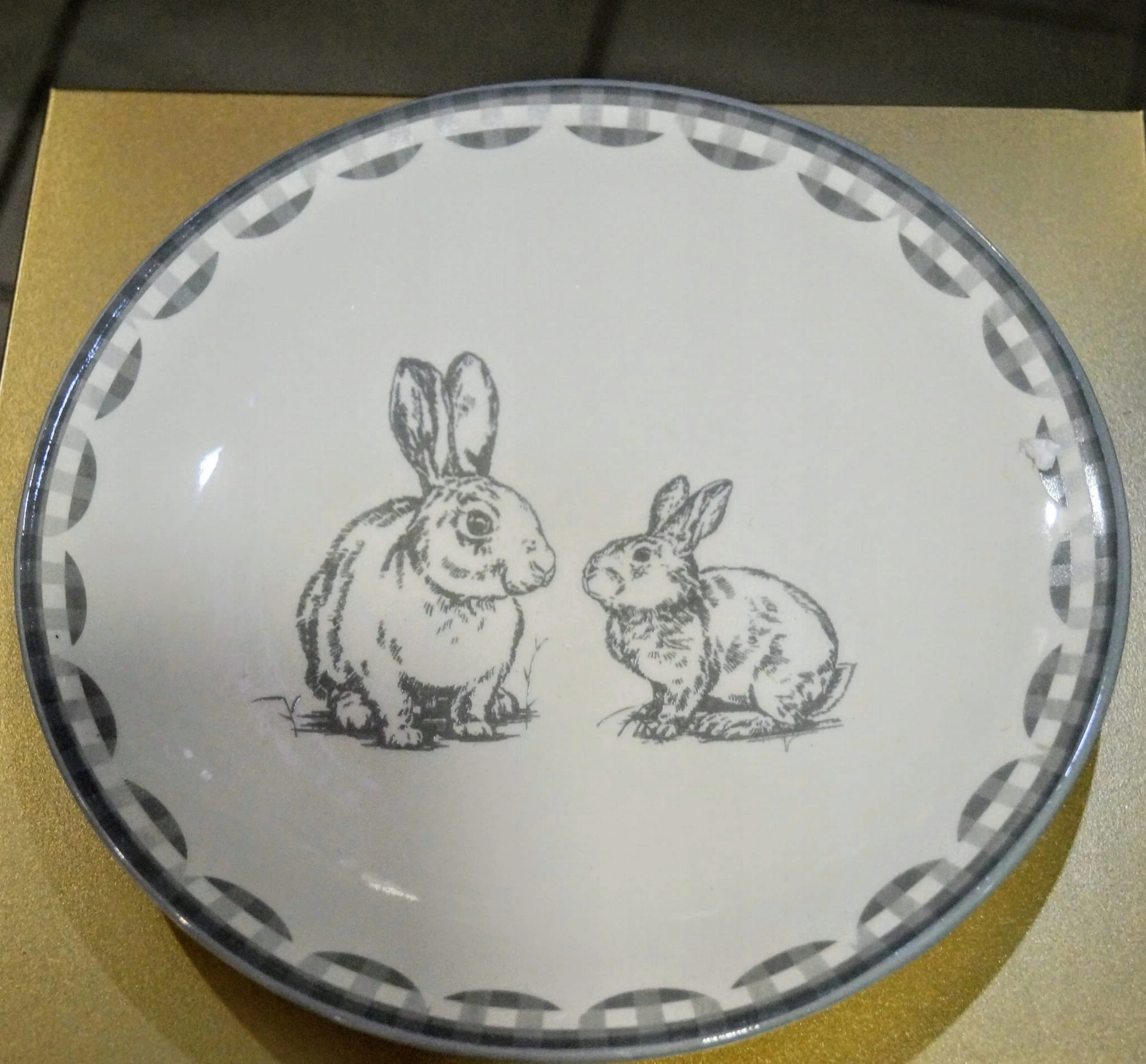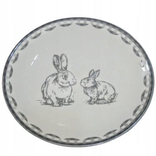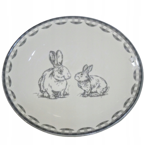 TALERZ OKRĄGŁY BIAŁO-SZARY Z ZAJĄCZKAMI