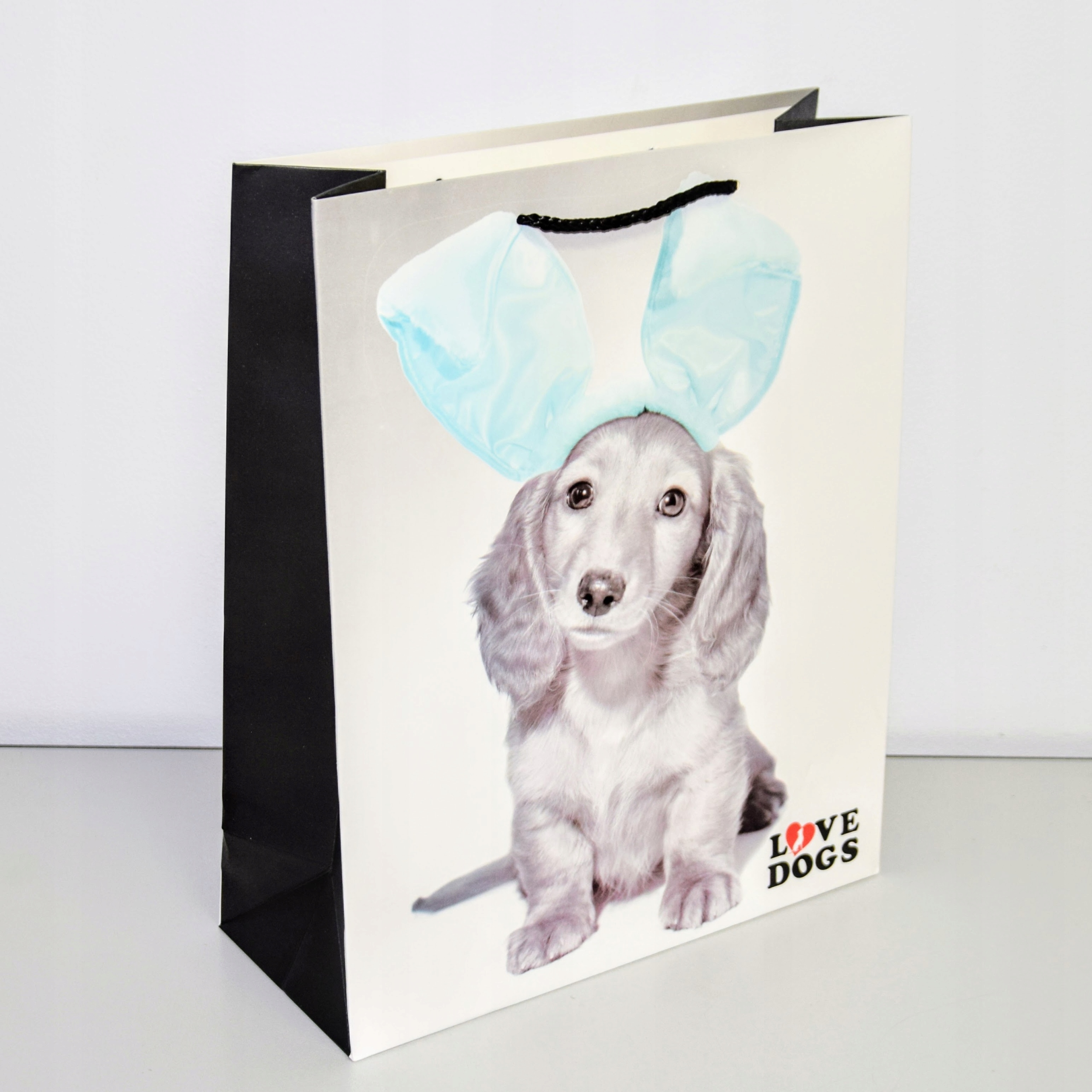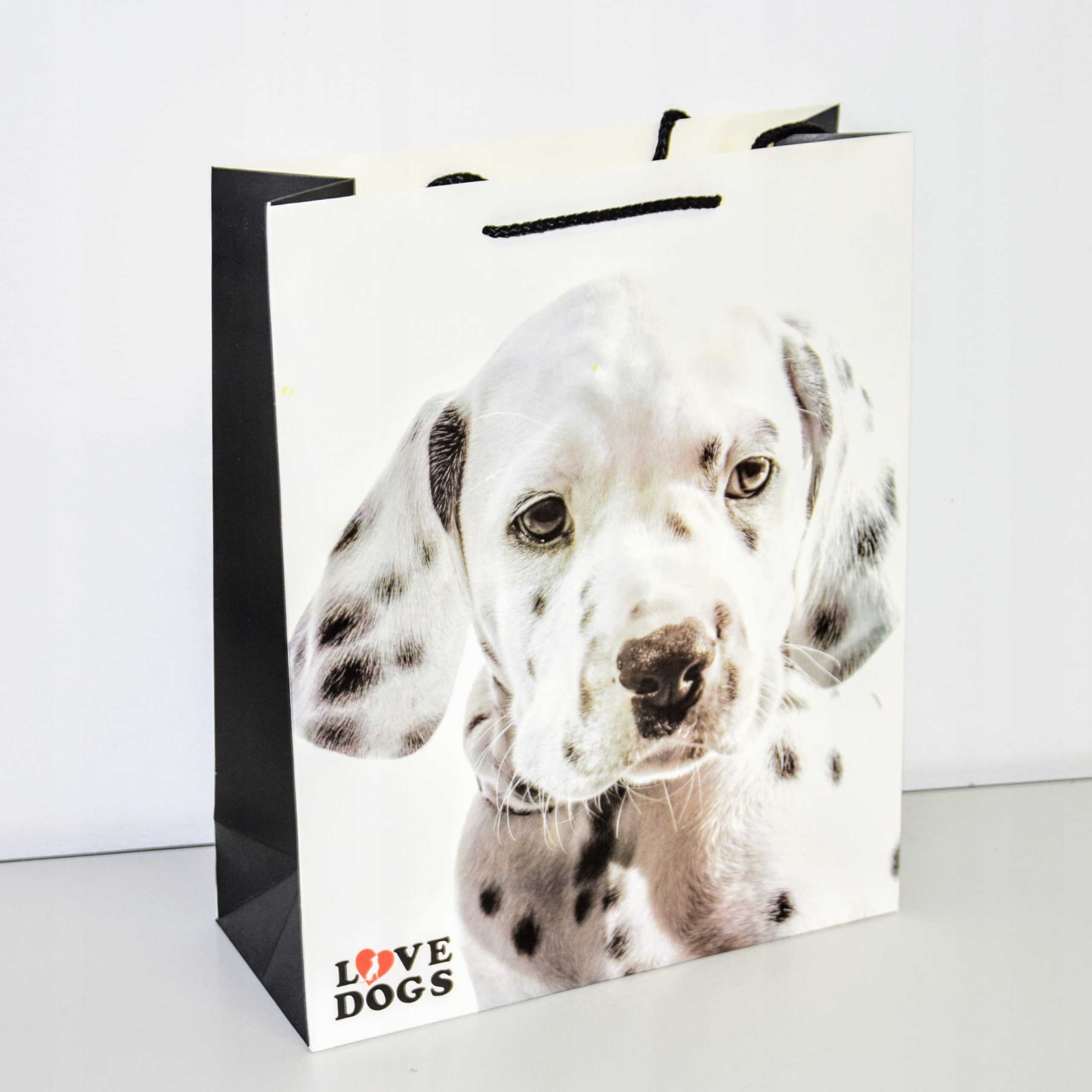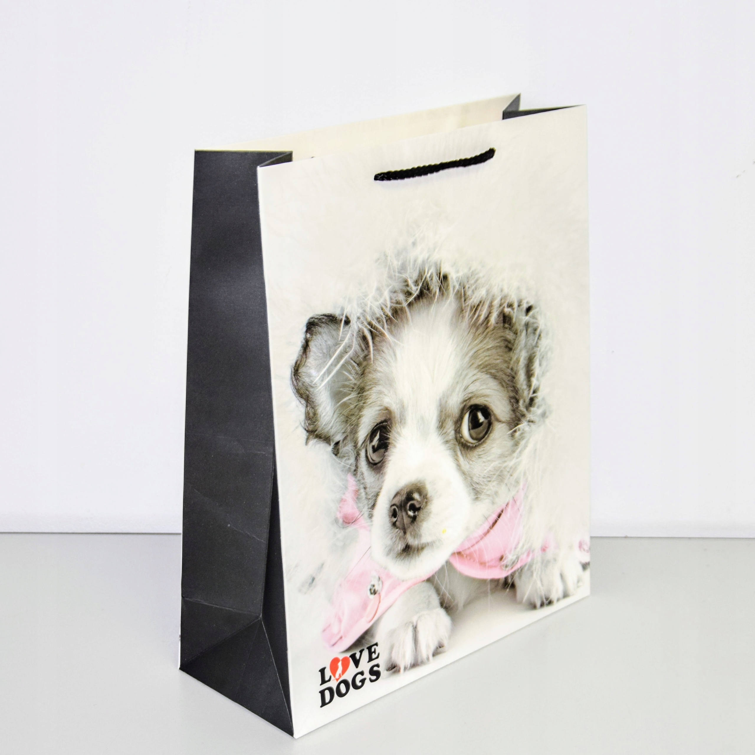 Elegancka torebka prezentowa wykonana z wysokiej jakości papieru. Uchwyty wykonane są z czarnego, plecionego sznurka.