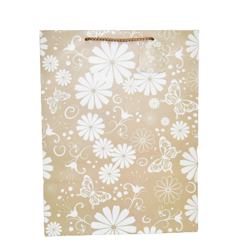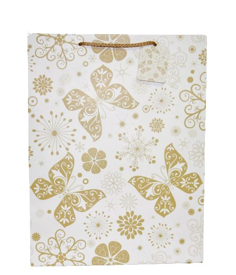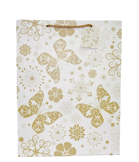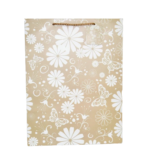 Elegancka torebka prezentowa zdobiona uroczym nadrukiem. Wykonana z wysokiej jakości, grubego papieru. Uchwyty wykonane są z dopasowanego kolorystycznie sznurka.