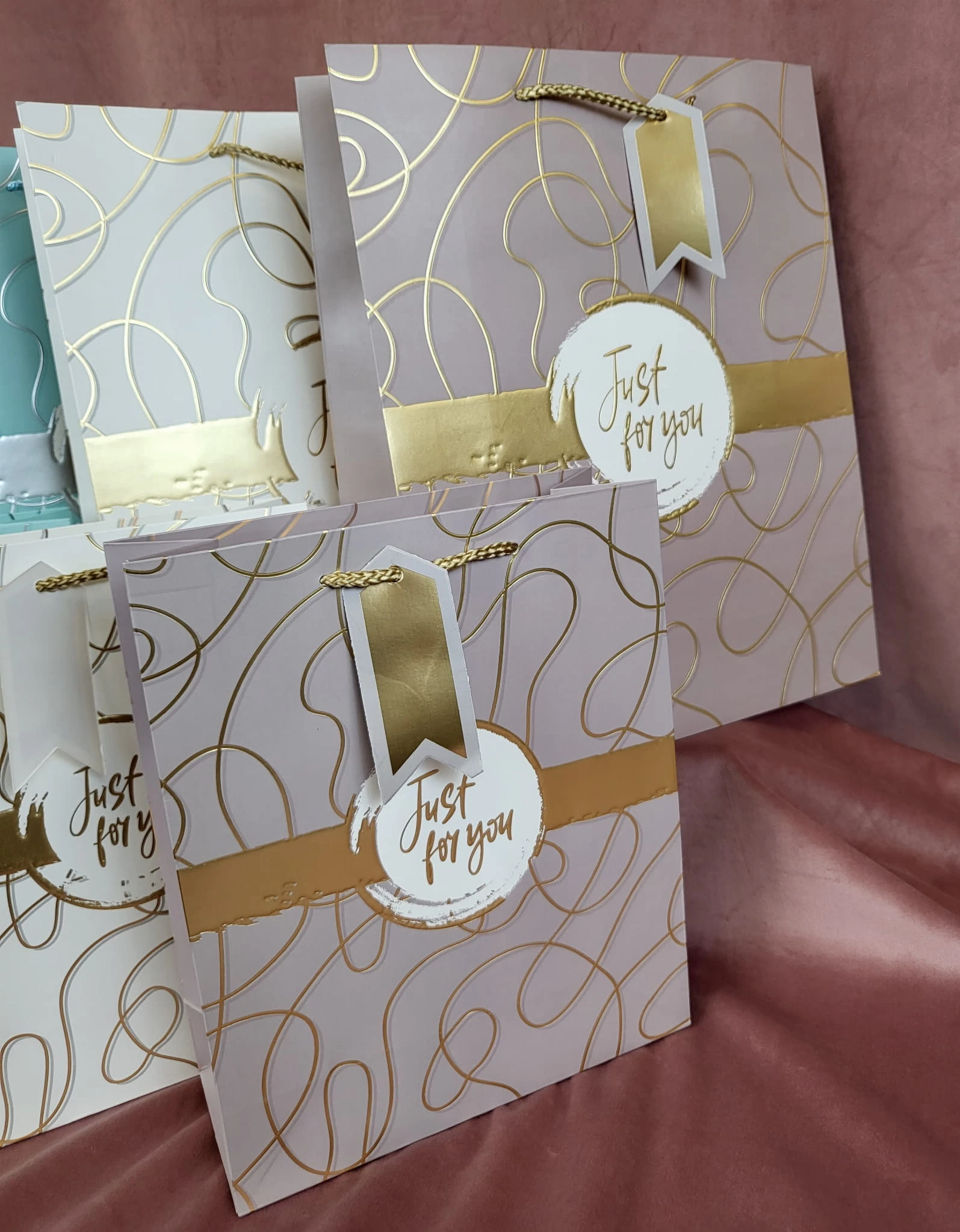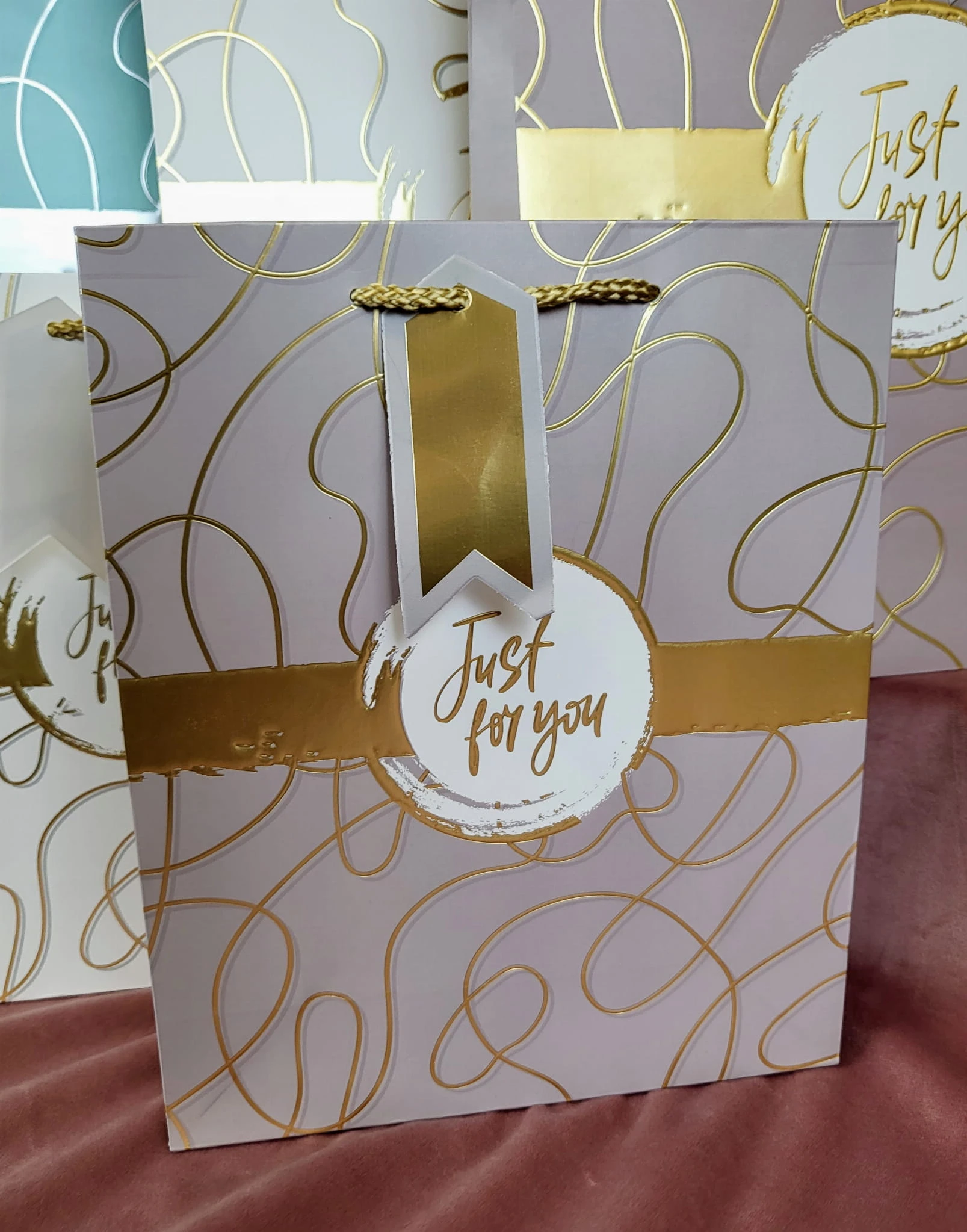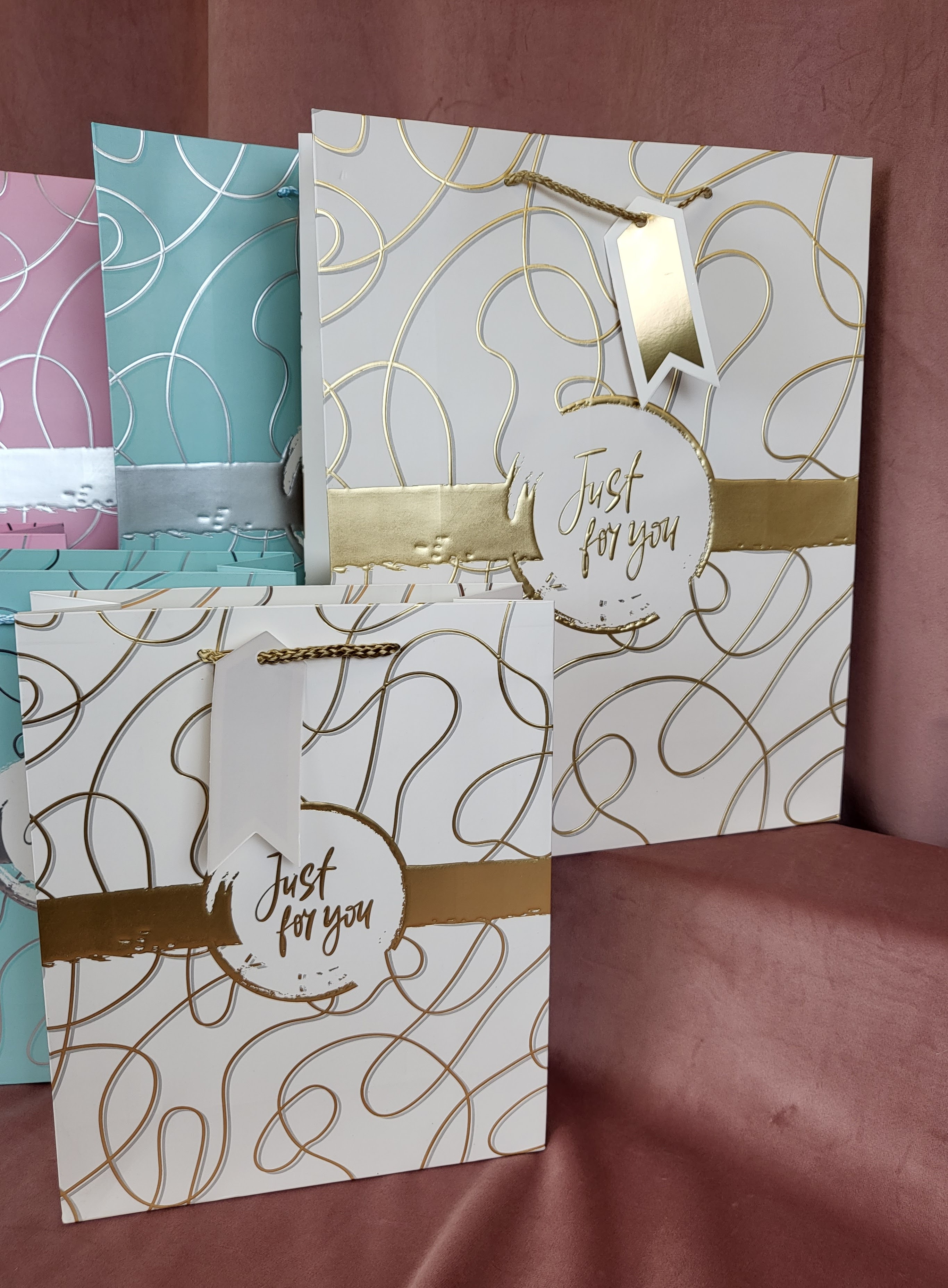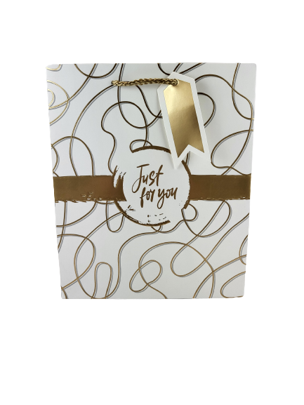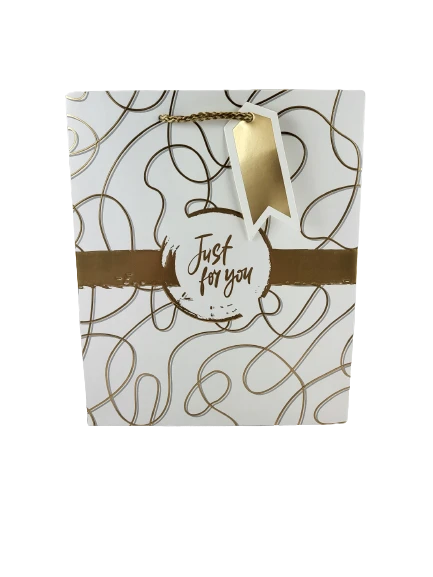 Elegancka torebka prezentowa z napisem JUST FOR YOU zdobiona delikatnymi tłoczeniami w kolorze złota. Wykonana z wysokiej jakości, grubego papieru. Uchwyty wykonane są z dopasowanego kolorystycznie sznurka.