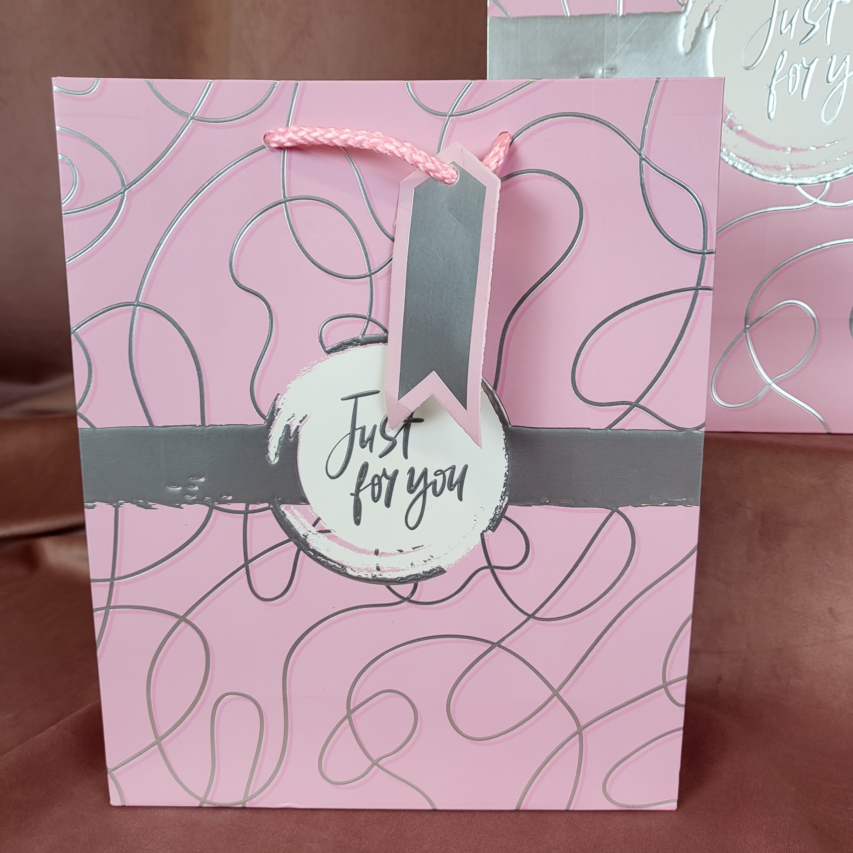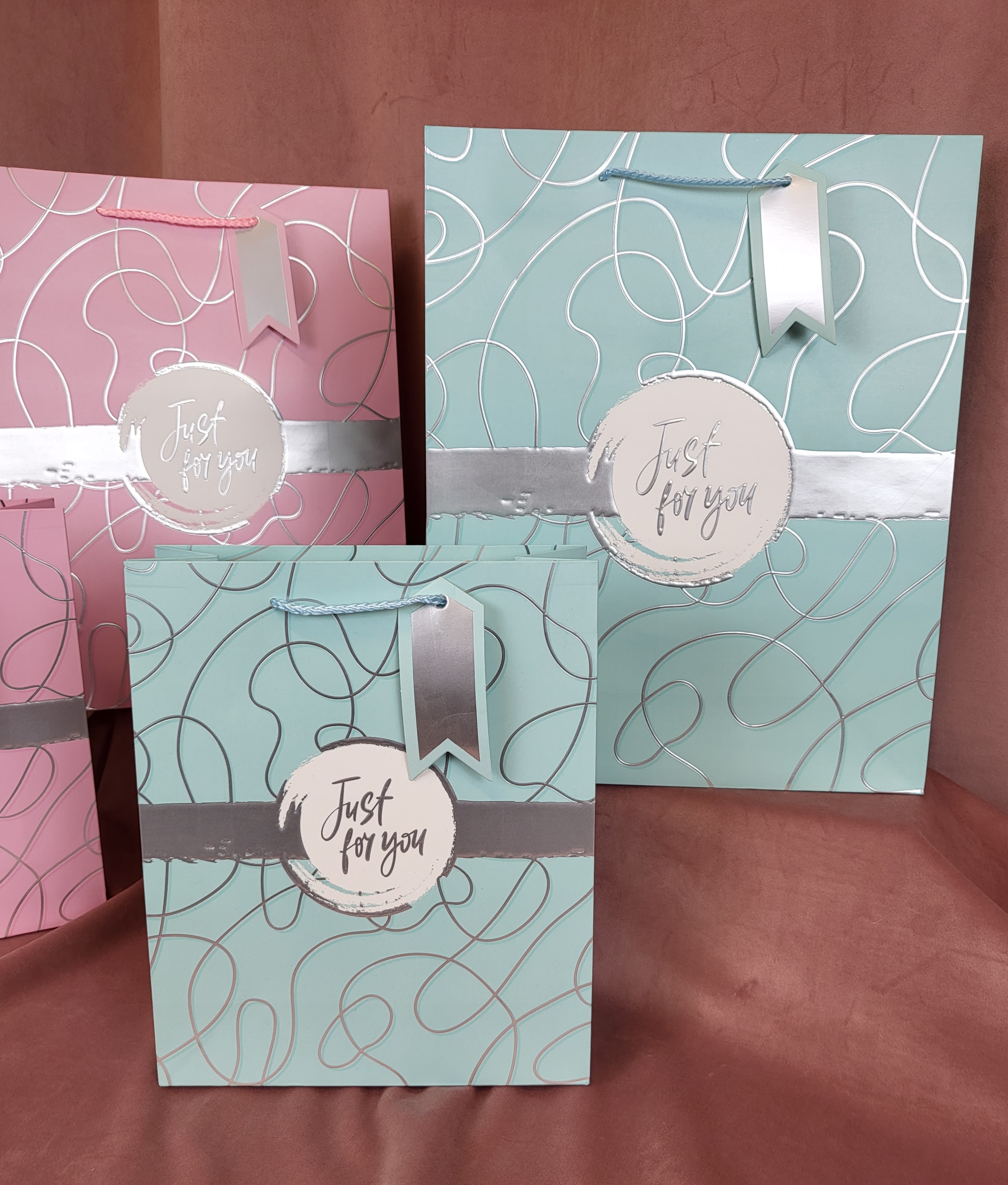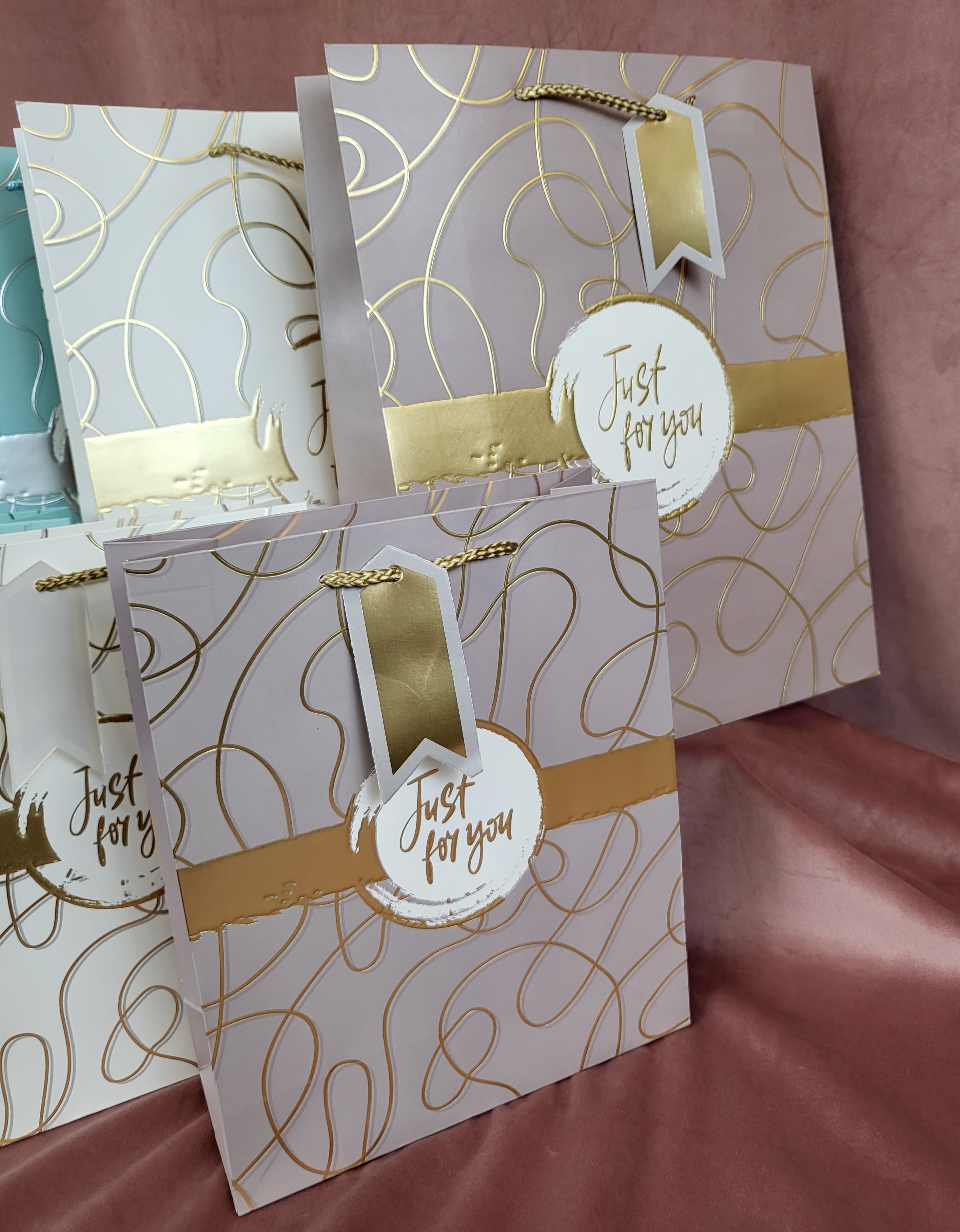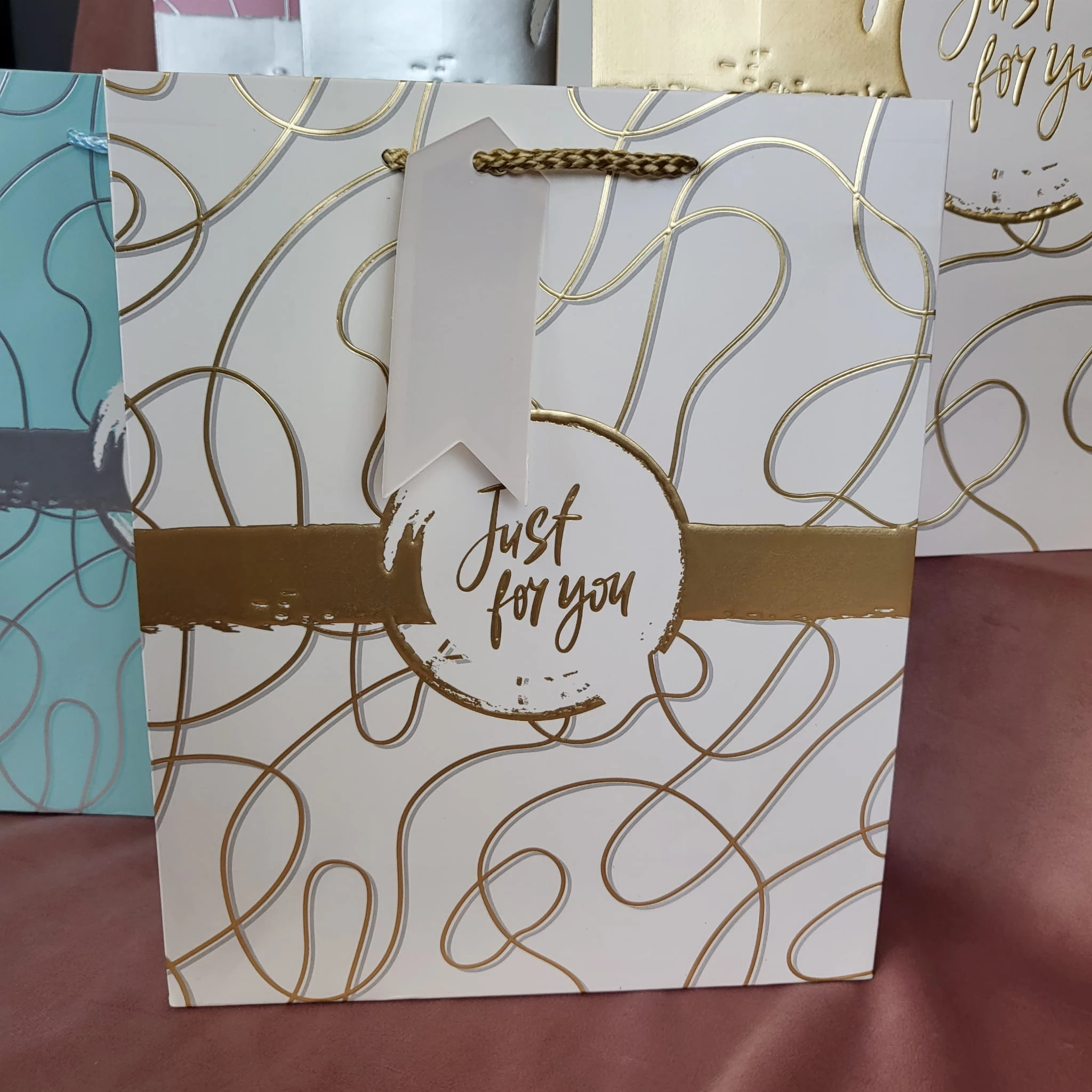 Elegancka torebka prezentowa z napisem JUST FOR YOU zdobiona delikatnymi tłoczeniami w kolorze złota. Wykonana z wysokiej jakości, grubego papieru. Uchwyty wykonane są z dopasowanego kolorystycznie sznurka.