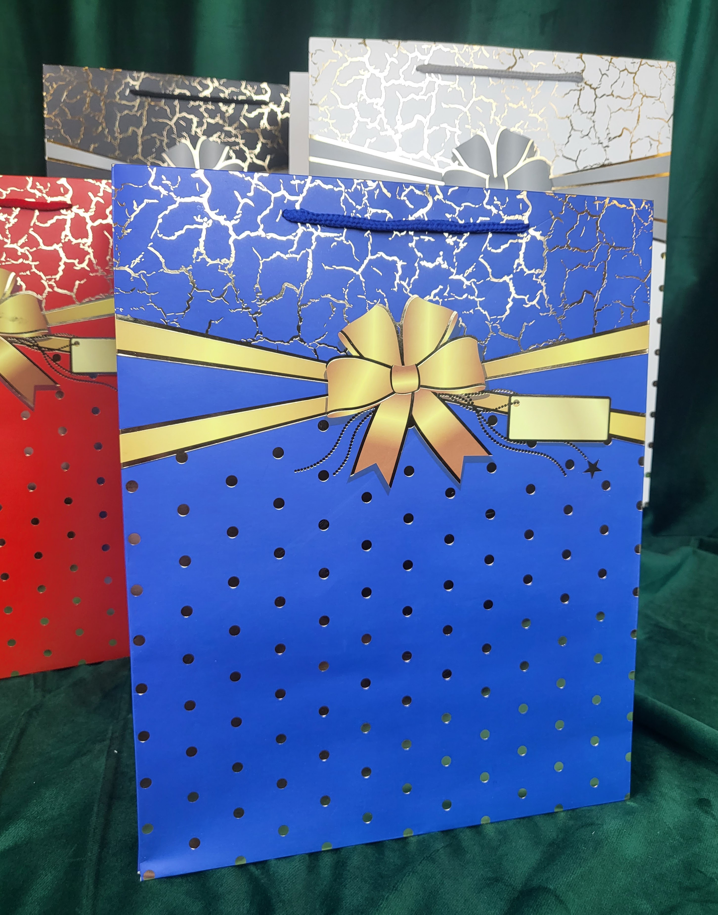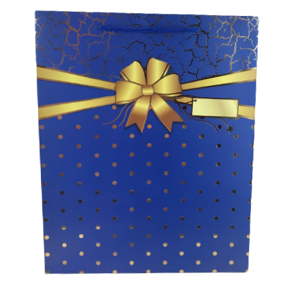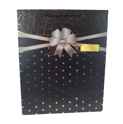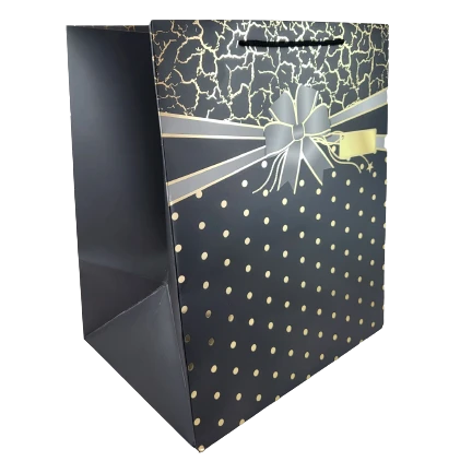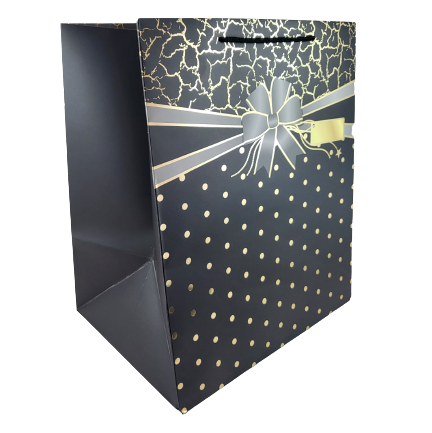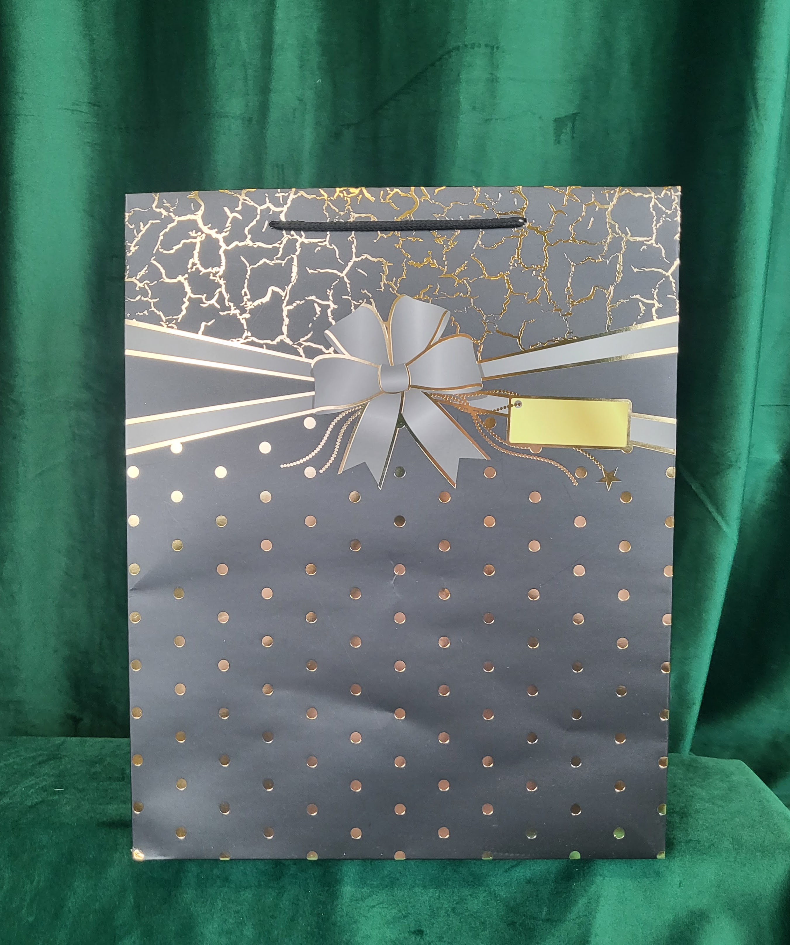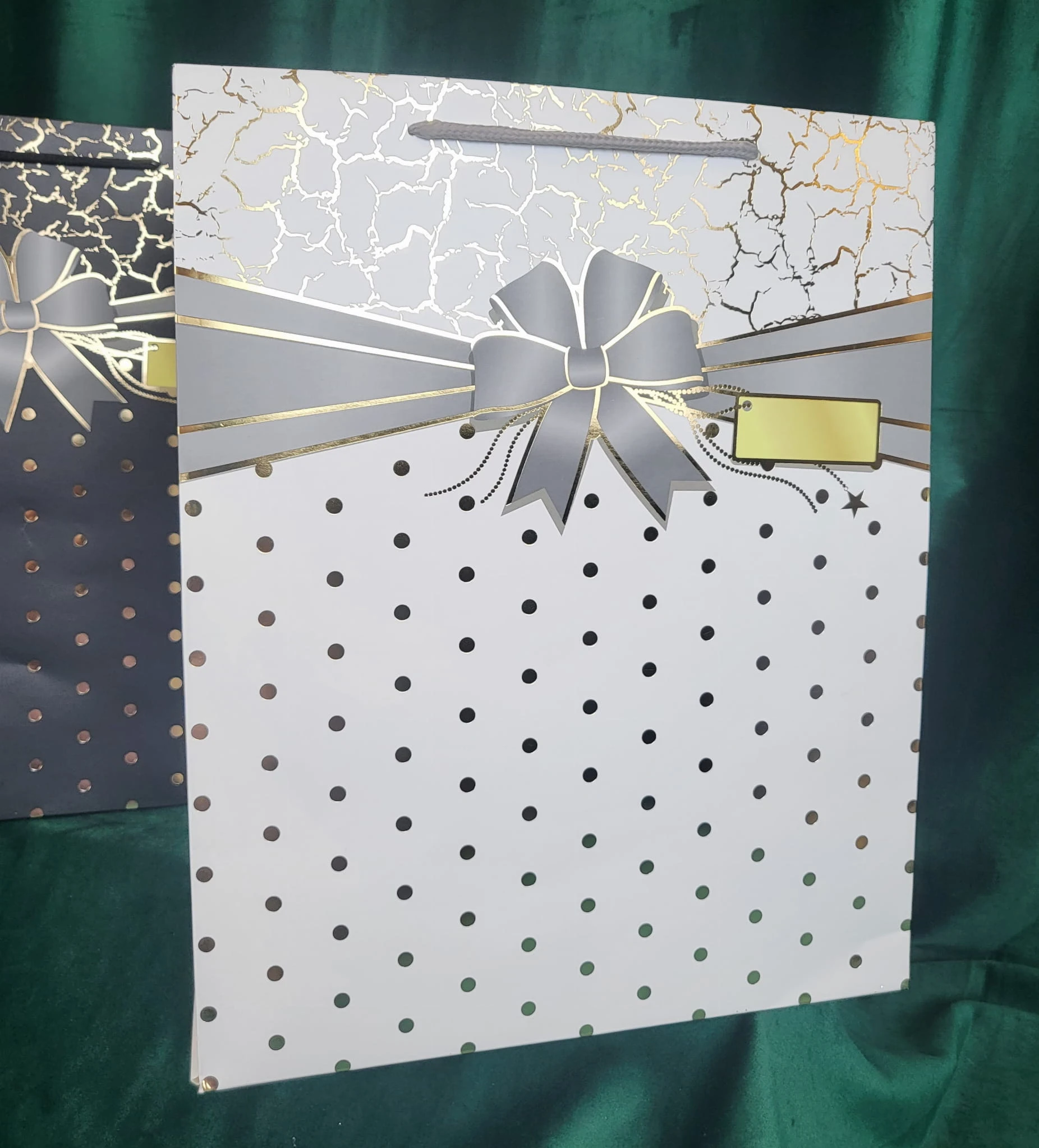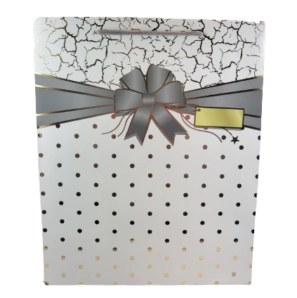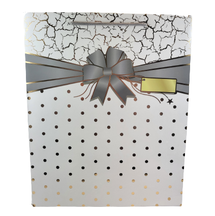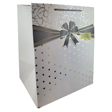 Elegancka torebka prezentowa zdobiona grafiką i wzorem delikatnie odbijającym światło. Wykonana z wysokiej jakości, grubego papieru. Uchwyty wykonane są z dopasowanej kolorystycznie wstążki.