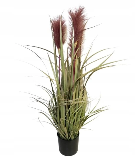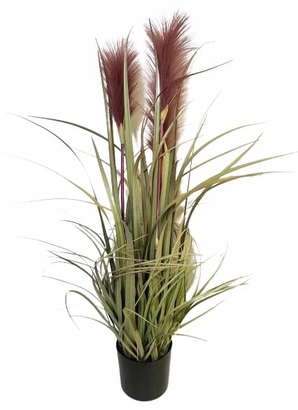 Dekoracyjna, sztuczna roślina z rodzaju traw ozdobnych kwitnących, kolorystyka – odcienie zieleni z różowymi kwiatami.