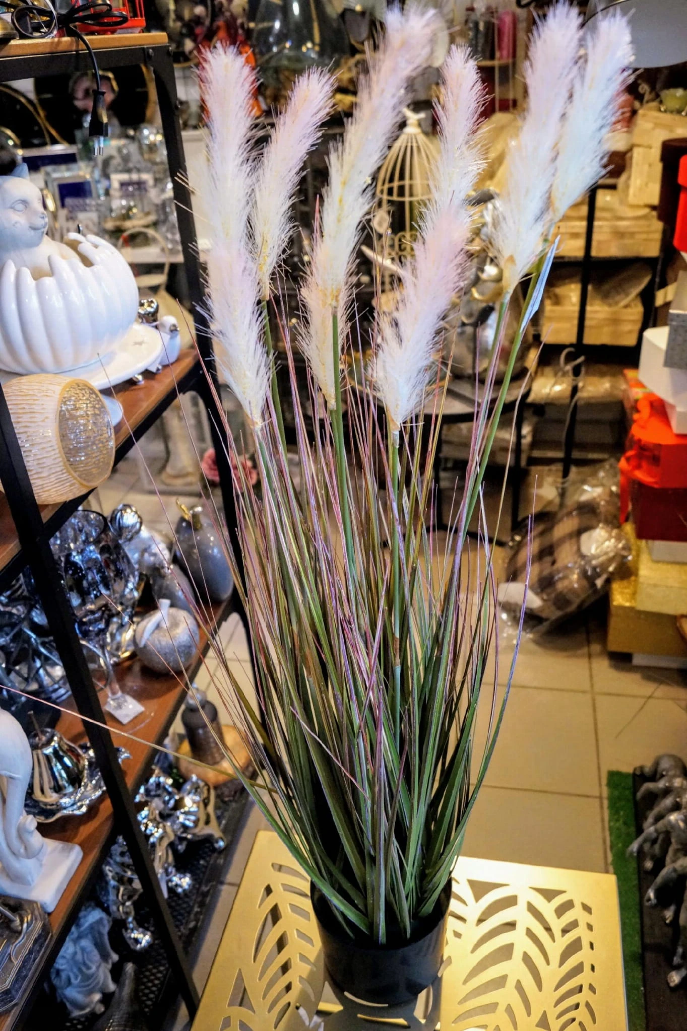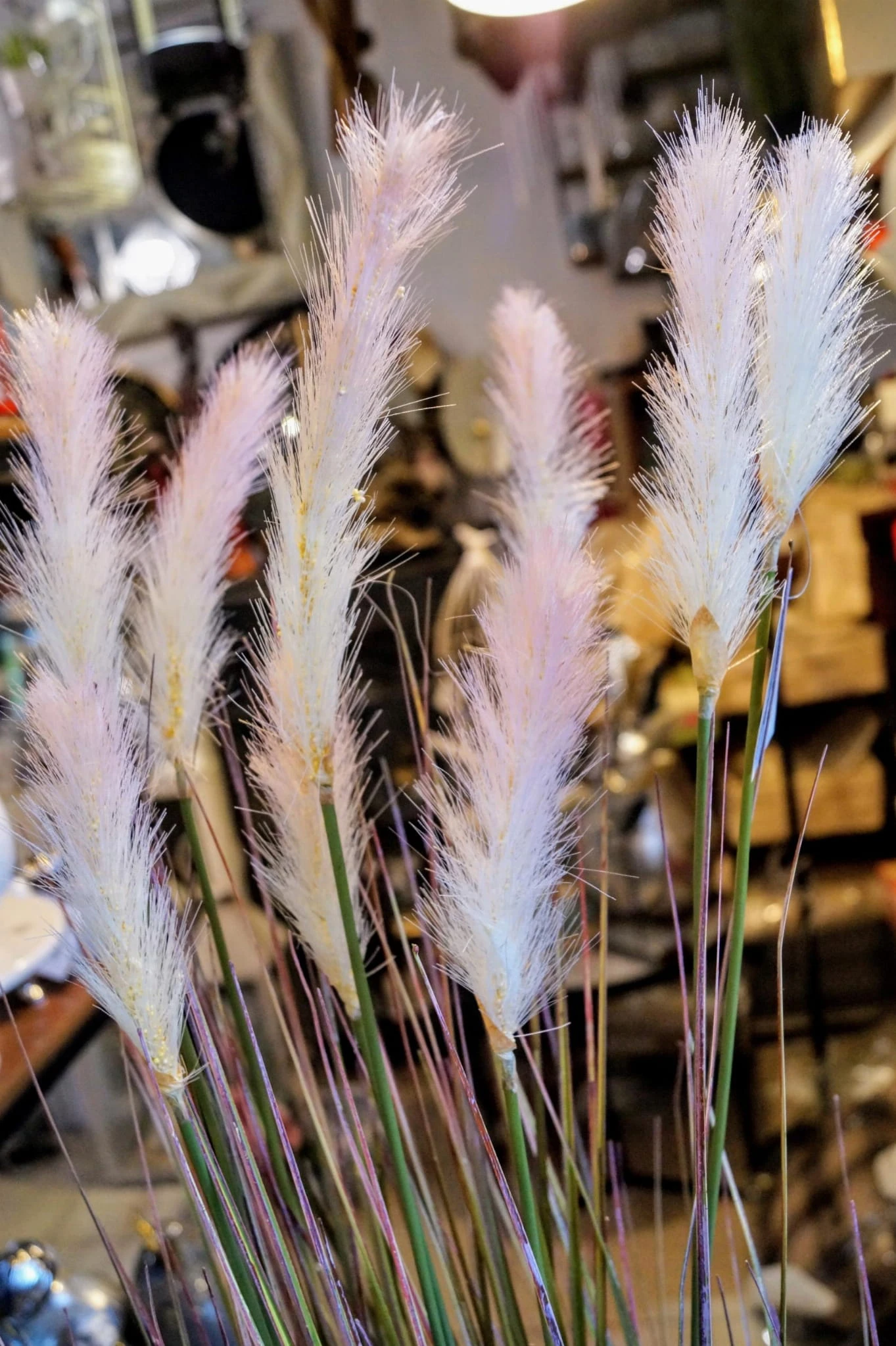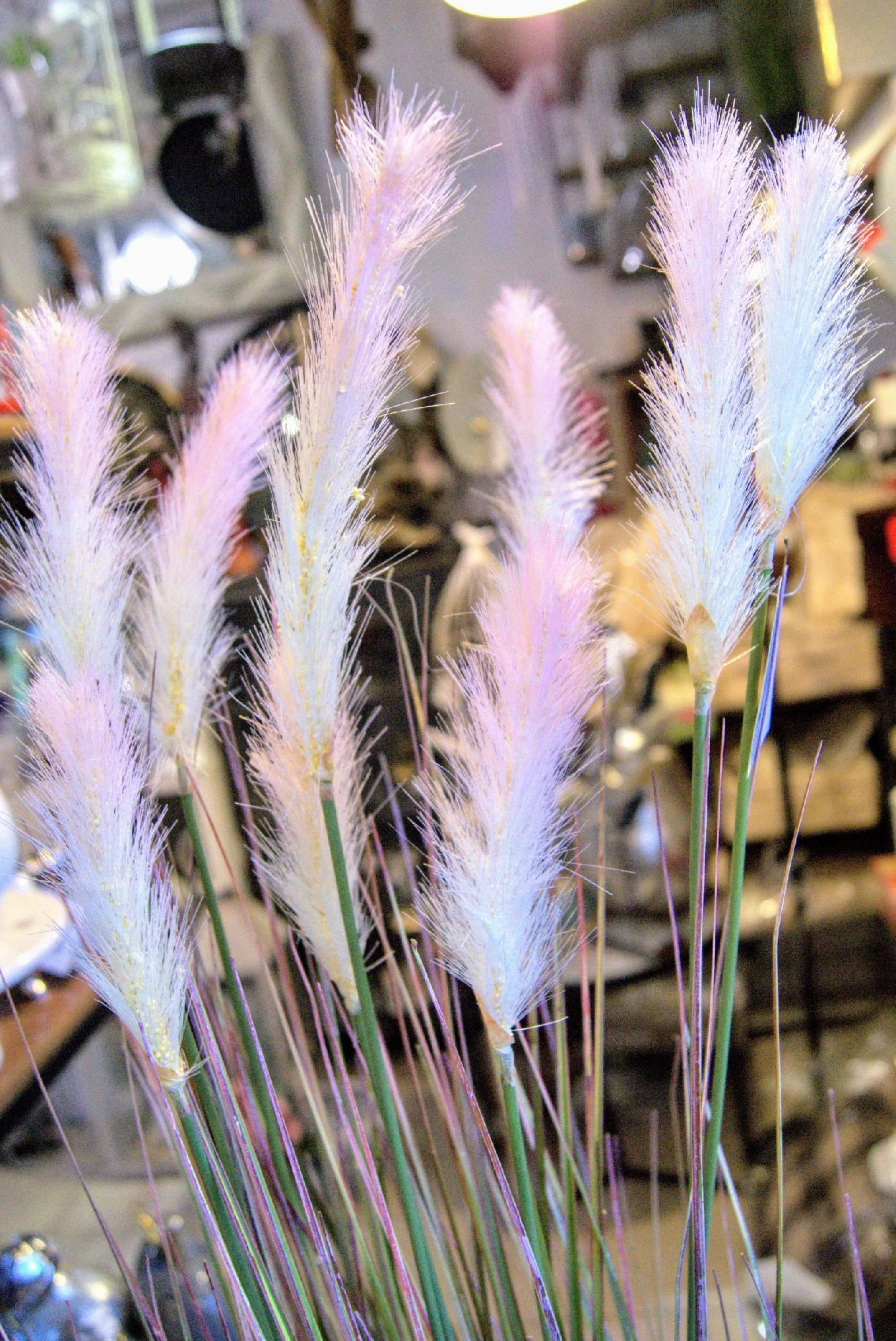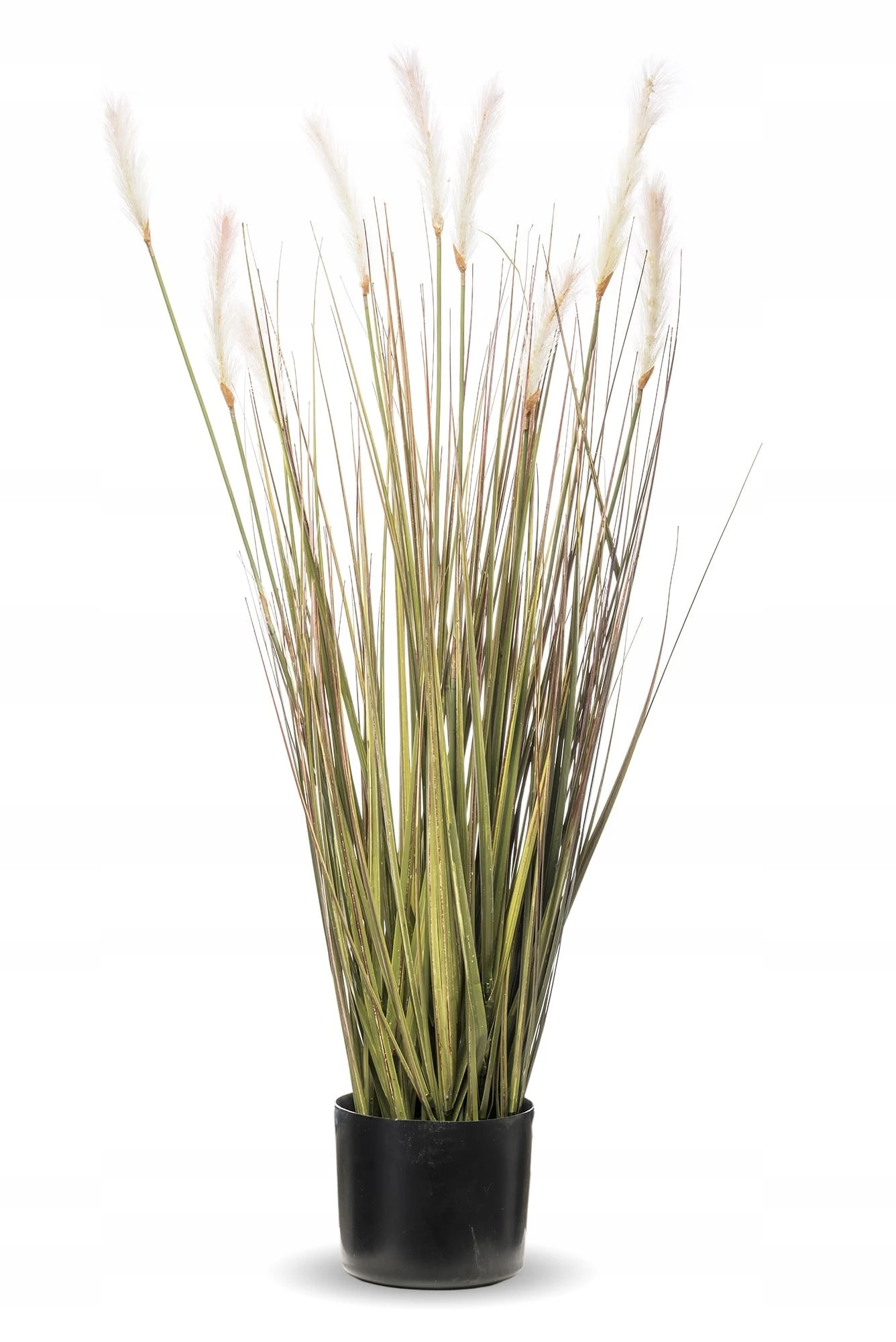 Dekoracyjna, sztuczna roślina z rodzaju traw ozdobnych kwitnących, kolorystyka – odcienie zieleni z białymi kwiatami.