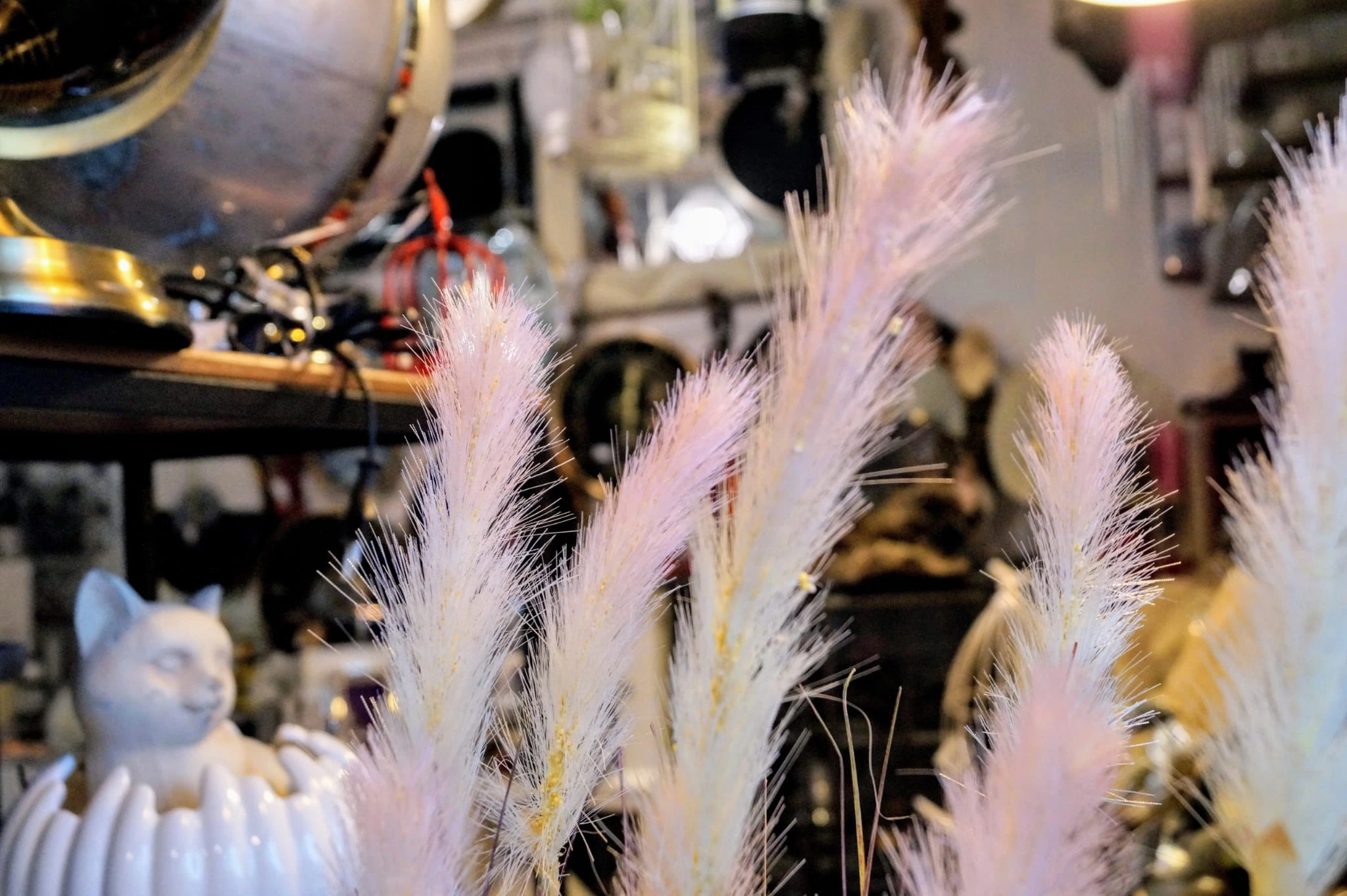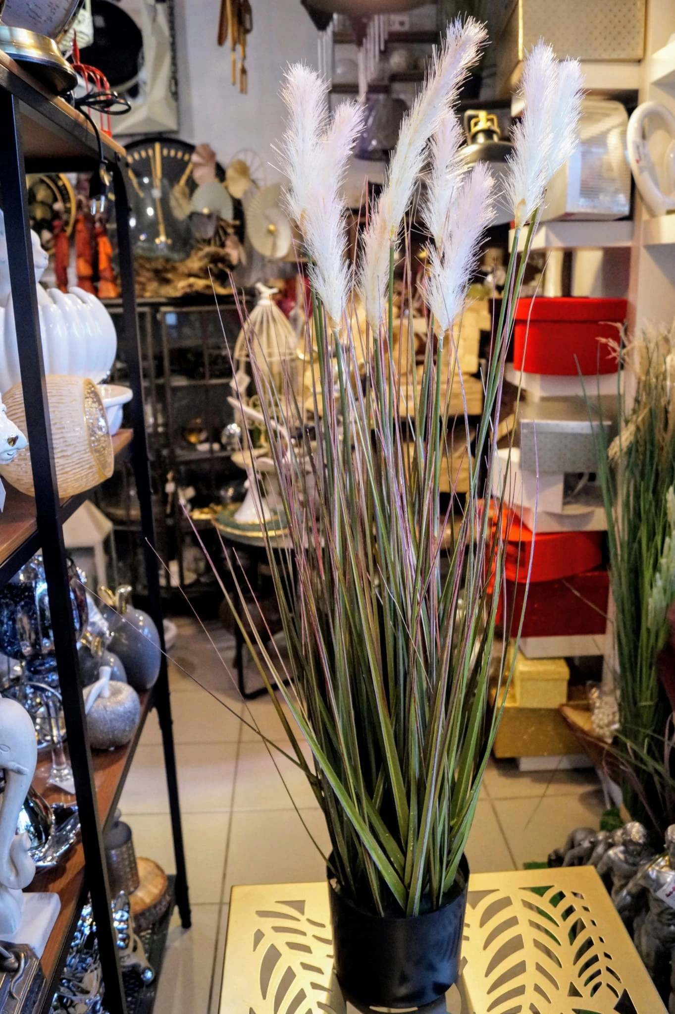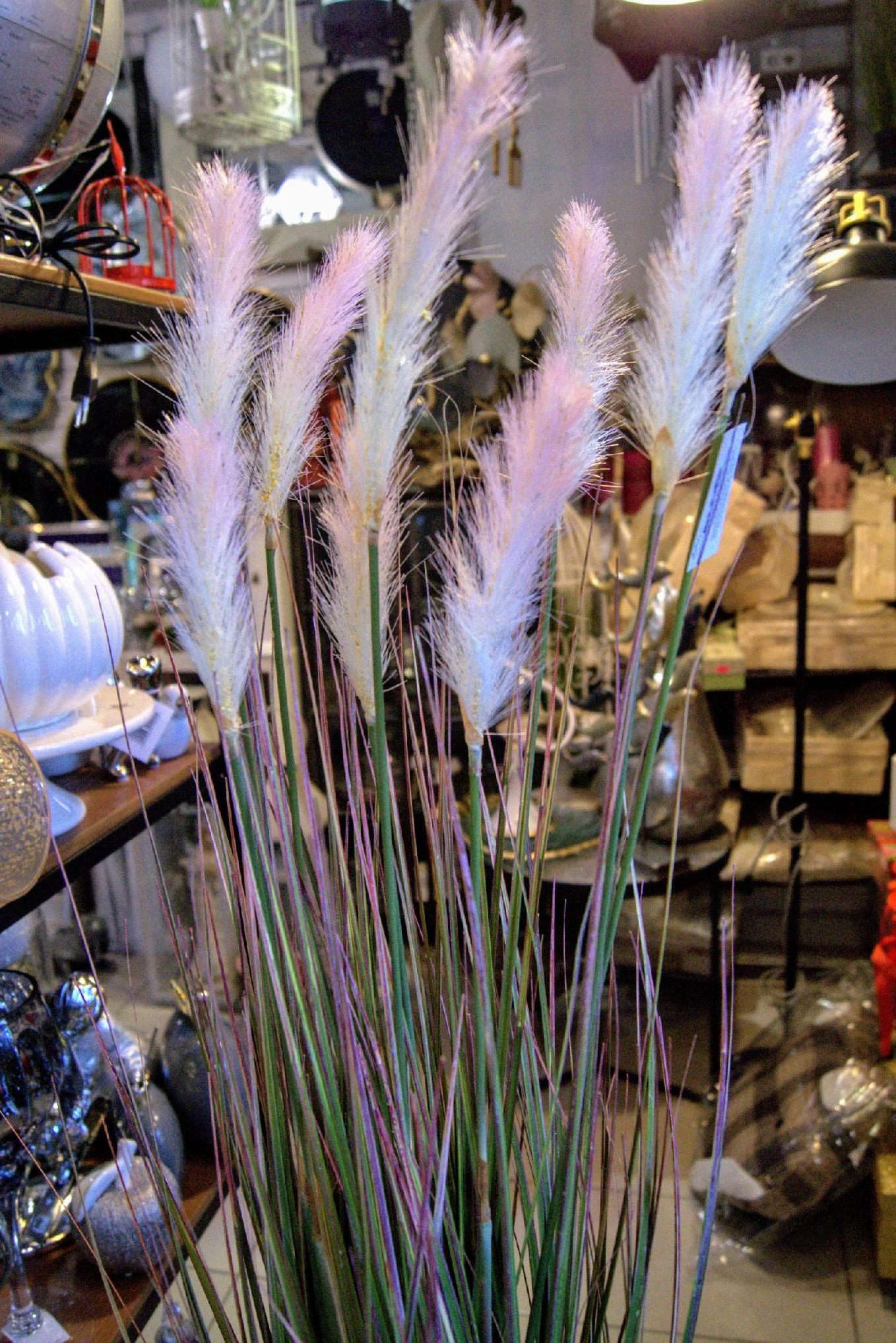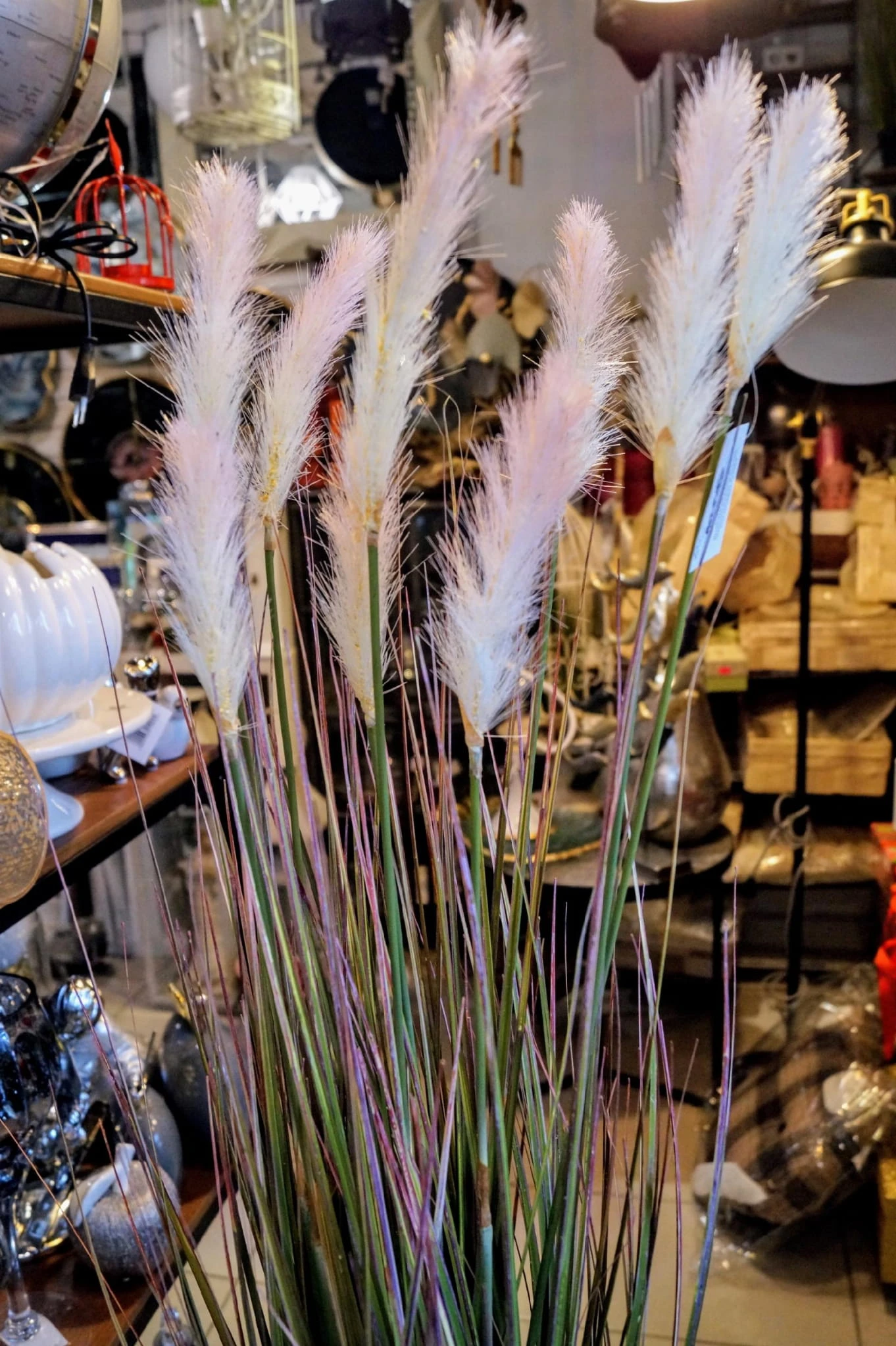 Dekoracyjna, sztuczna roślina z rodzaju traw ozdobnych kwitnących, kolorystyka – odcienie zieleni z białymi kwiatami.