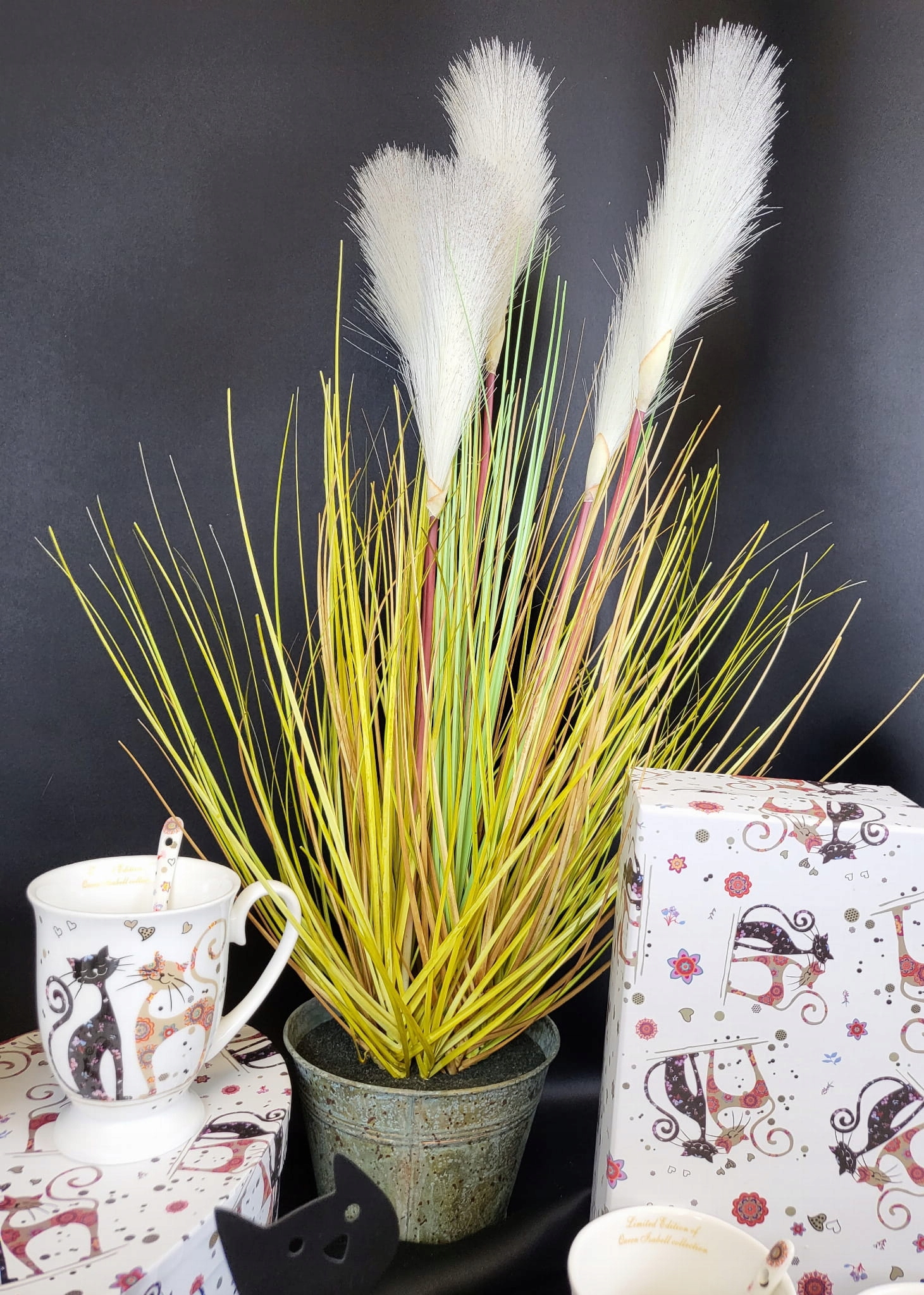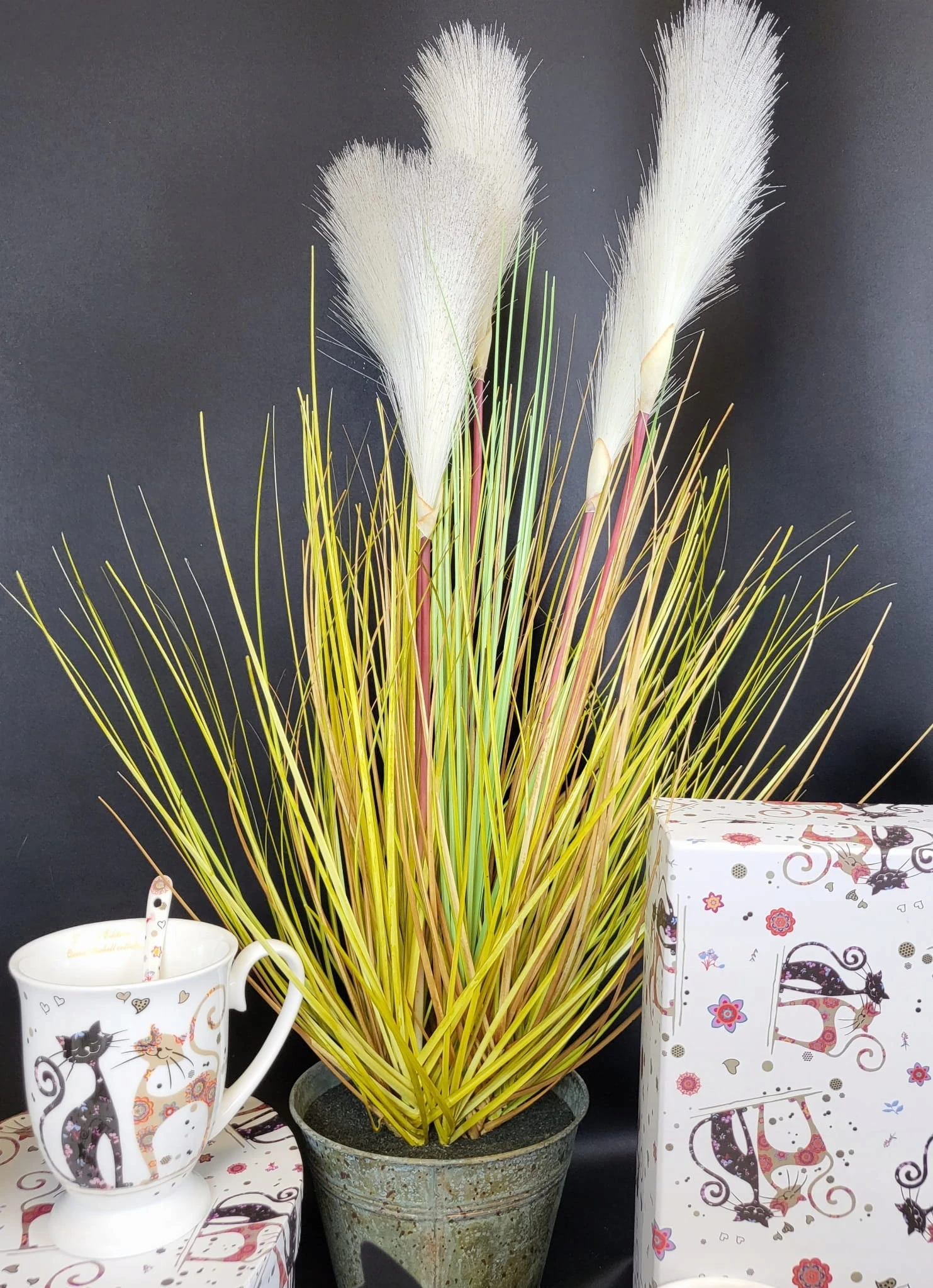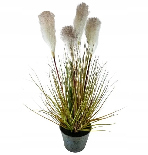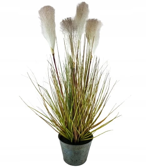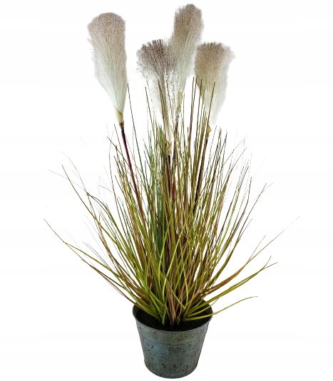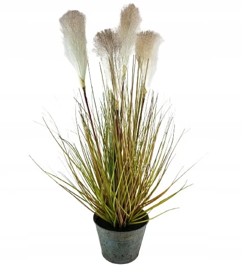 Duża trawa ozdobna z włochatymi pałkami, w metalowej doniczce. Dekoracyjna, sztuczna roślina z rodzaju traw ozdobnych kwitnących. Nadaje się do użytku wewnątrz budynków lub pod zadaszeniem.