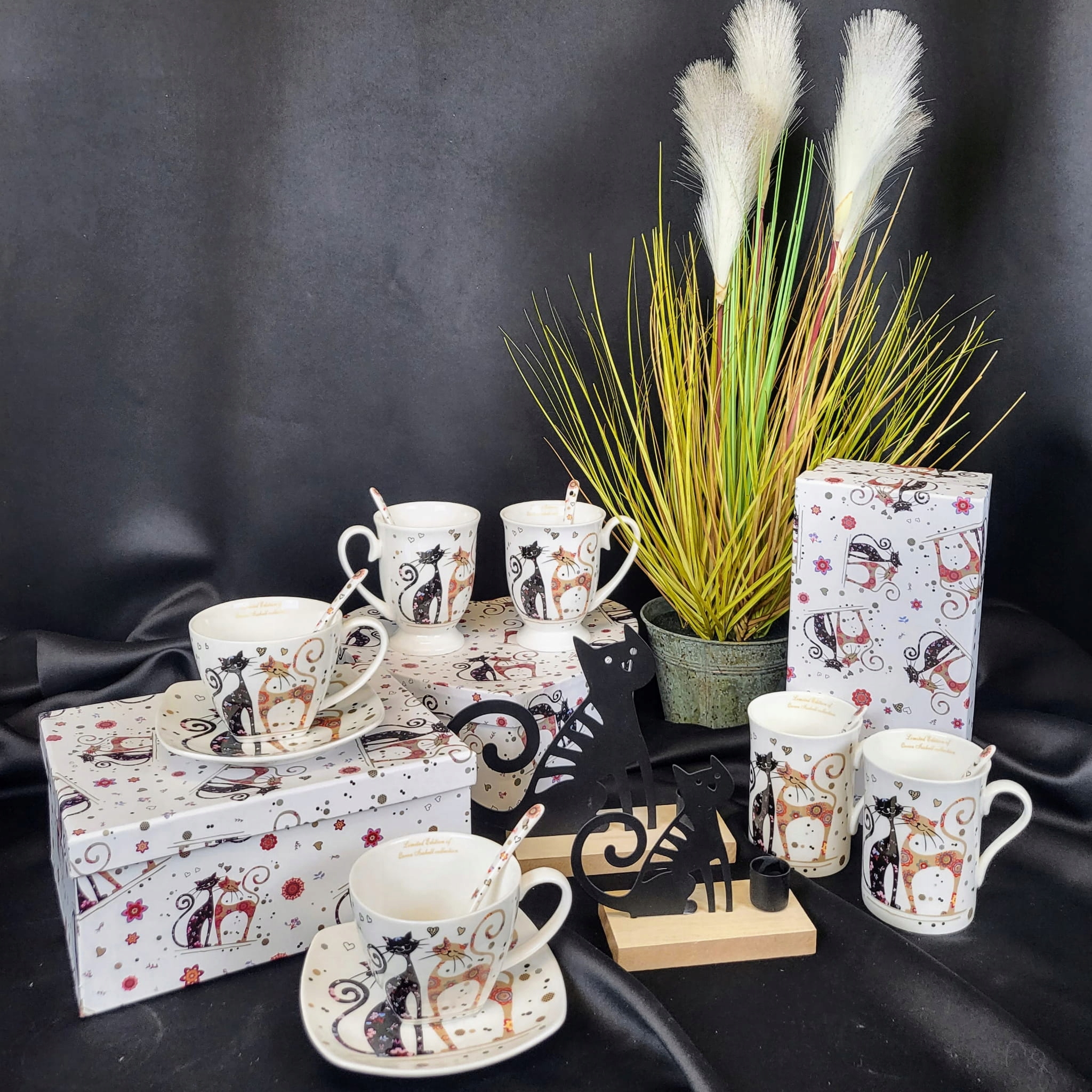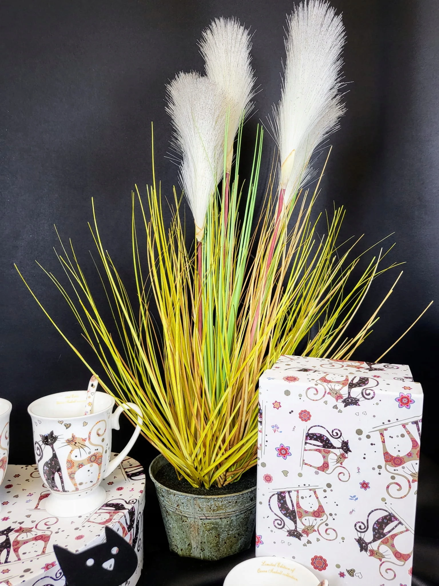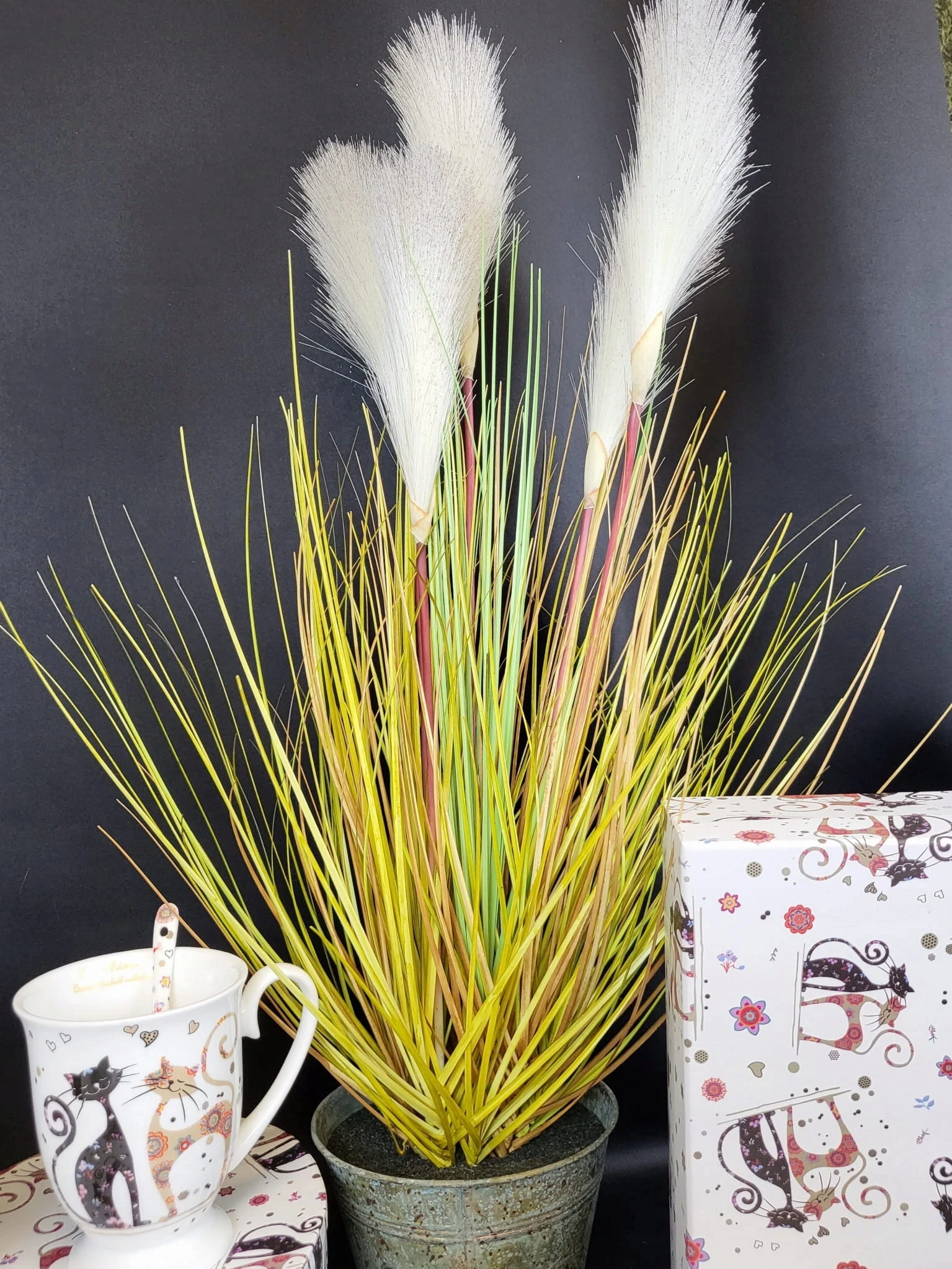 Duża trawa ozdobna z włochatymi pałkami, w metalowej doniczce. Dekoracyjna, sztuczna roślina z rodzaju traw ozdobnych kwitnących. Nadaje się do użytku wewnątrz budynków lub pod zadaszeniem.