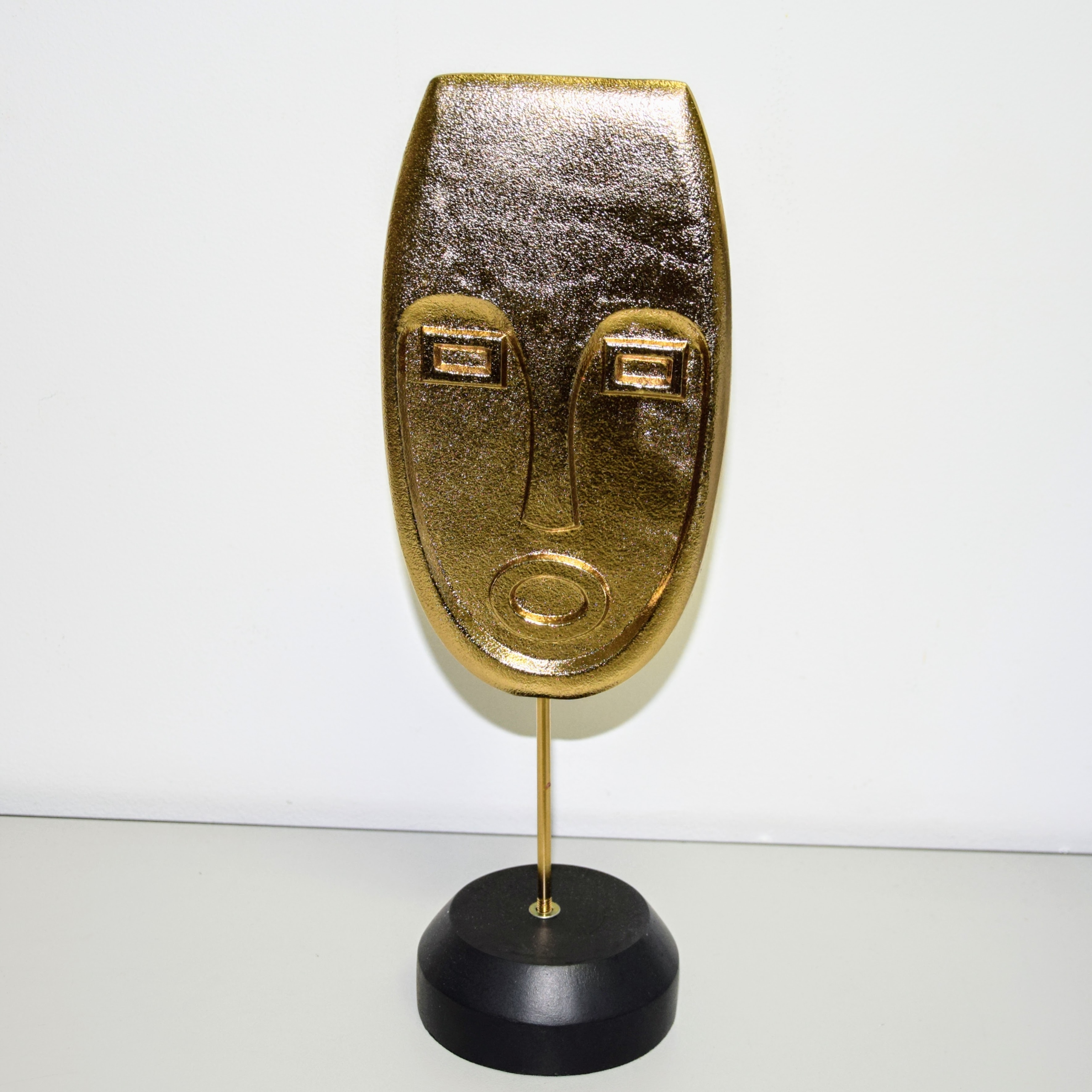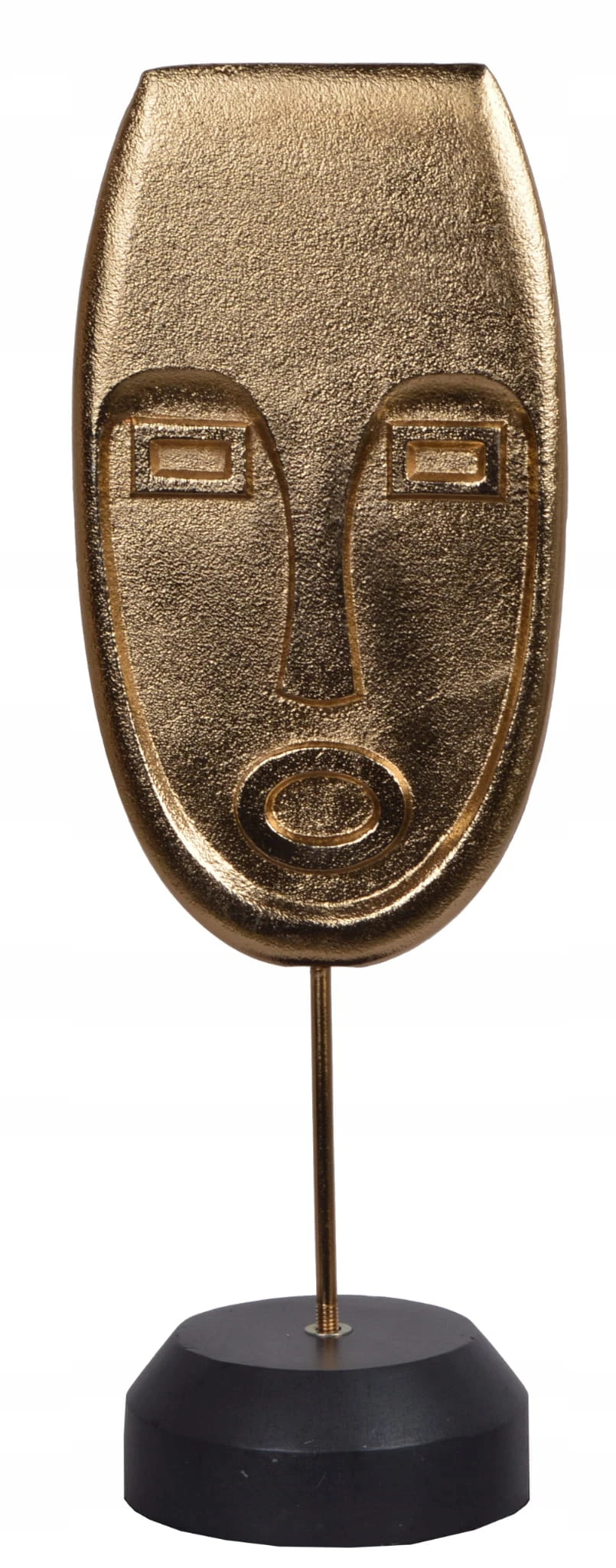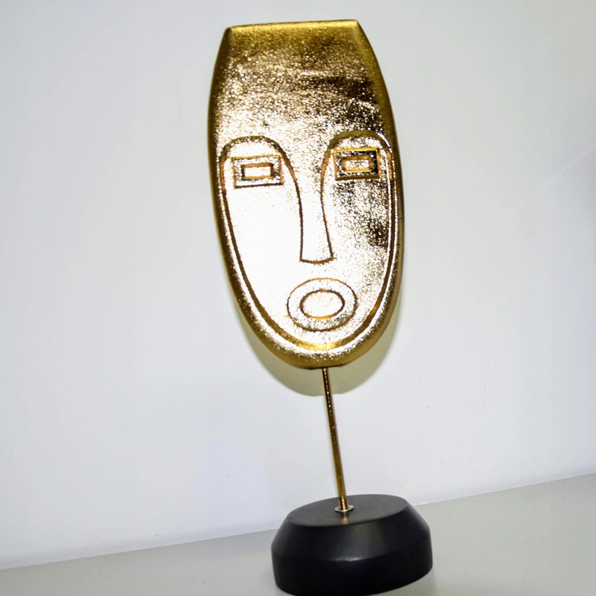 Dekoracja w kształcie TWARZY, w złotym kolorze, na czarnym stojaku.