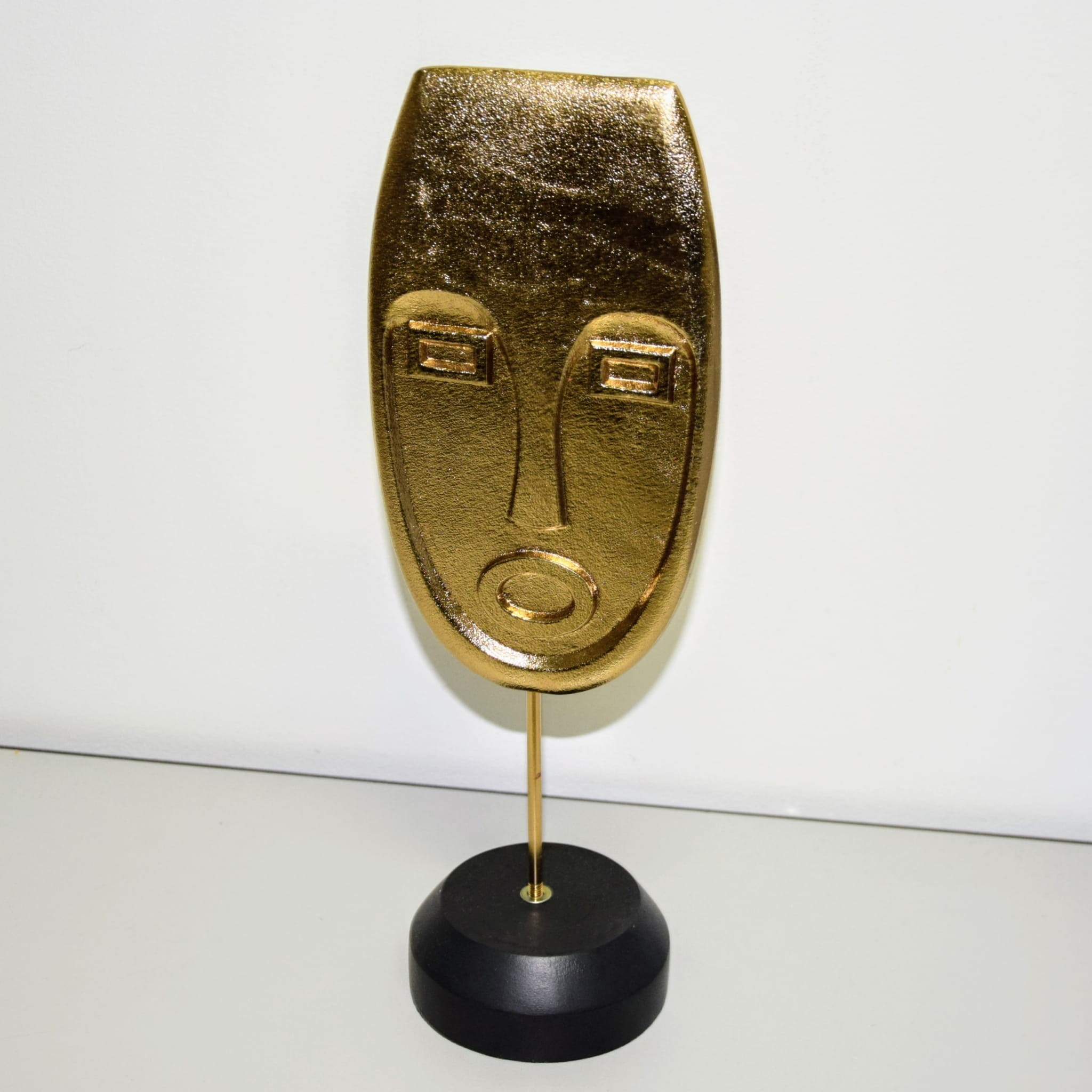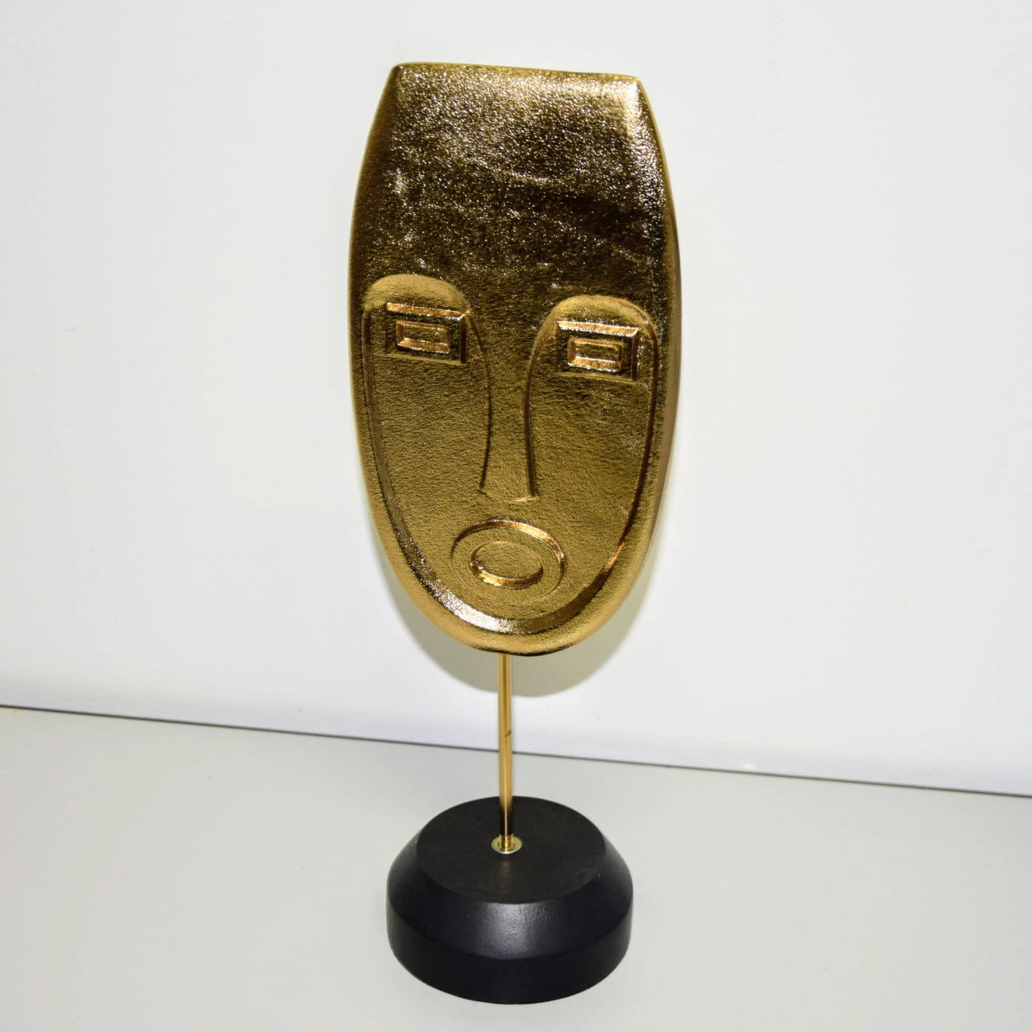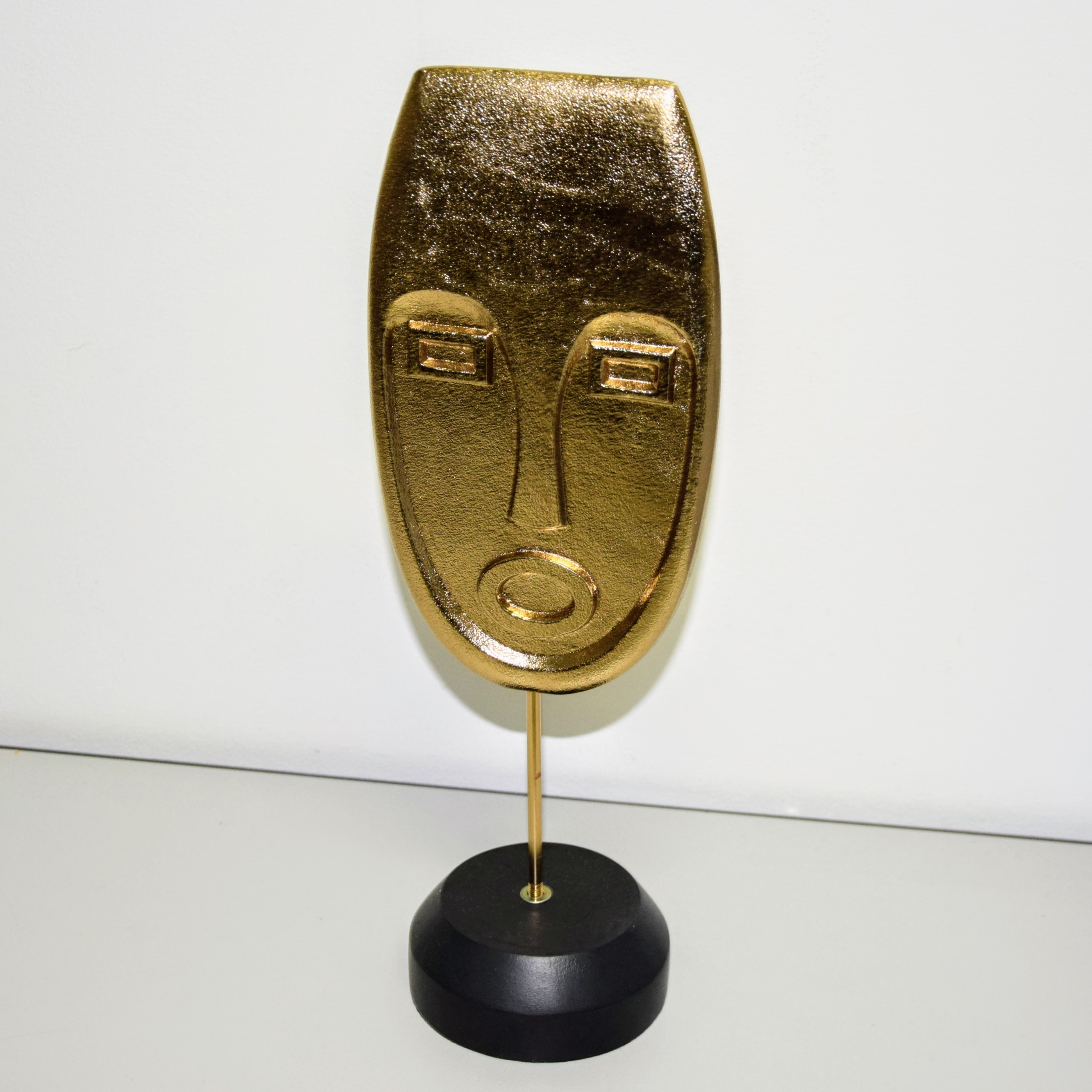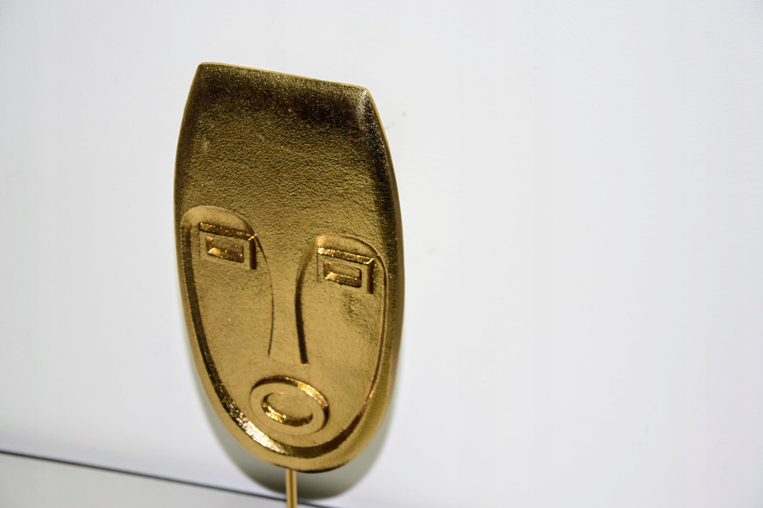 Dekoracja w kształcie TWARZY, w złotym kolorze, na czarnym stojaku.
