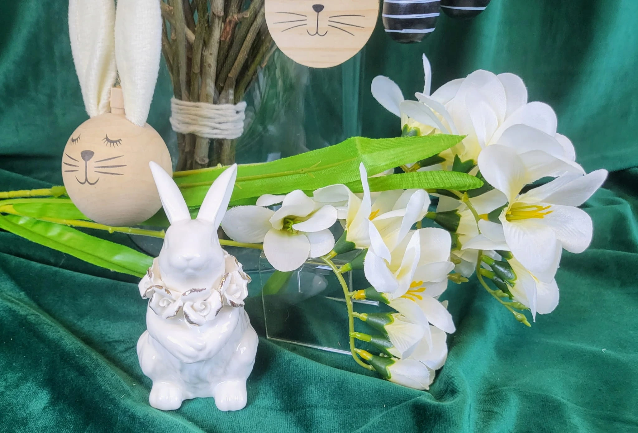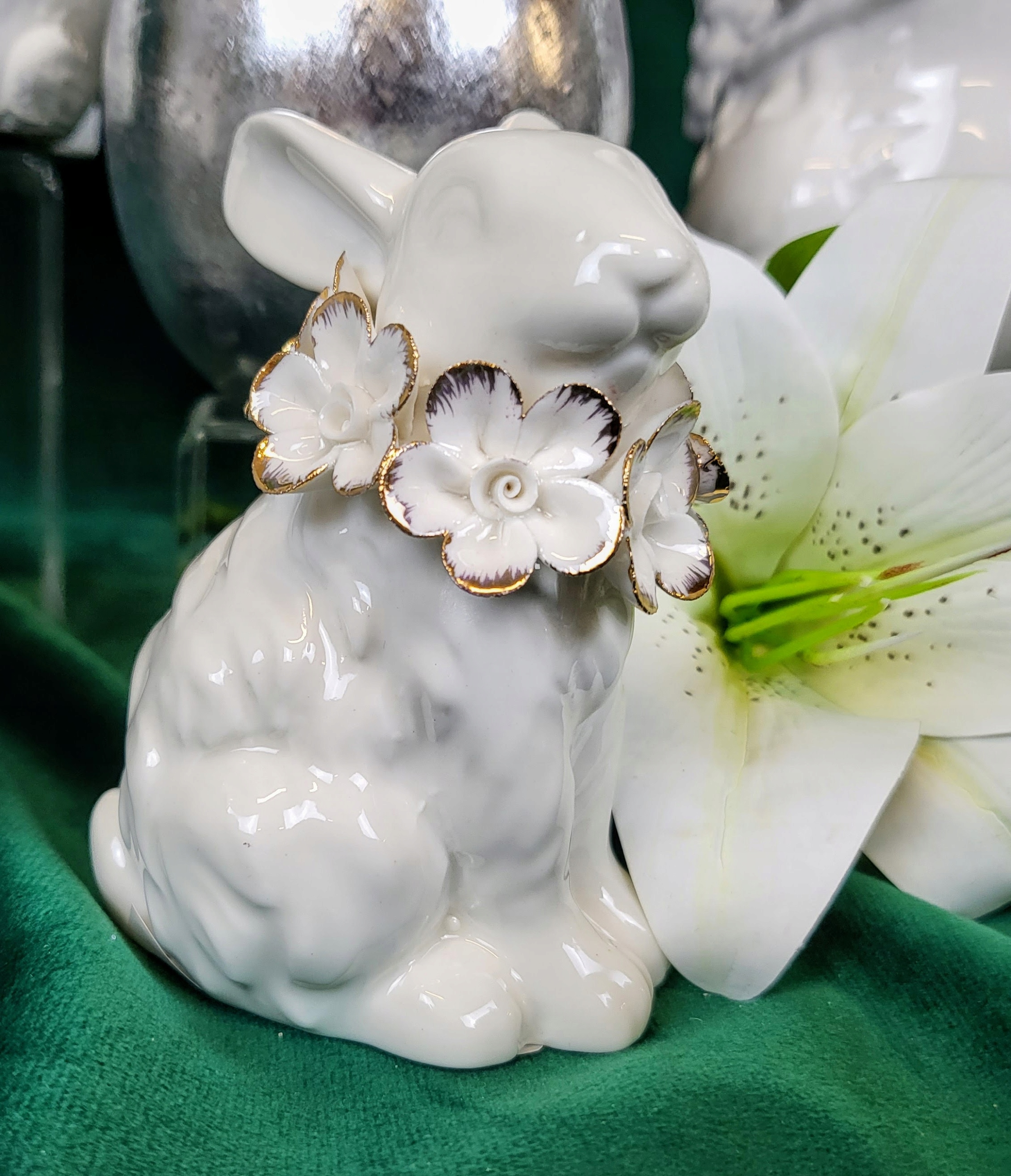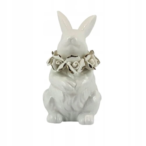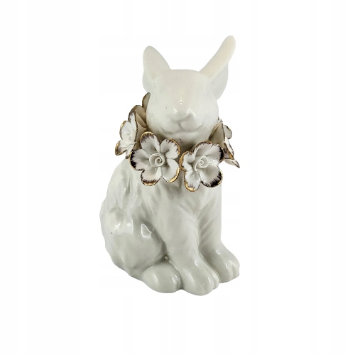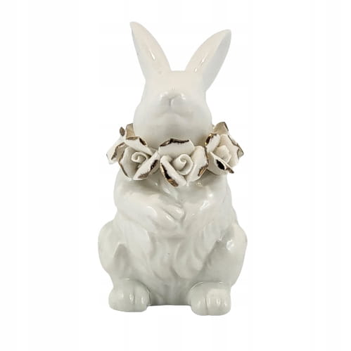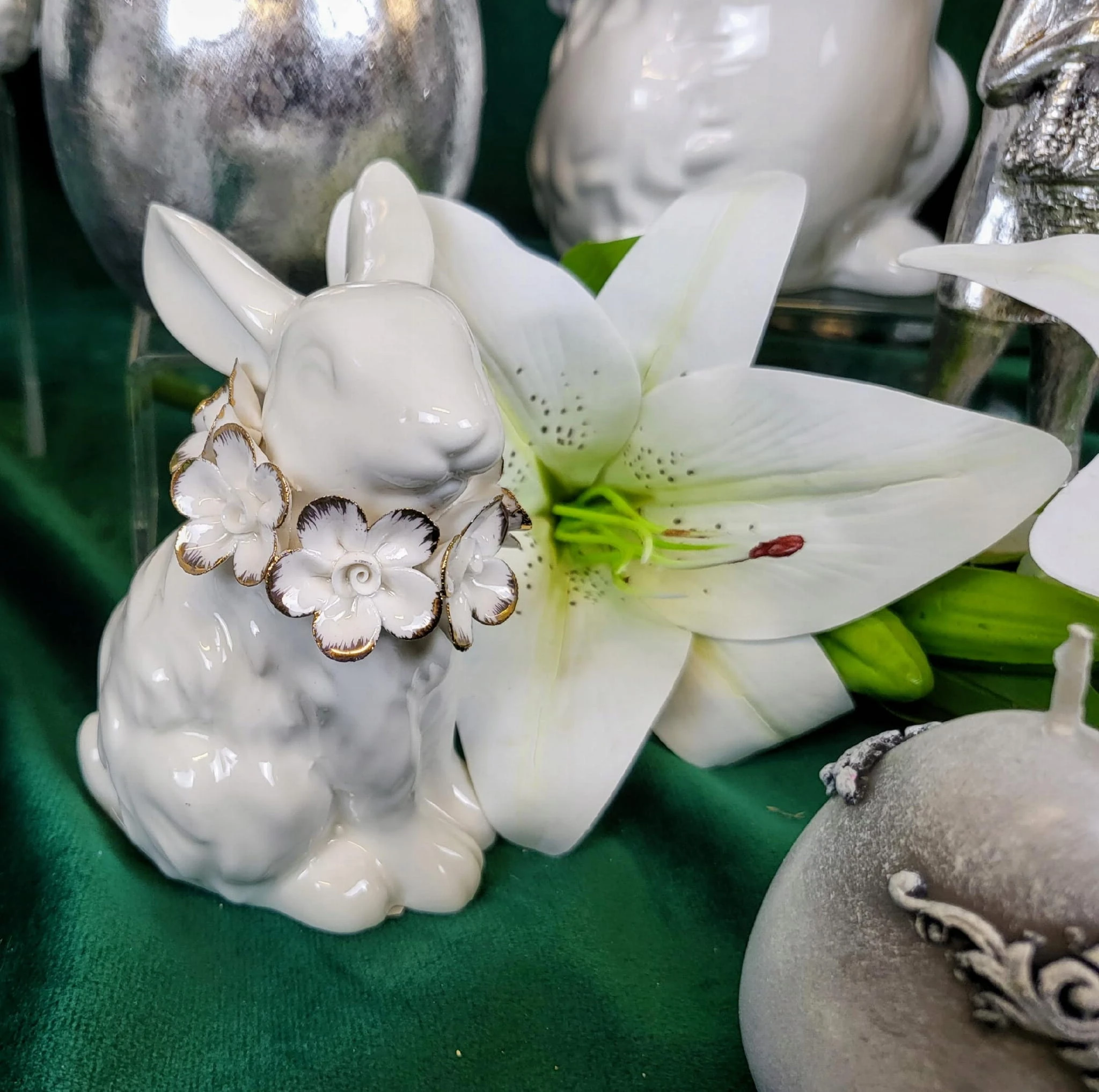 Wielkanocna jak i wiosenna porcelanowa figurka, przedstawia białego króliczka z kwiatami wokół szyi. Wykonana z dbałością o szczegół, wkomponuje się w każdy rodzaj wnętrza.