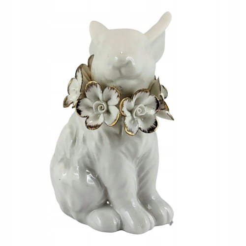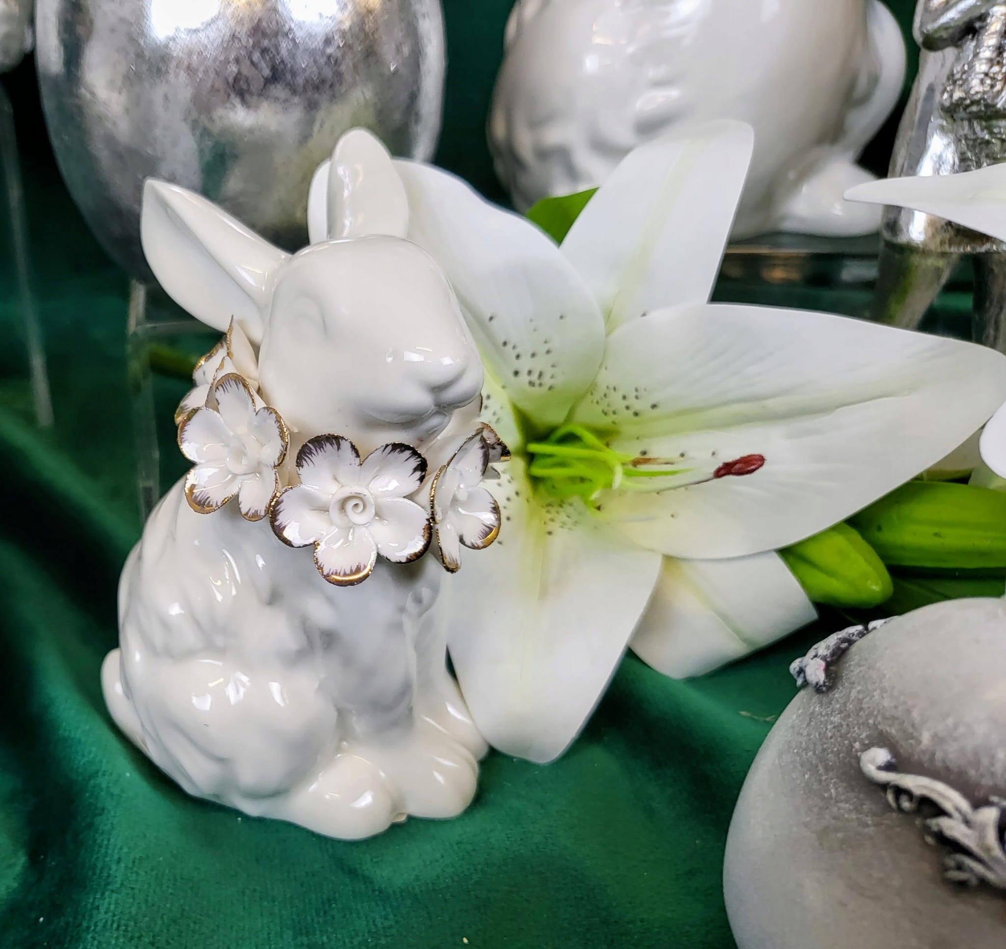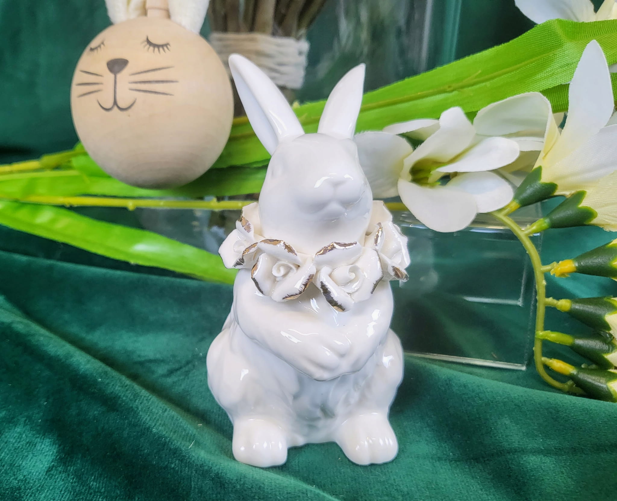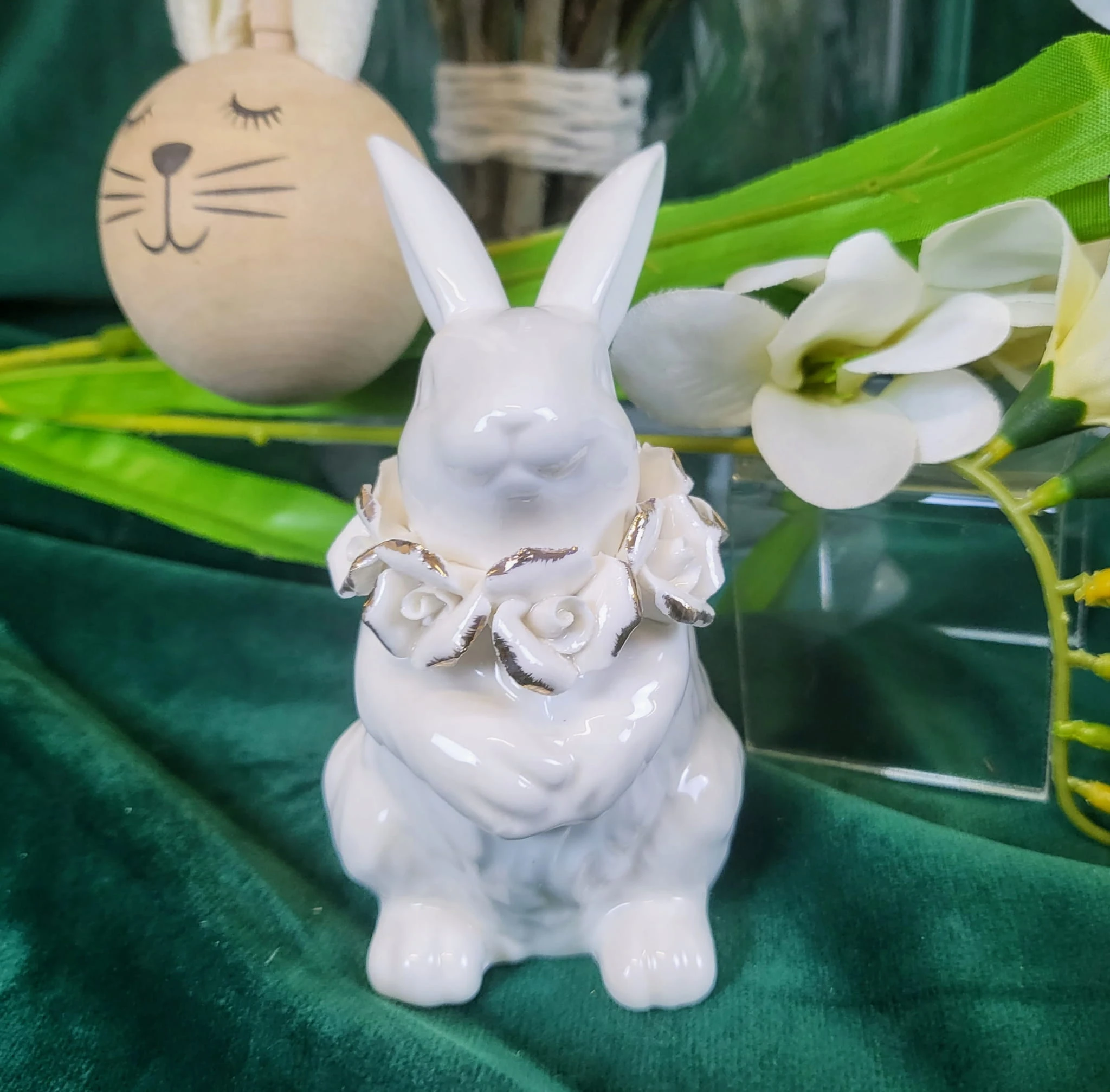 Wielkanocna jak i wiosenna porcelanowa figurka, przedstawia białego króliczka z kwiatami wokół szyi. Wykonana z dbałością o szczegół, wkomponuje się w każdy rodzaj wnętrza.