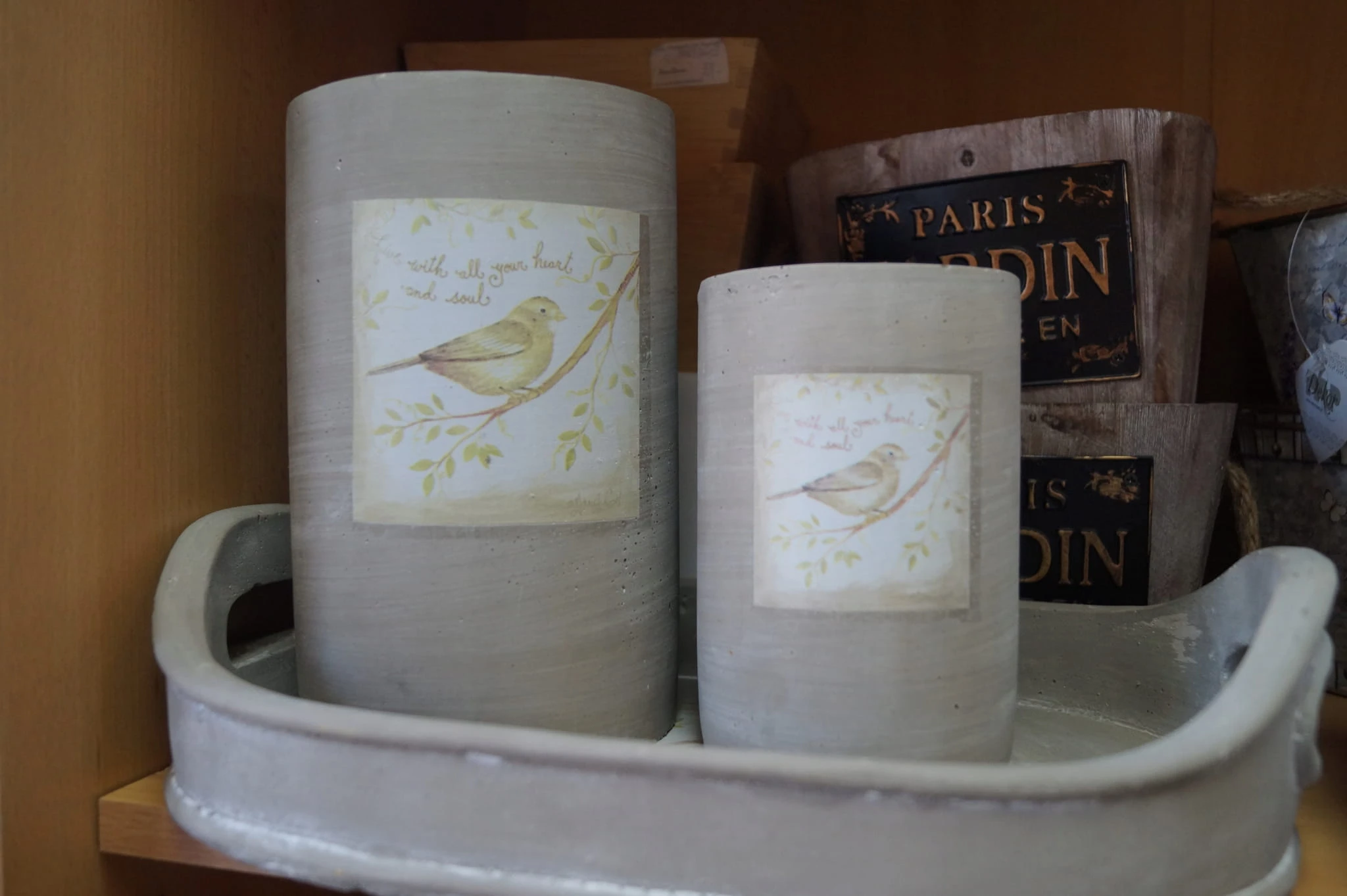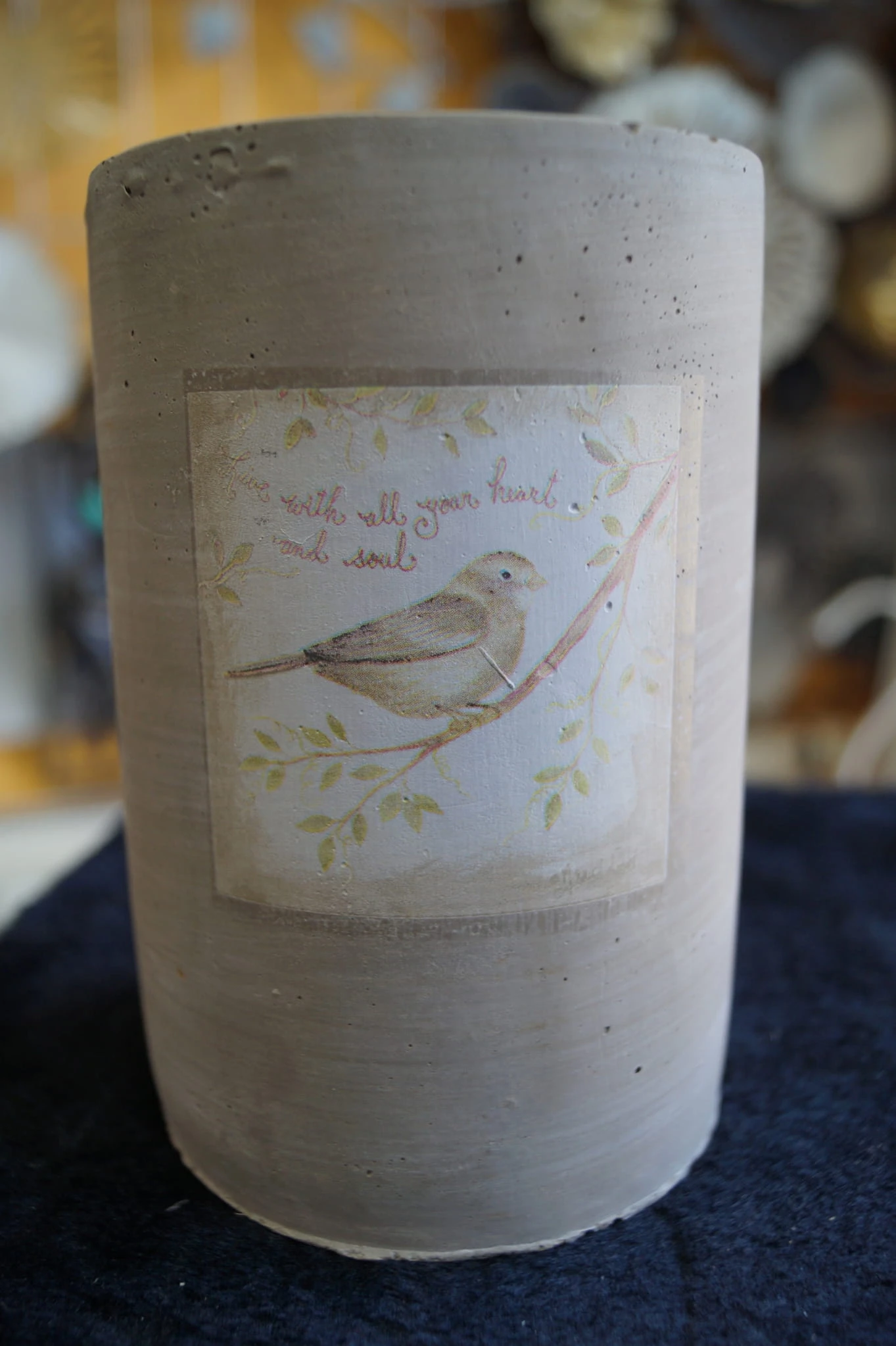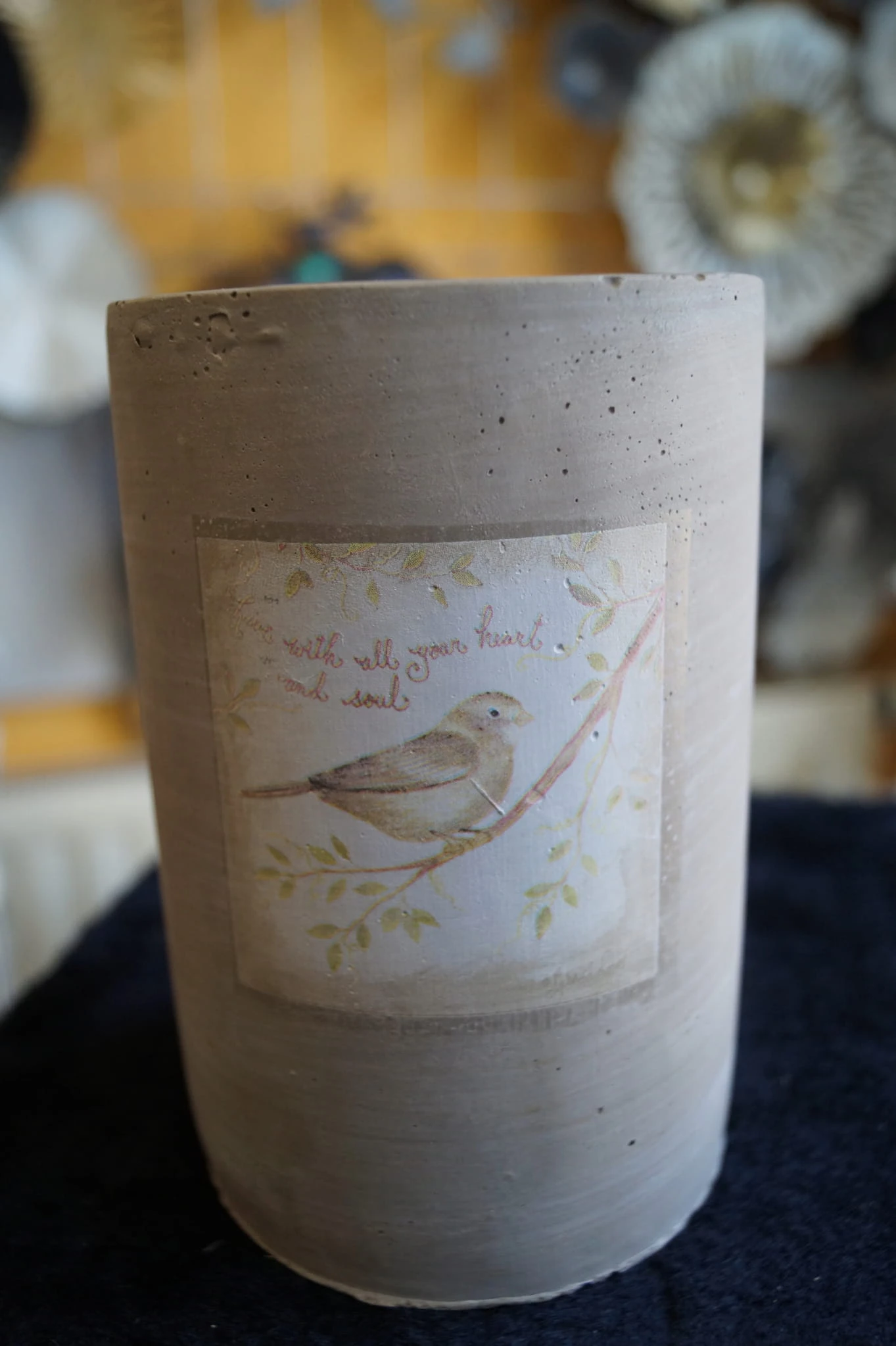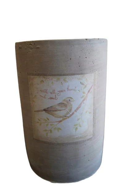 Przepiękny wazon ceramiczny w betonowym kolorze. Jego niespotykana forma zachwyci każdego. Wazon posiada obraz z ptaszkiem, siedzącym na gałęzi. Całość prezentuje się bardzo nietypowo - ten wazon będzie wspaniałą dekoracją twojego domu na wiosnę. Doskonały również jako prezent.