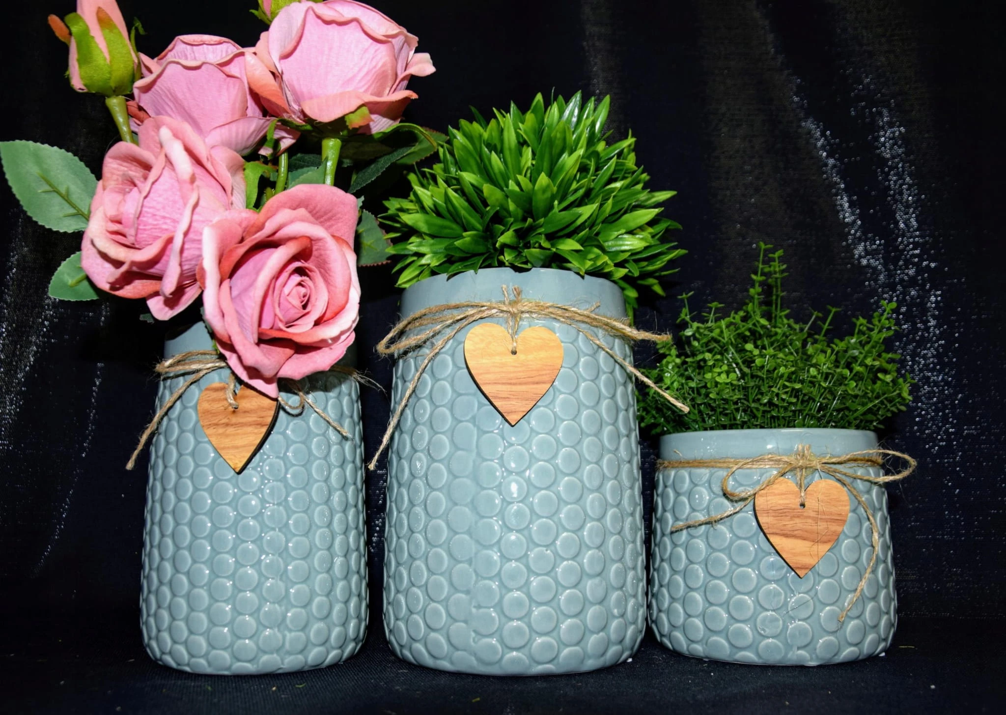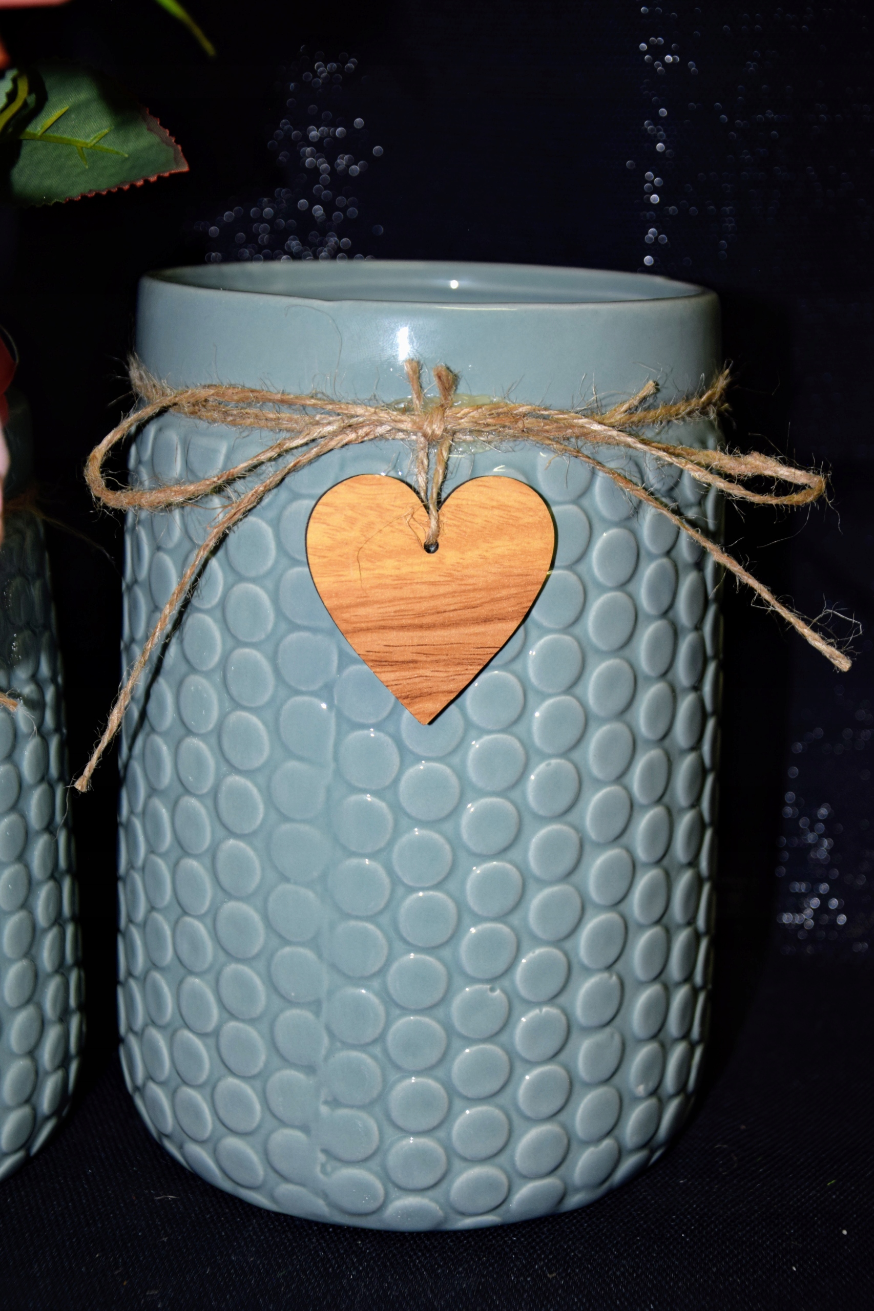 - z ozdobiony sznurkiem jutowym i drewnianą przywieszką w kształcie serca