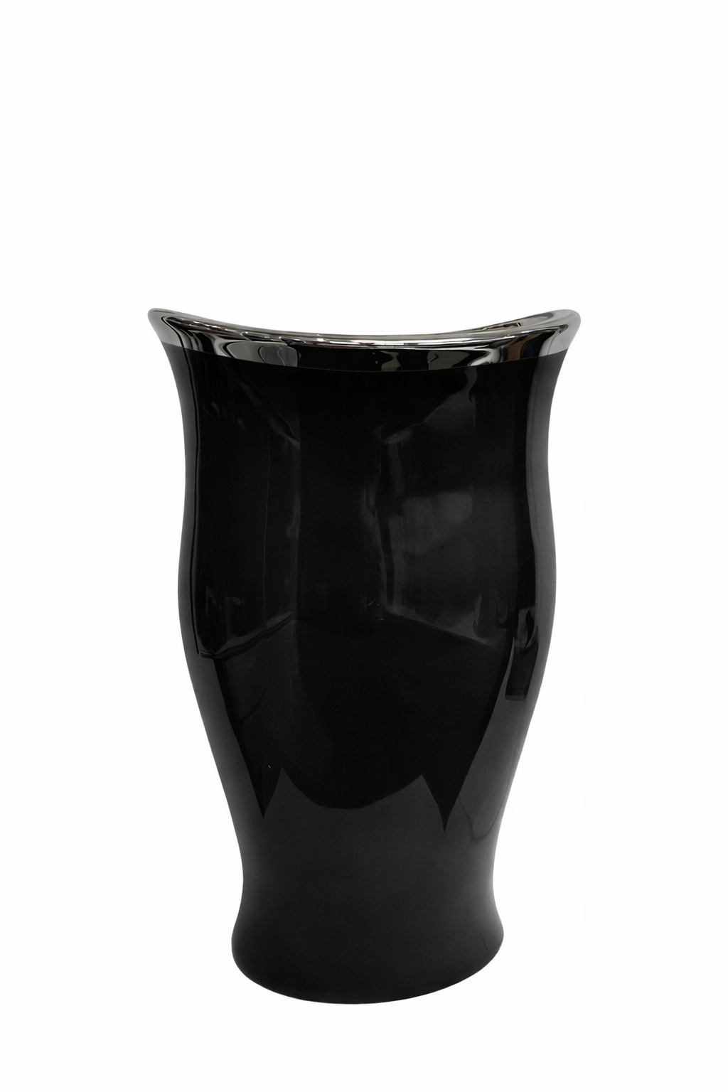Elegancki wazon w kolorze czarny ze srebrnym wykończeniem, wykonany ze szlachetnej ceramiki użytkowej.
