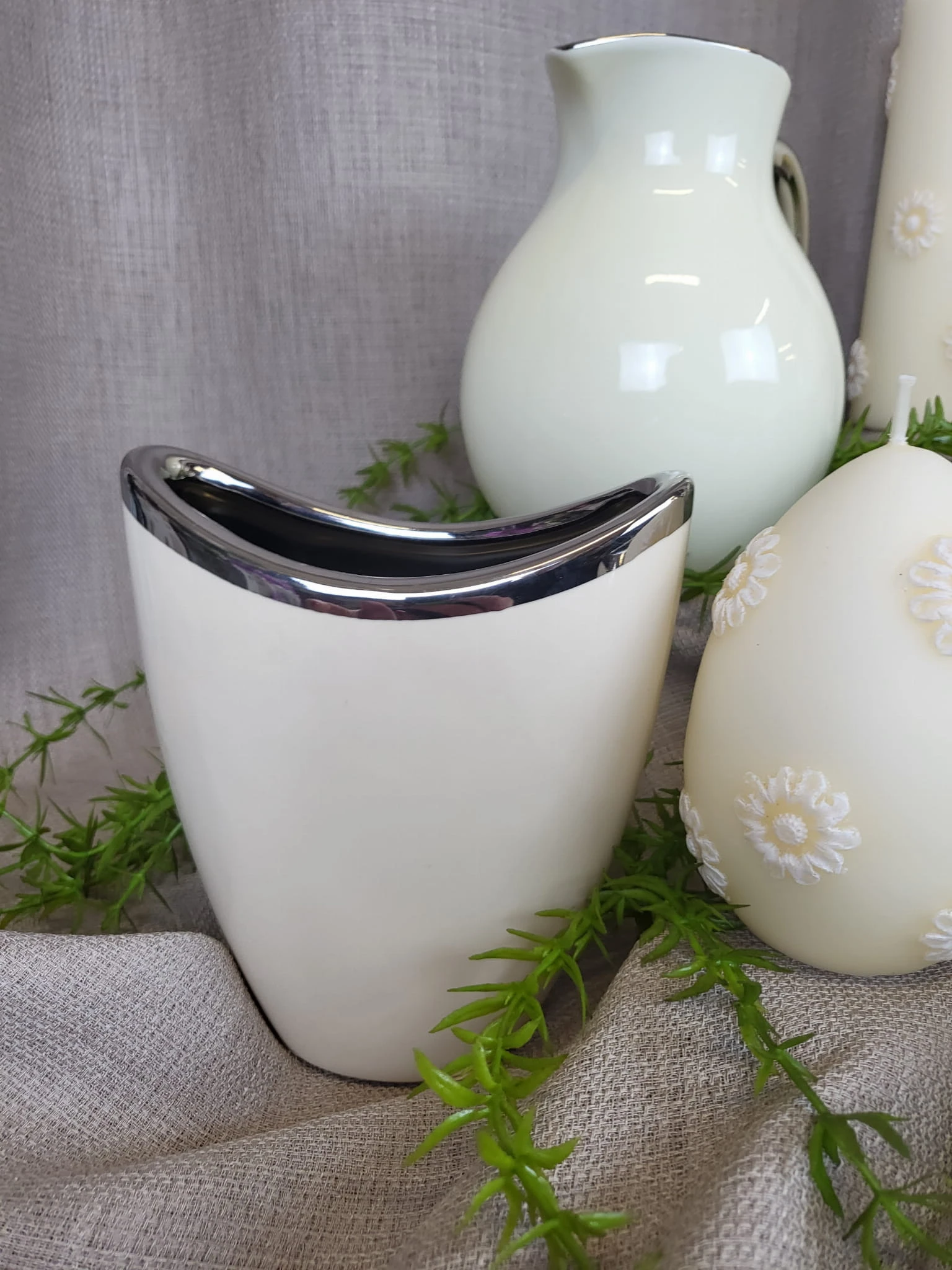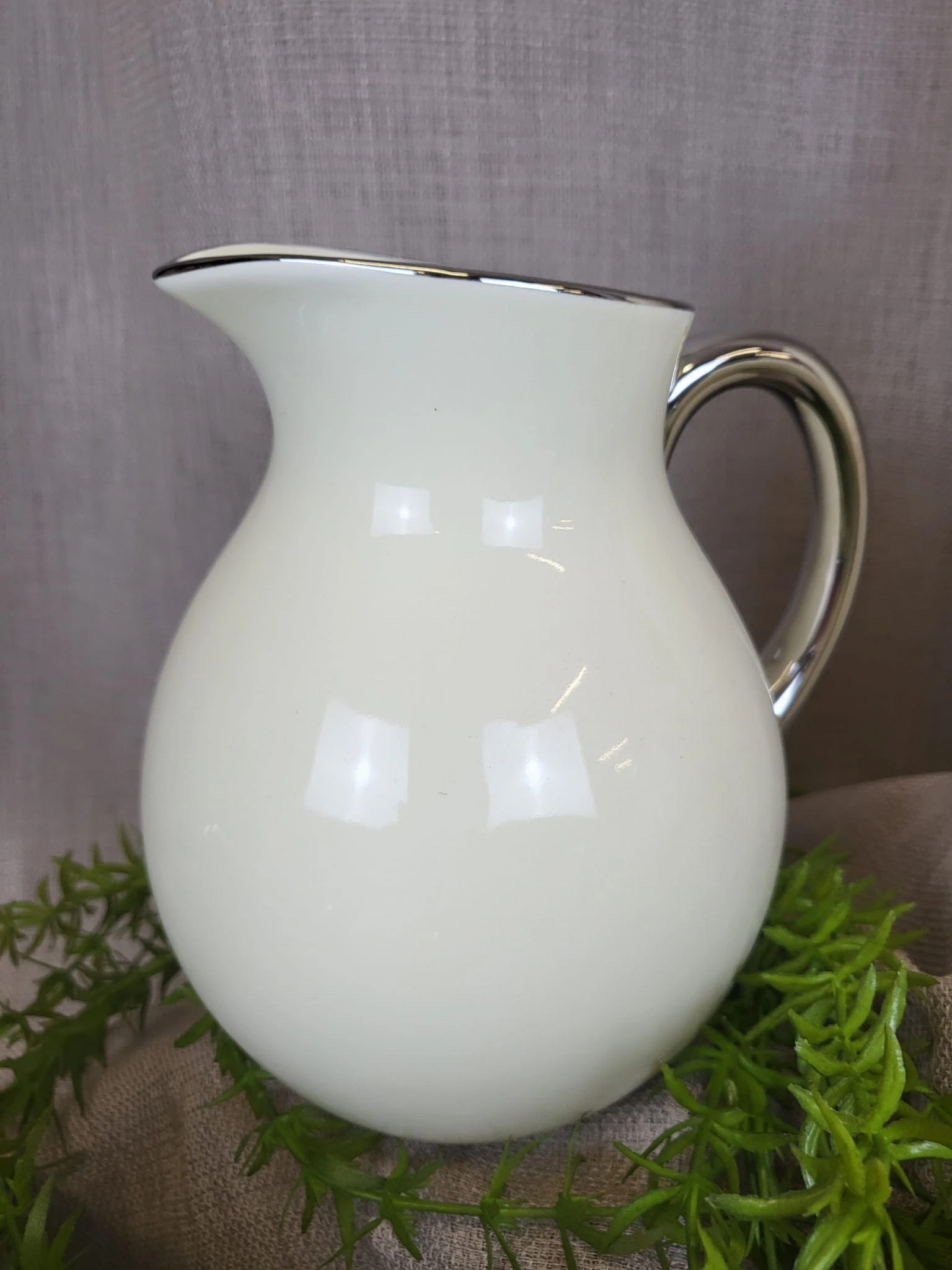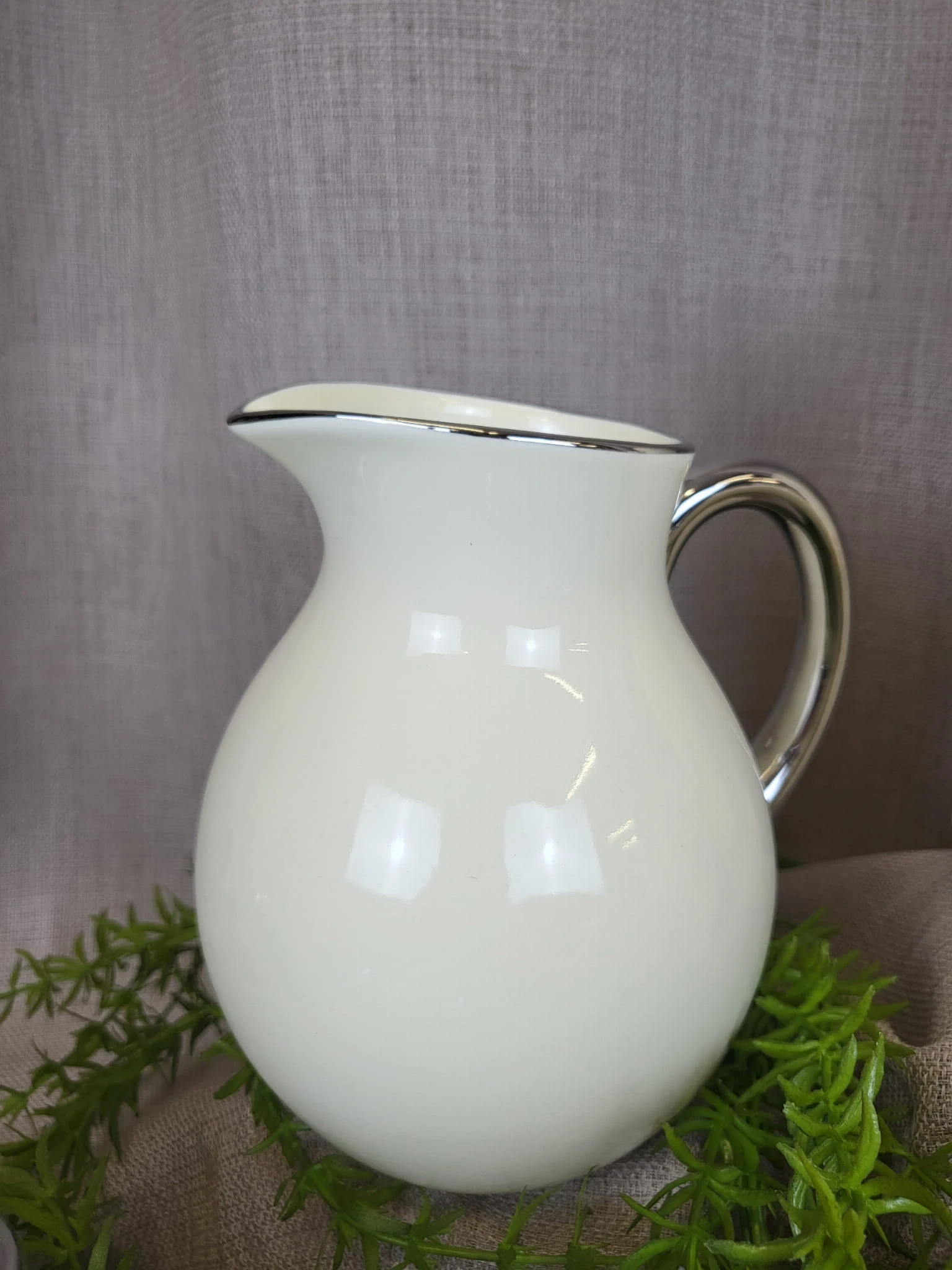 Elegancki wazon w kształcie dzbana z uchem, w kolorze ecru ze srebrnym wykończeniem, wykonany ze szlachetnej ceramiki użytkowej.