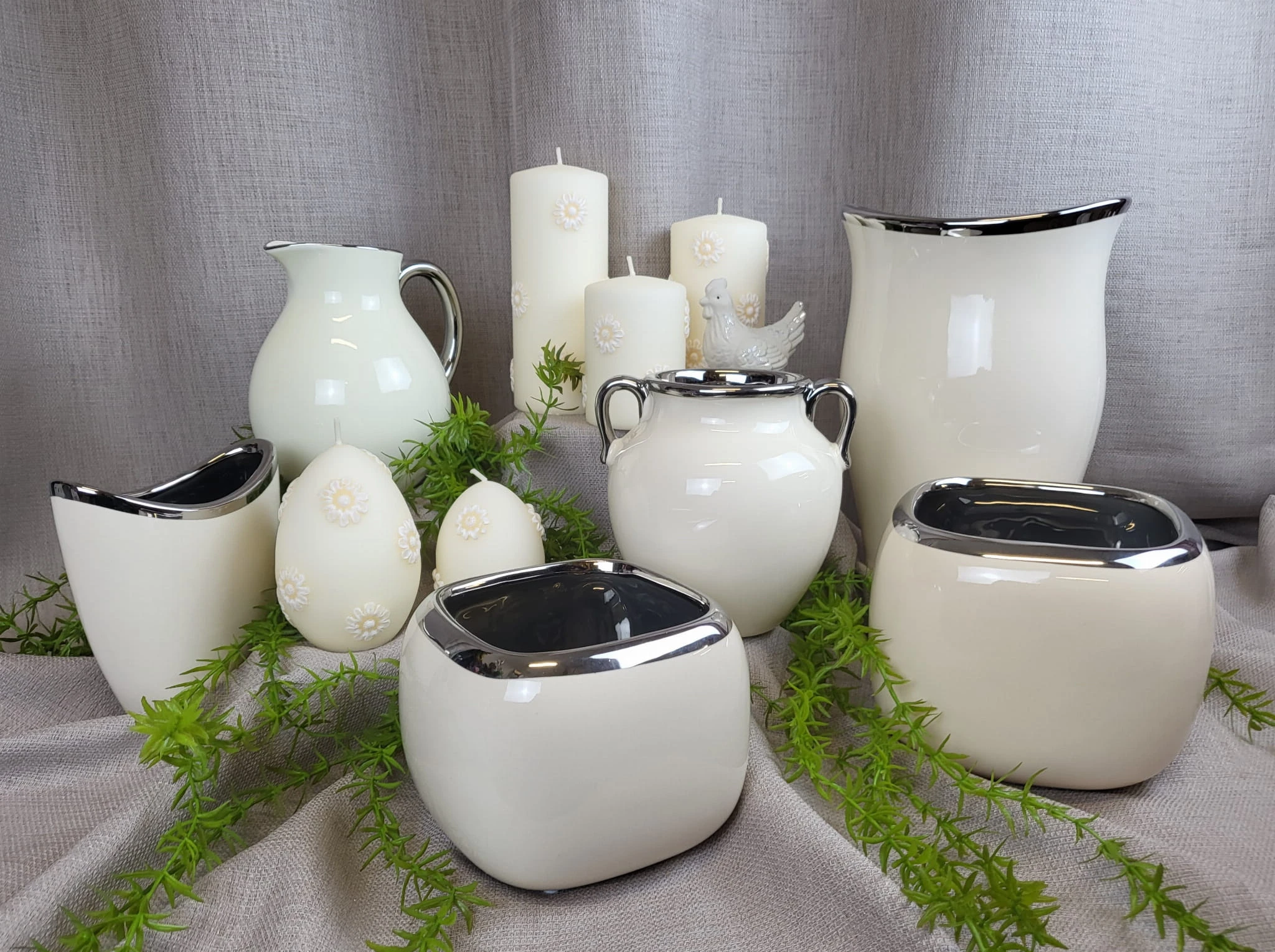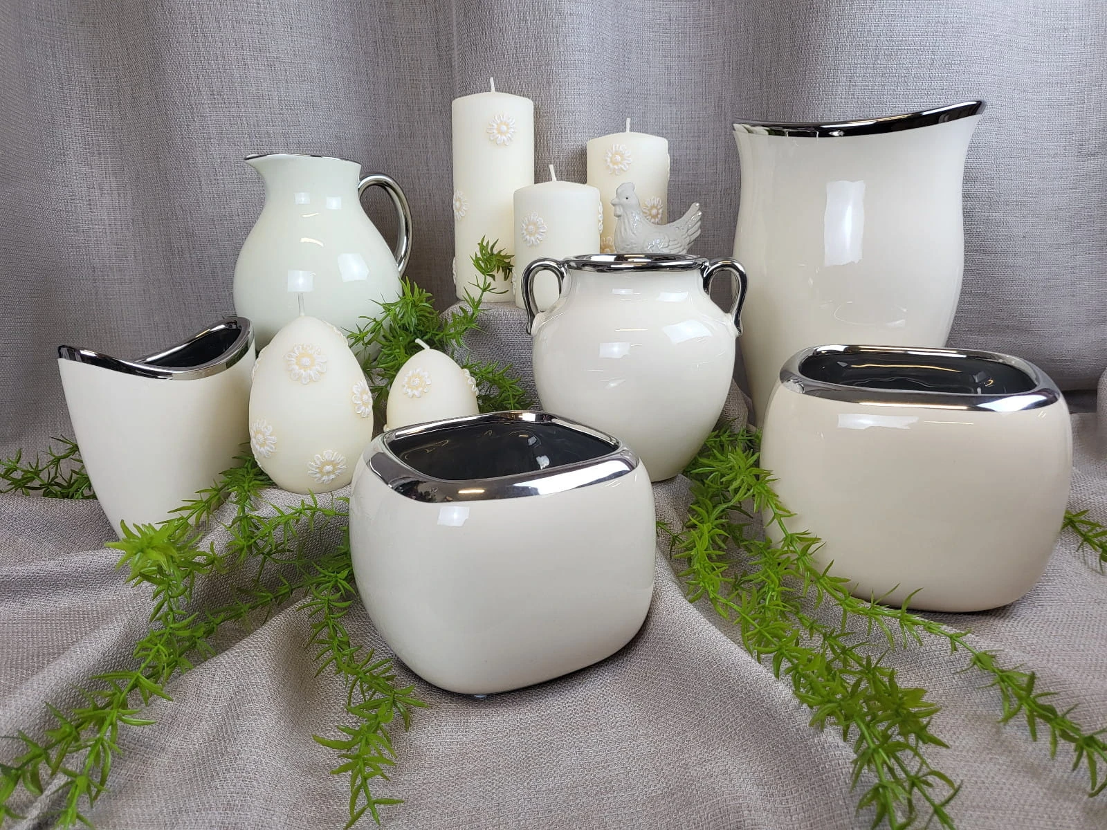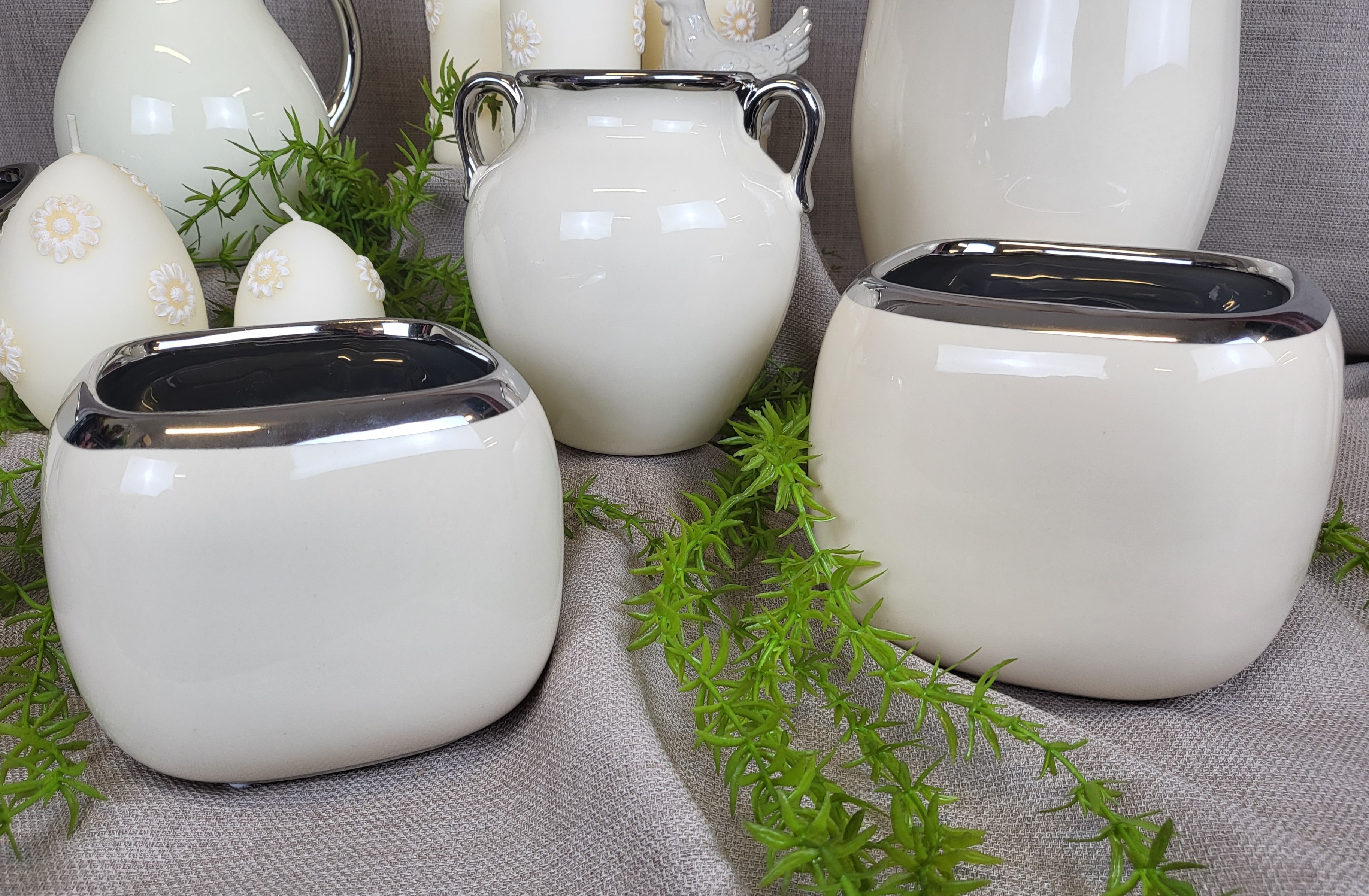 Elegancki wazon w kształcie dzbana z uchem, w kolorze ecru ze srebrnym wykończeniem, wykonany ze szlachetnej ceramiki użytkowej.
