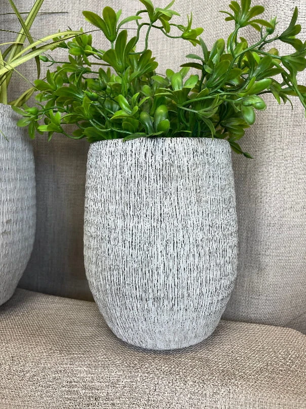 Wazon betonowy w szarym kolorze przecierany. Idealnie wkomponuje się we wnętrze w stylu glamour jak i nowoczesne. Wazon ozdobi biuro, salon czy taras. Może zostać użyty jako osłonka.