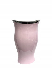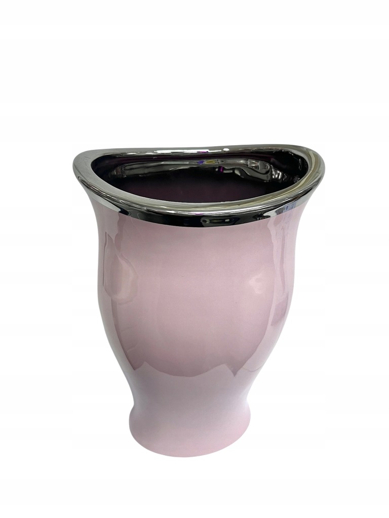 Elegancki wazon w kolorze różowym ze srebrnym wykończeniem, wykonany ze szlachetnej ceramiki użytkowej.