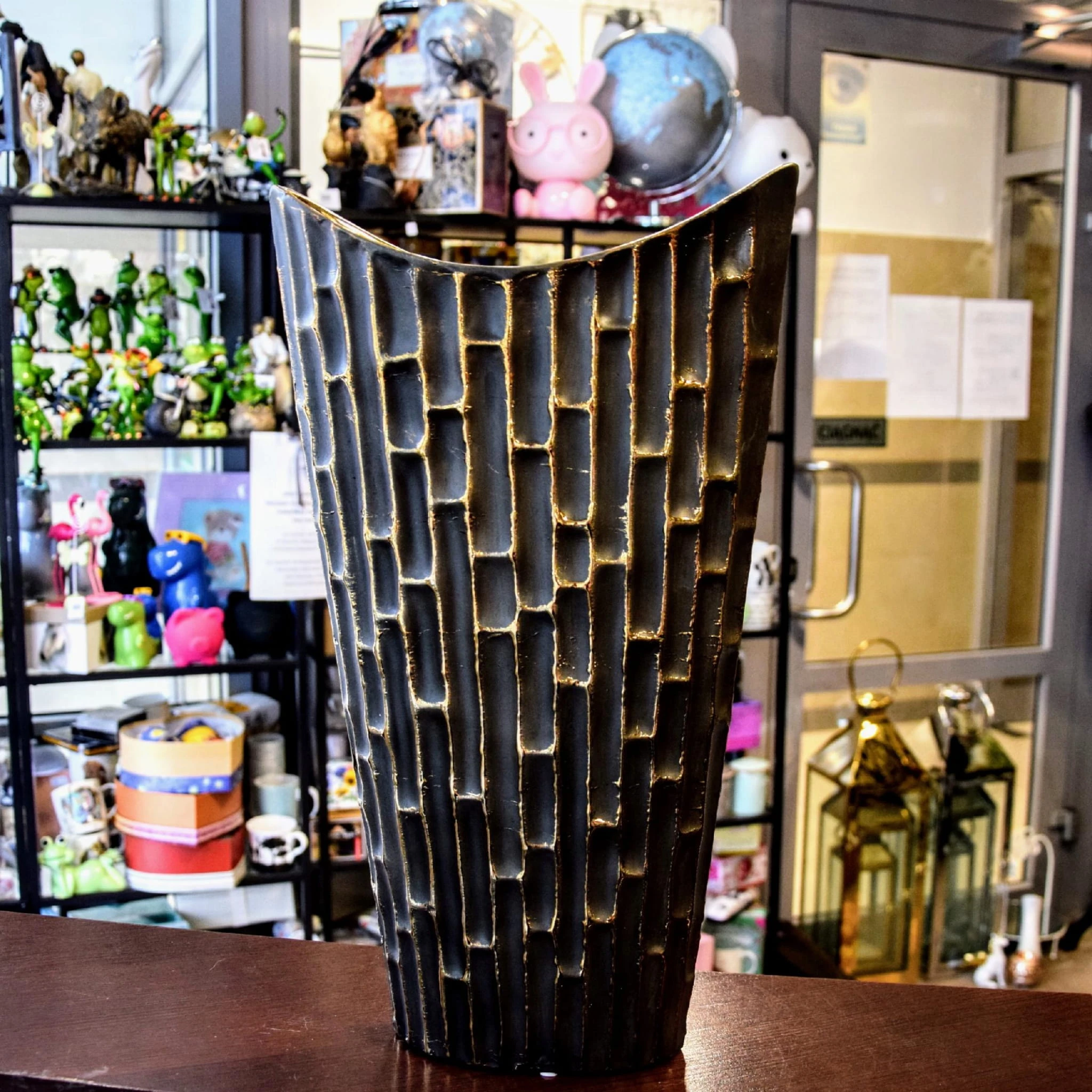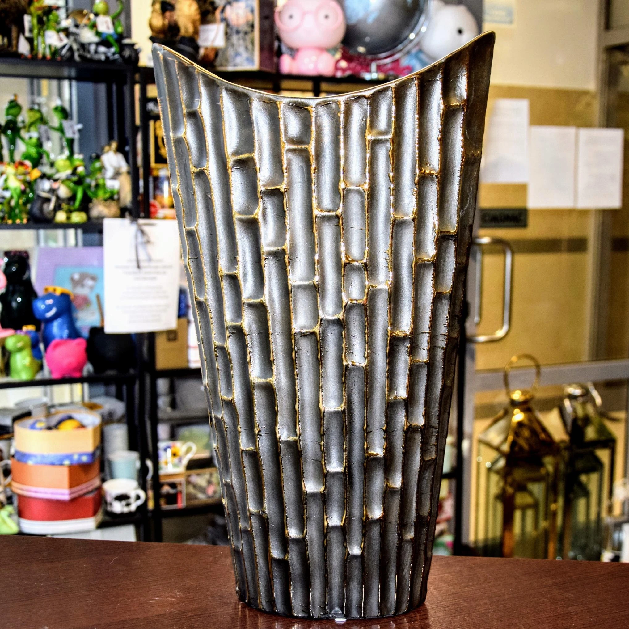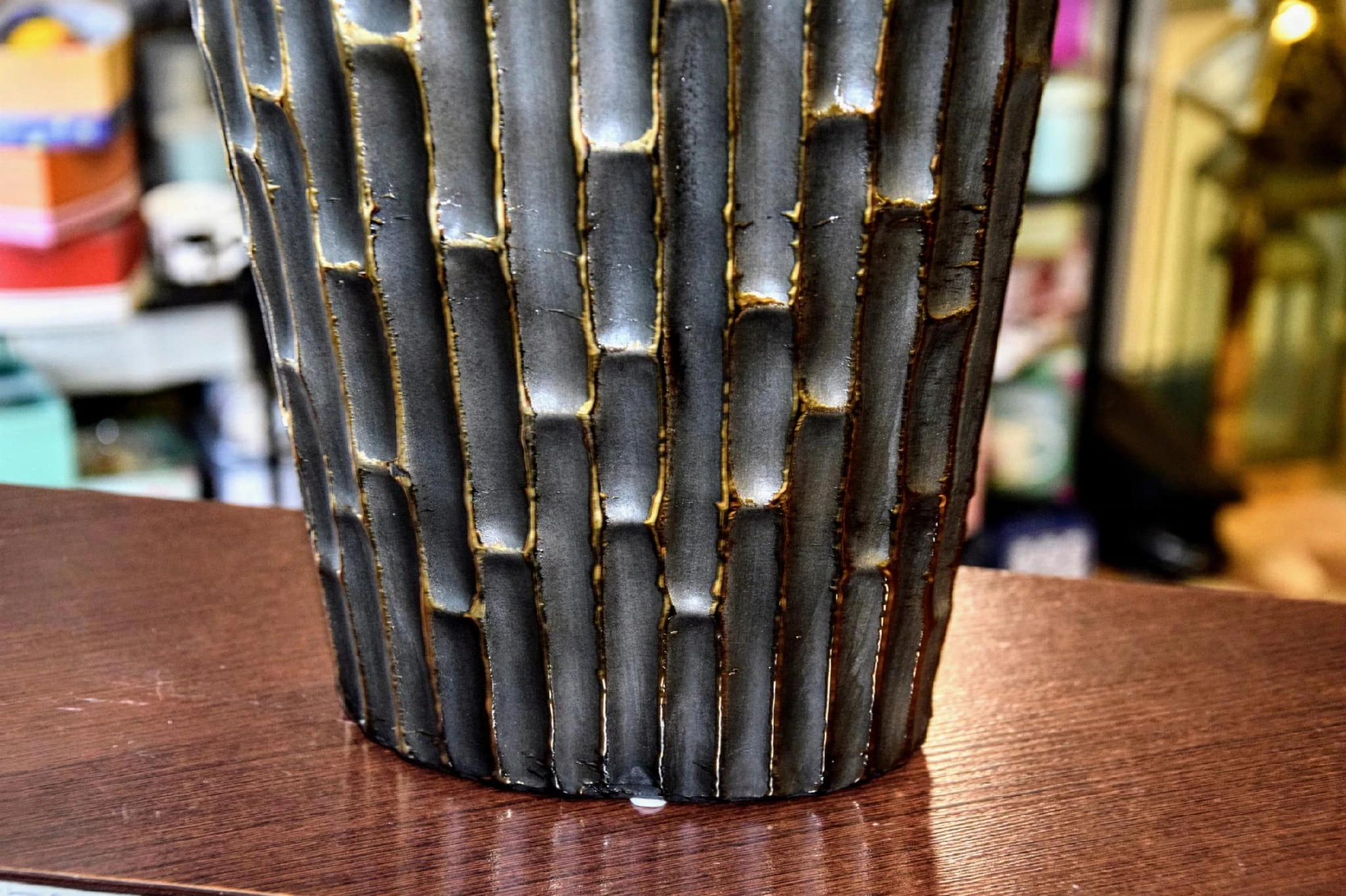 Nietuzinkowy wazon z ozdobnymi ściankami stylizowanymi na bambus.