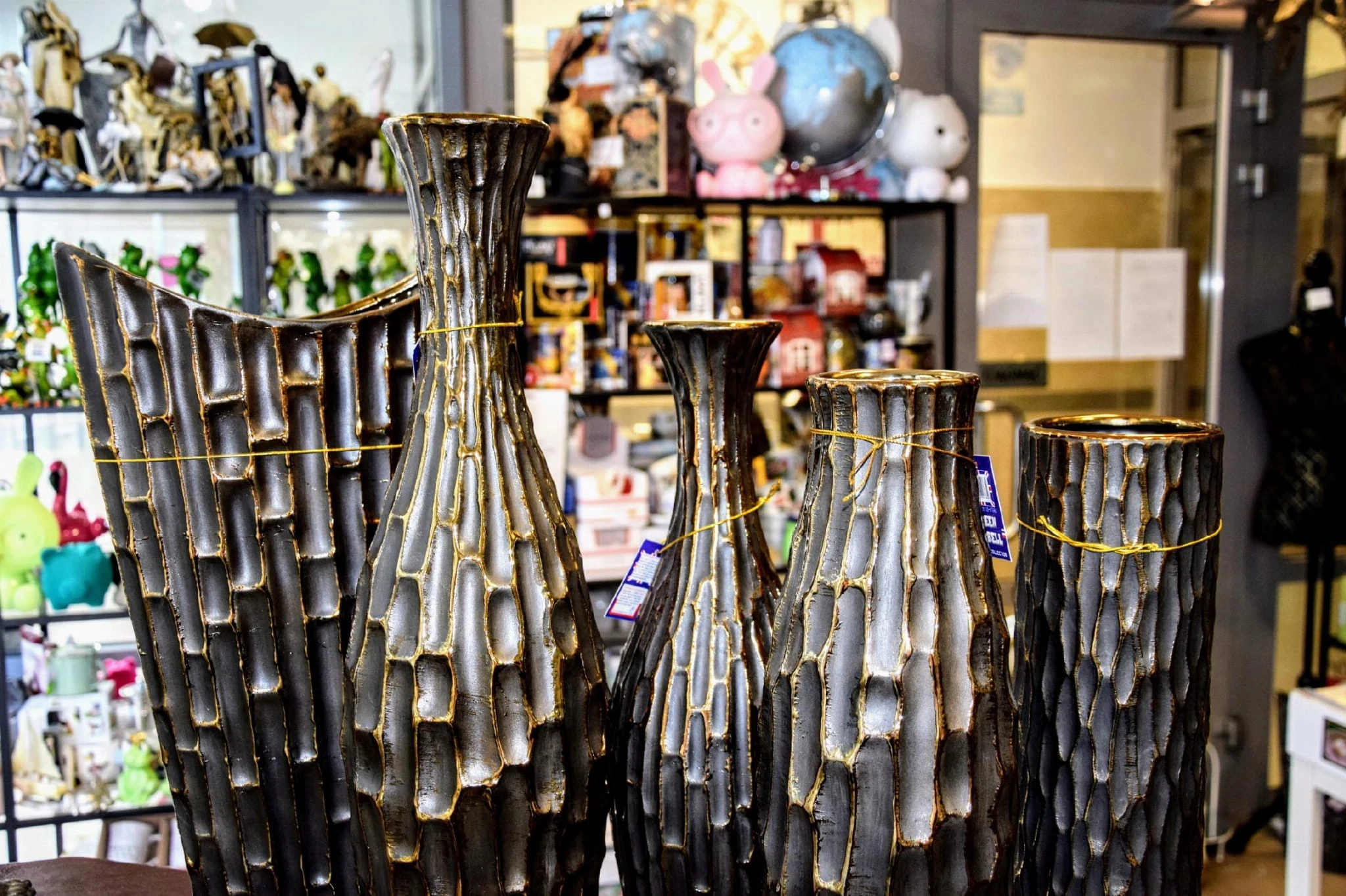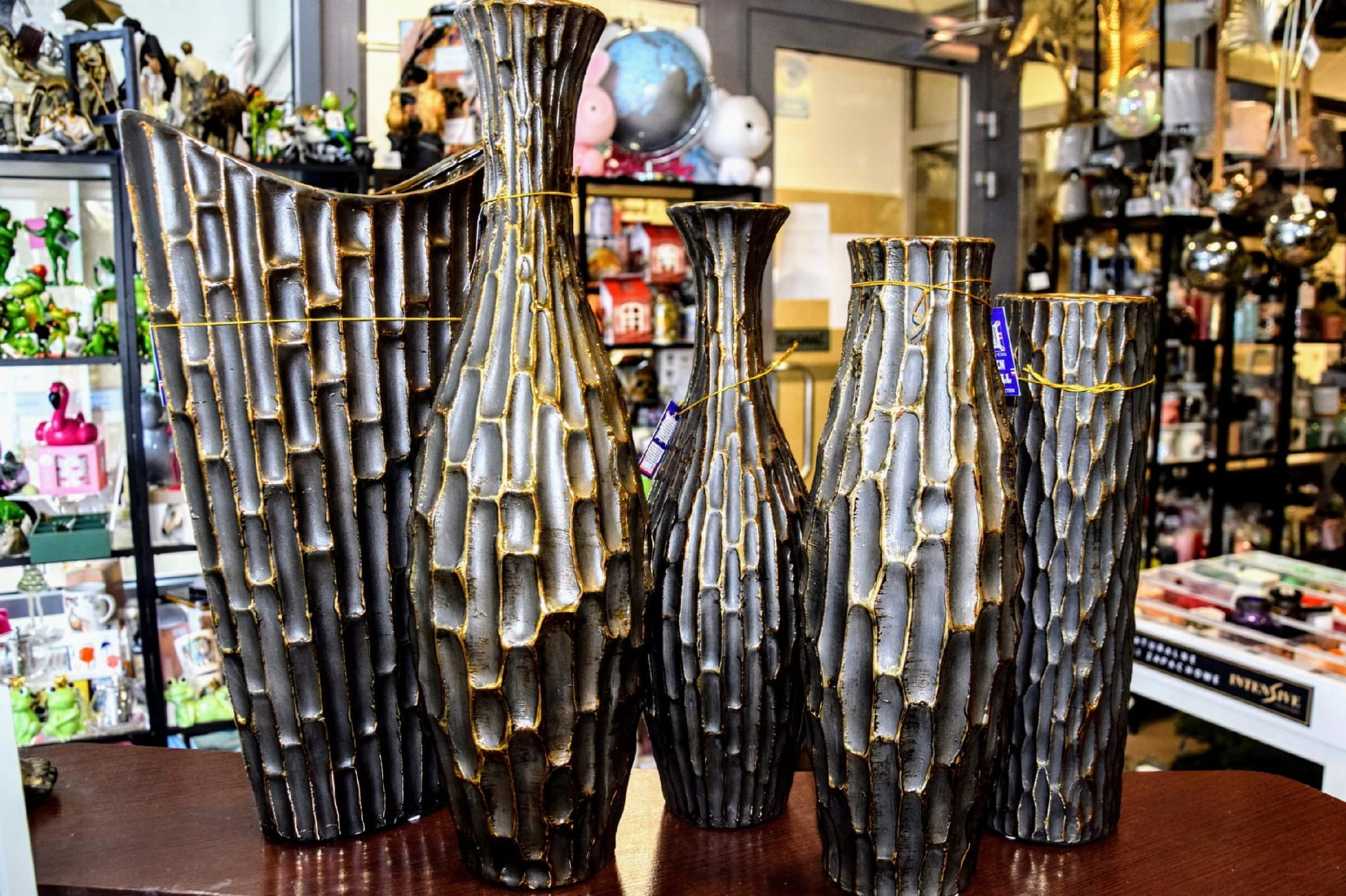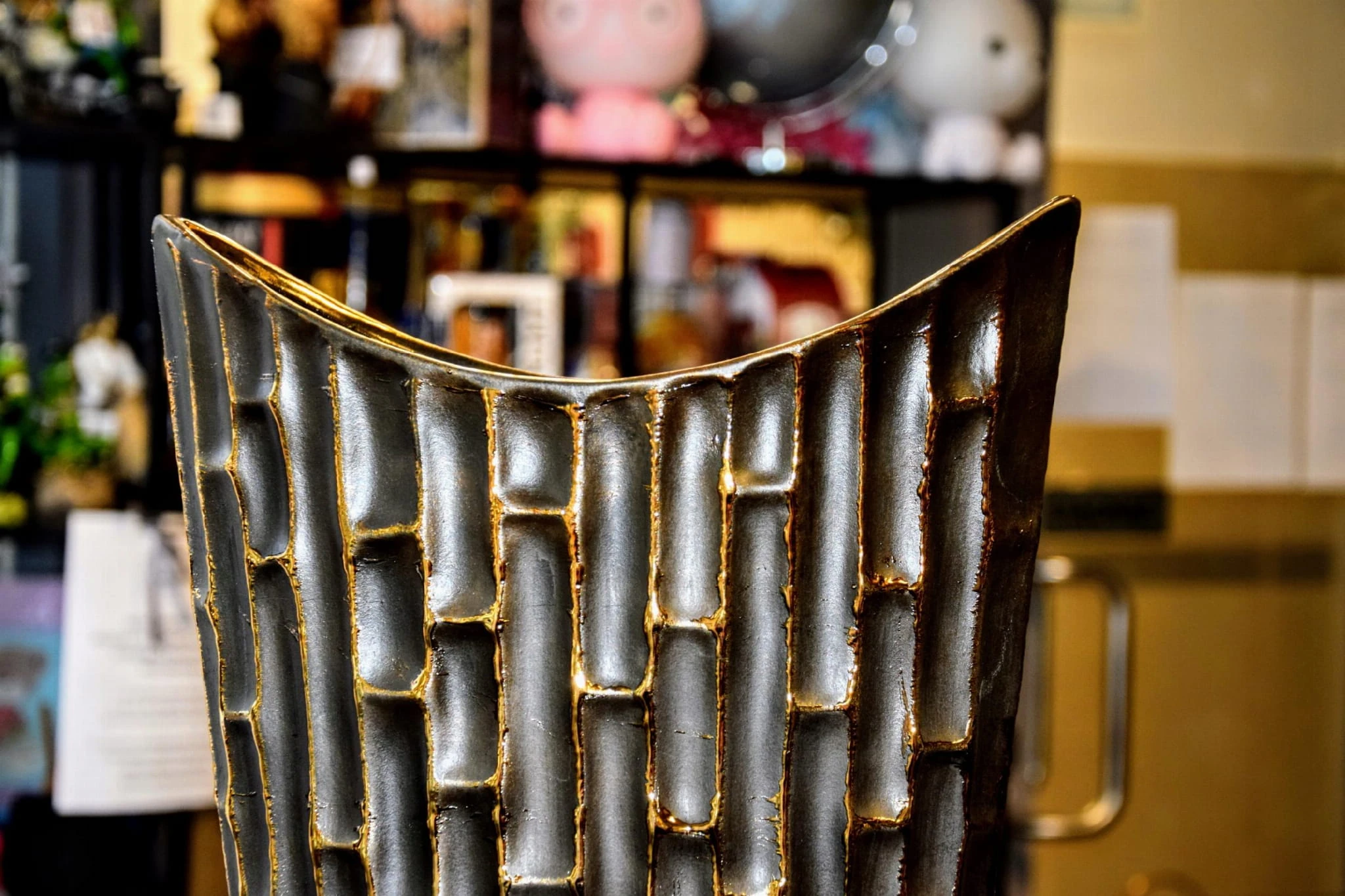 Nietuzinkowy wazon z ozdobnymi ściankami stylizowanymi na bambus.