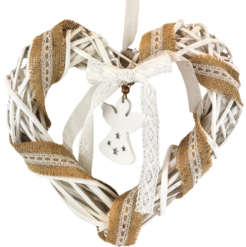 Wiszące wiklinowe serce z białym aniołkiem przyozdobione koronką. Będzie piękną dekoracją ściany, okna lub innego dowolnego miejsca.