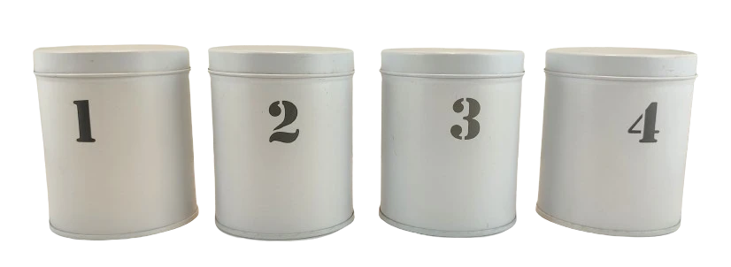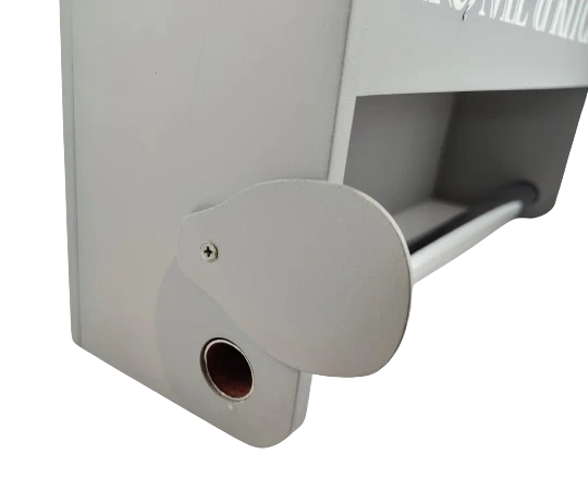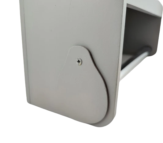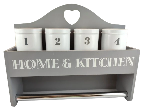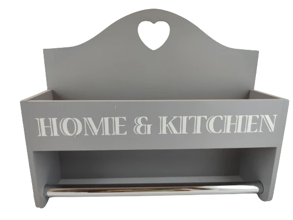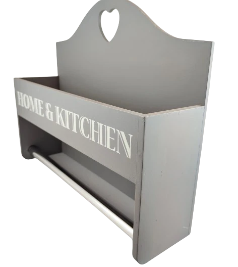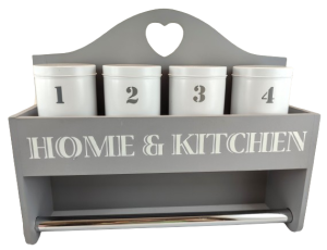 Elegancka półka w szarym kolorze z zestawem metalowych pojemników. Posiada uchwyt do zawieszenia ręcznika papierowego.