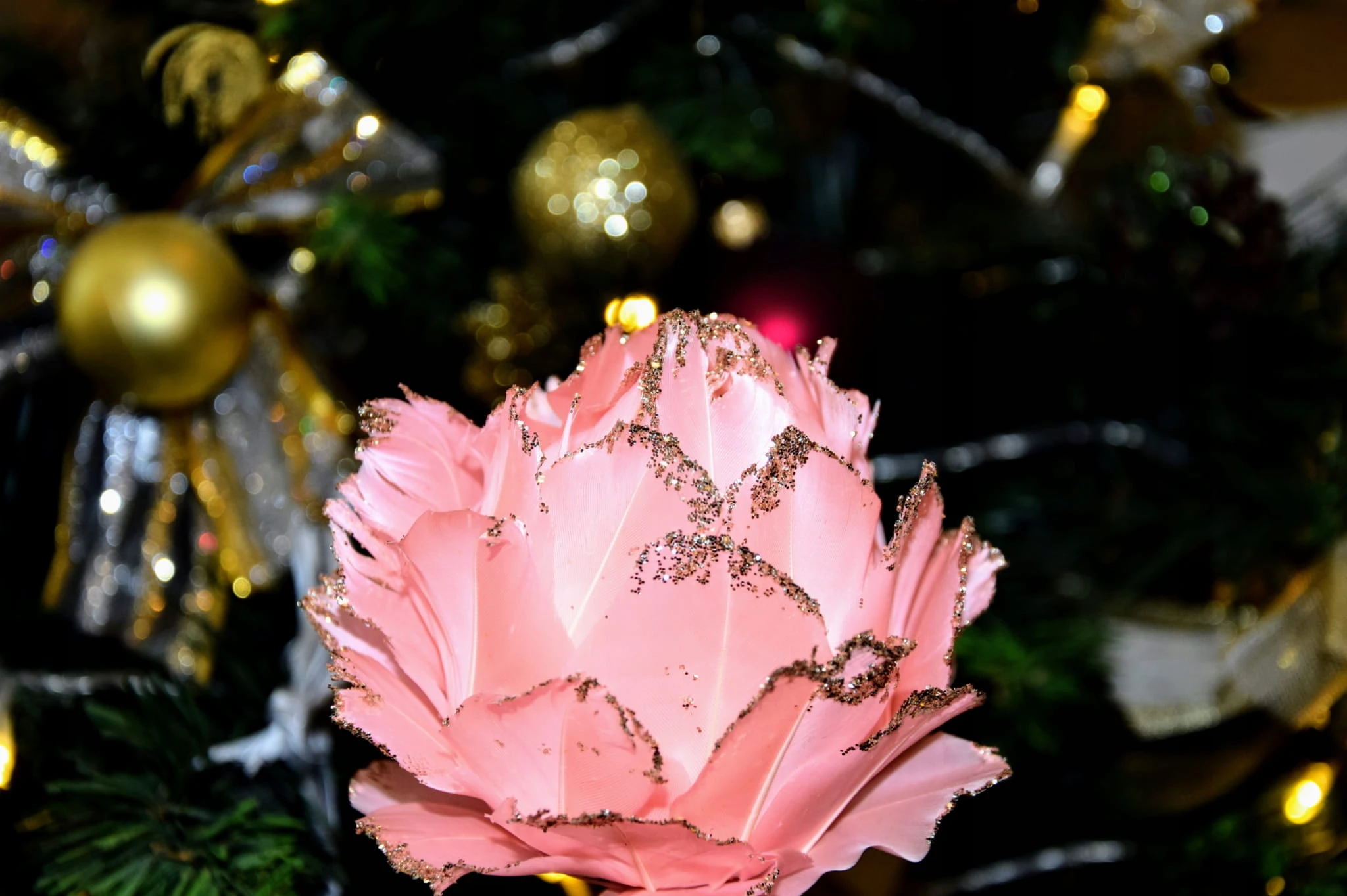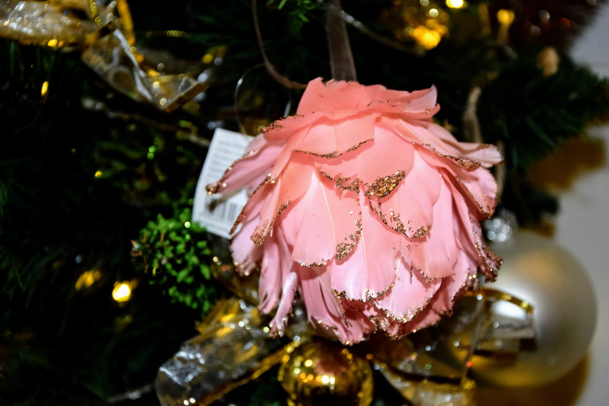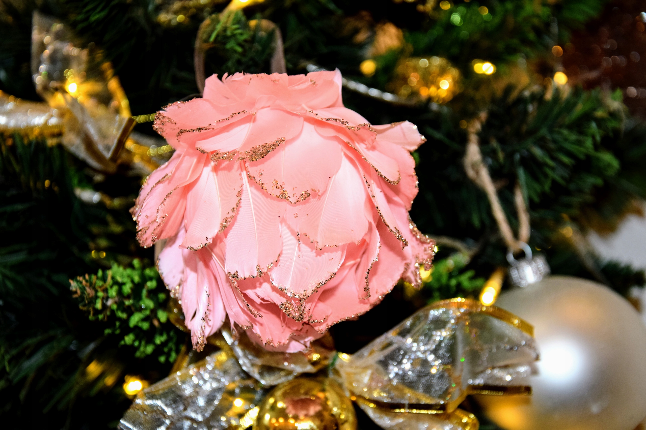 Wykonany ze styropianu i piór kwiat na eleganckiej wstążce będzie oryginalną ozdobą nie tylko choinki.