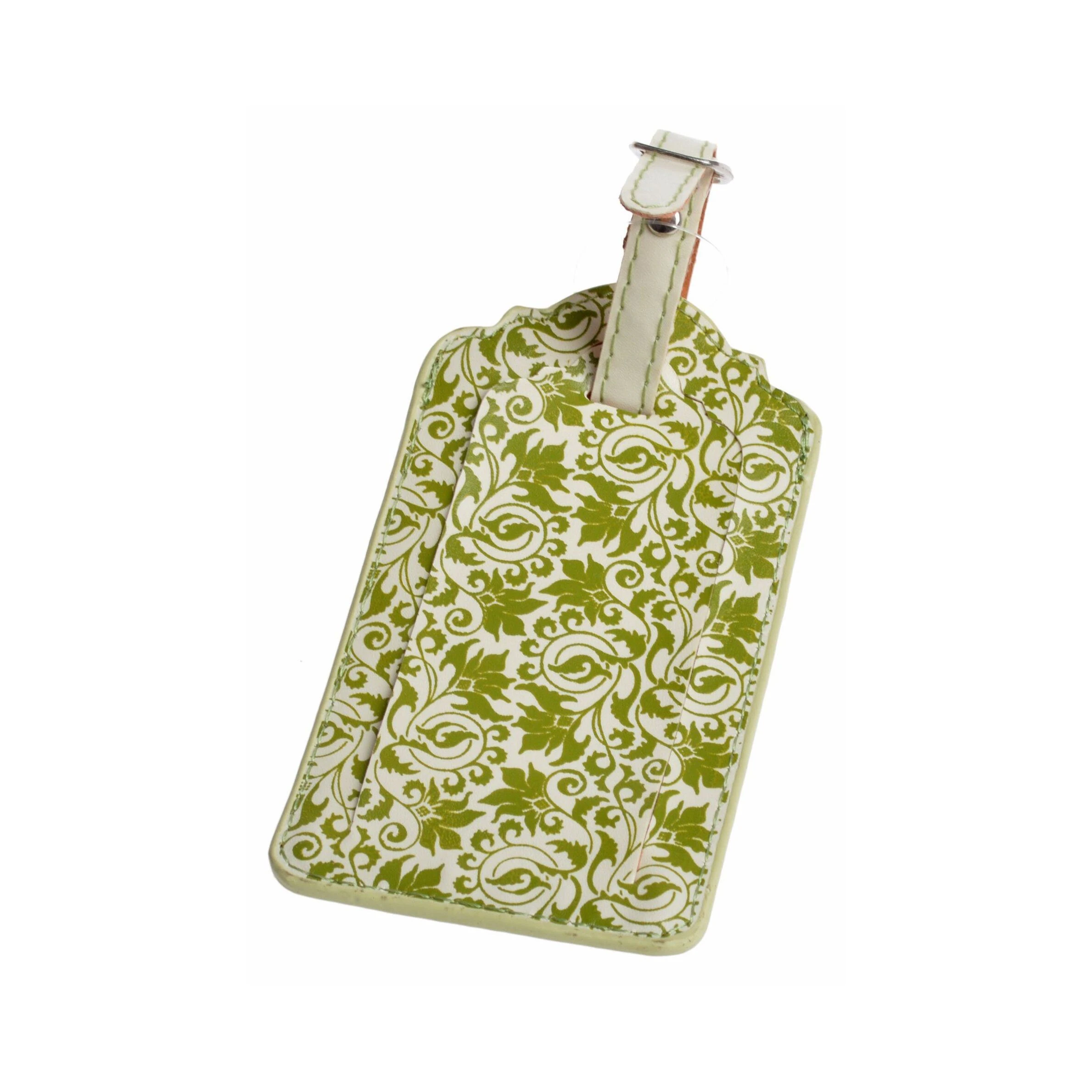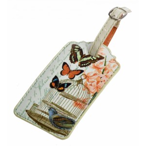 Zawieszka na bagaż z klatką, ptaszkiem i motylami, na pasku z klamerką. Z tyłu, ukryta pod klapką, tabelka z możliwością wpisania danych adresowych.