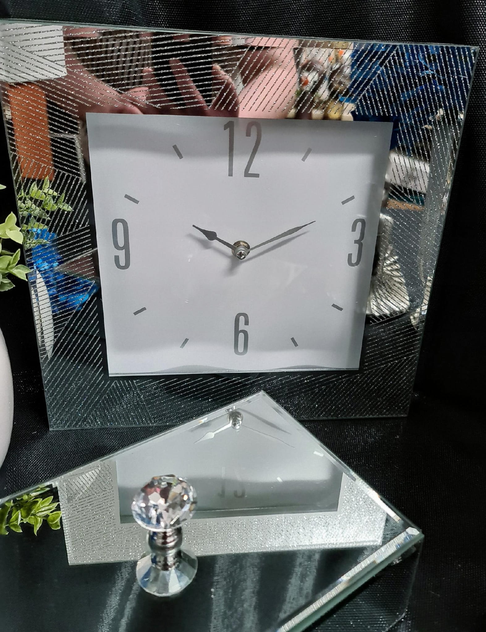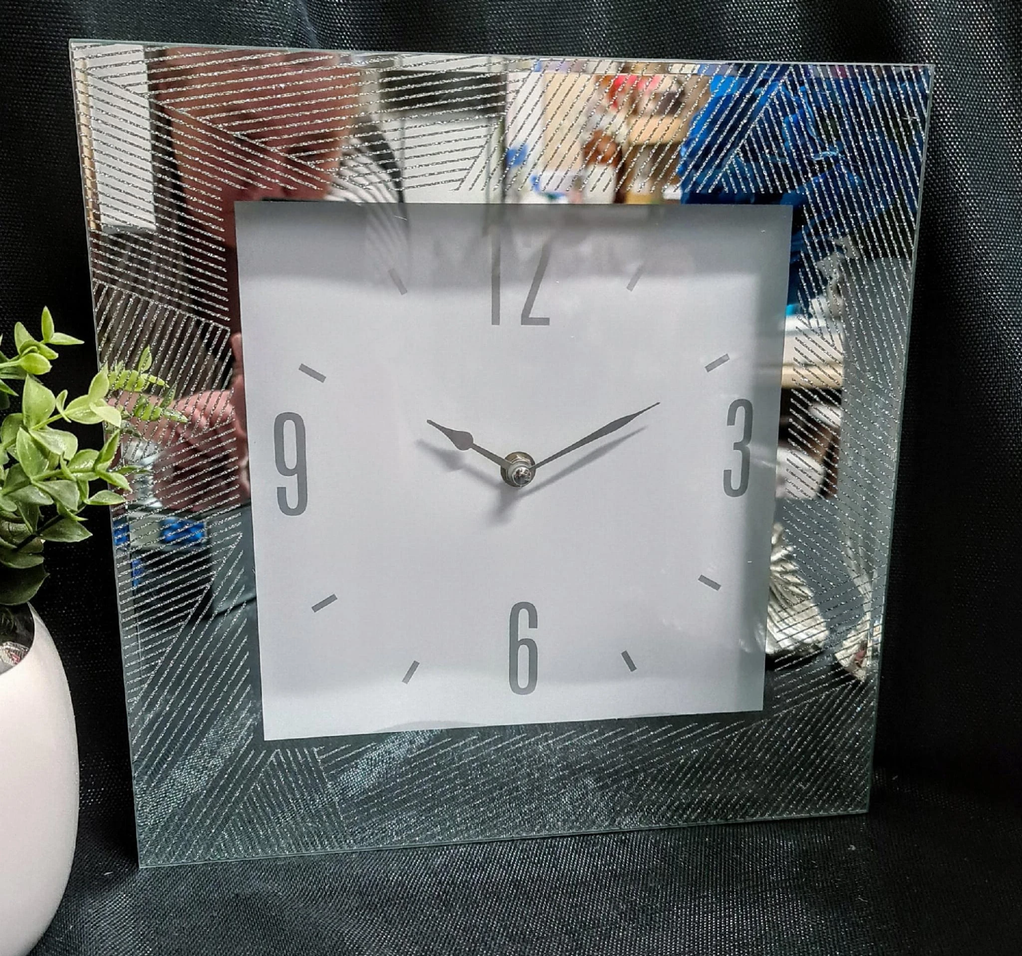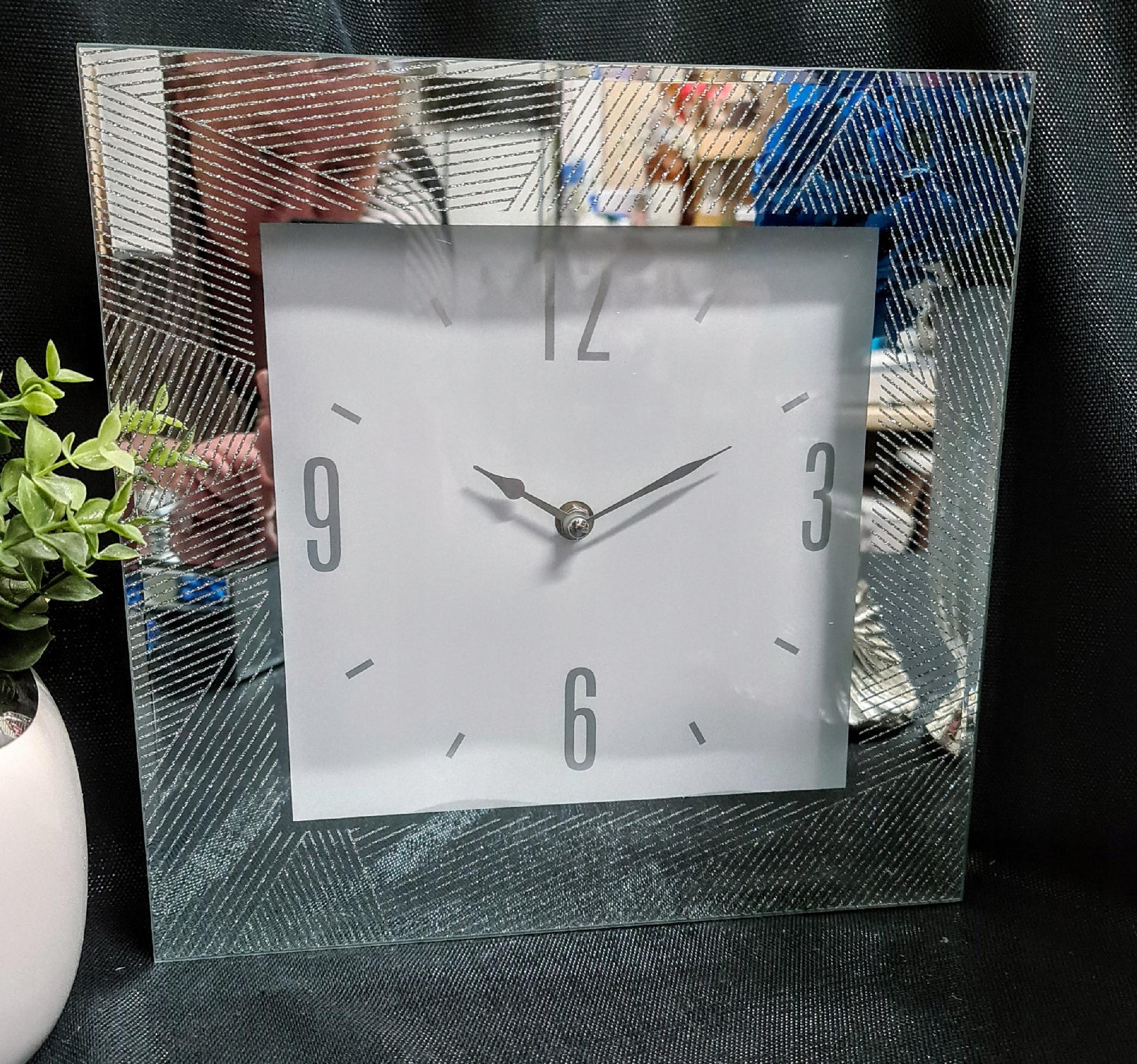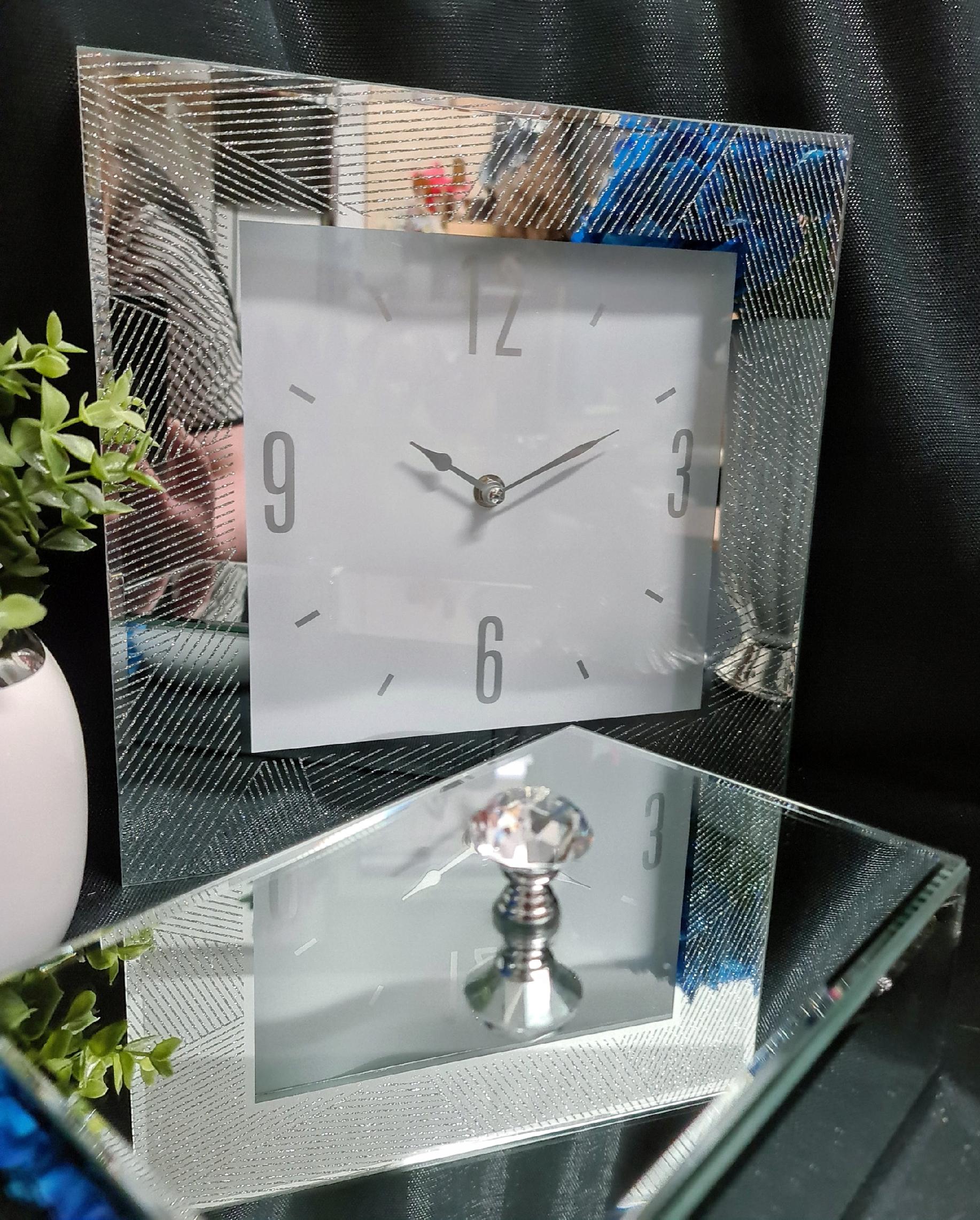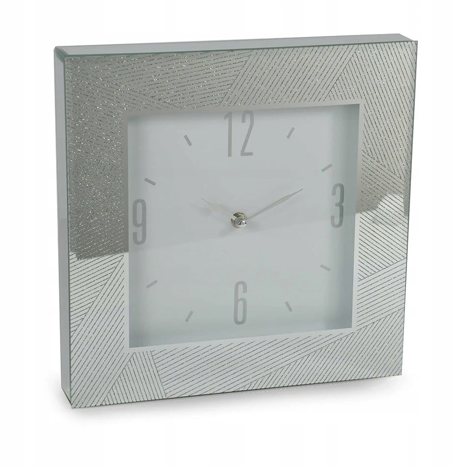Kwadratowy zegar wykonany ze szkła, ozdobiony brokatowym wzorem. Połączenie lustrzanej powierzchni z blaskiem brokatu i prostą tarczą idealnie uzupełni modny styl glamour, ale nie tylko – z powodzeniem dopasuje się do klasyki i nowoczesności.