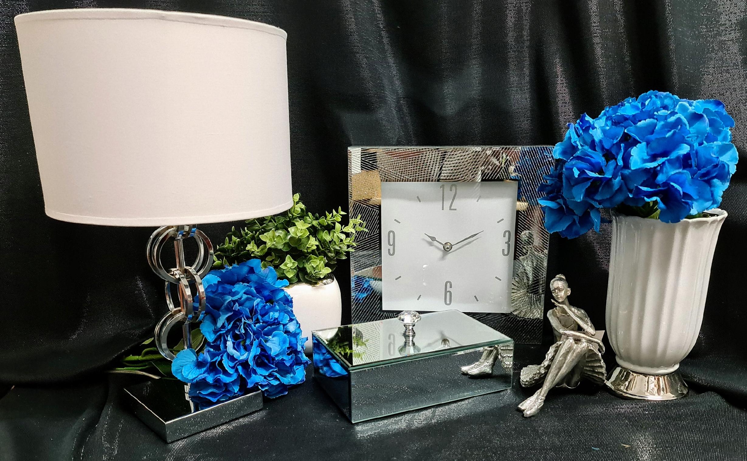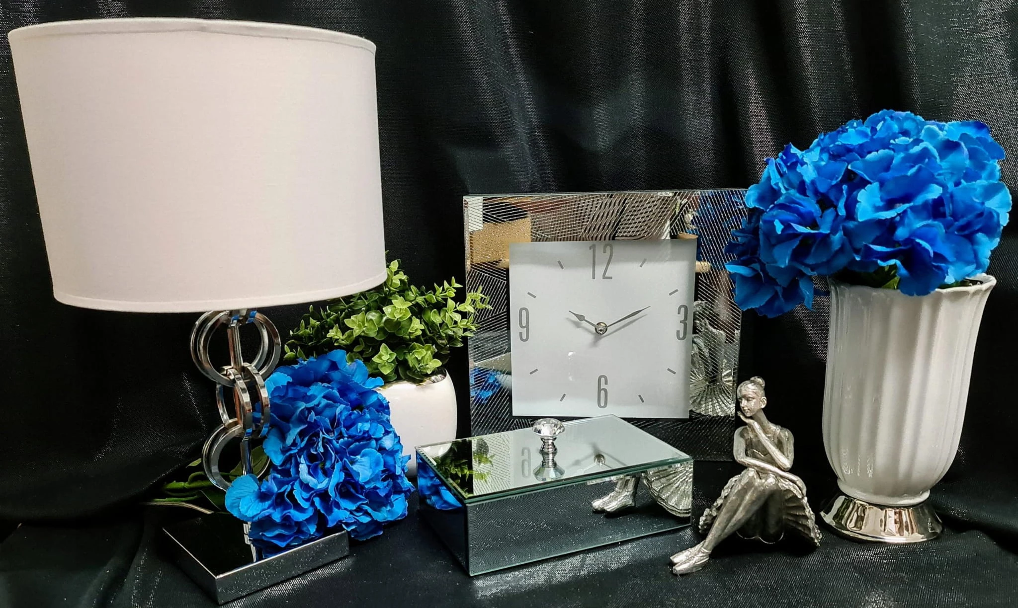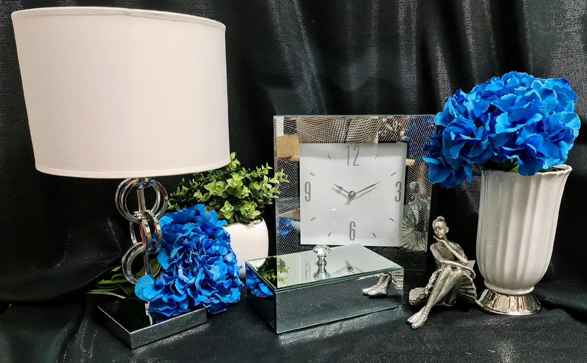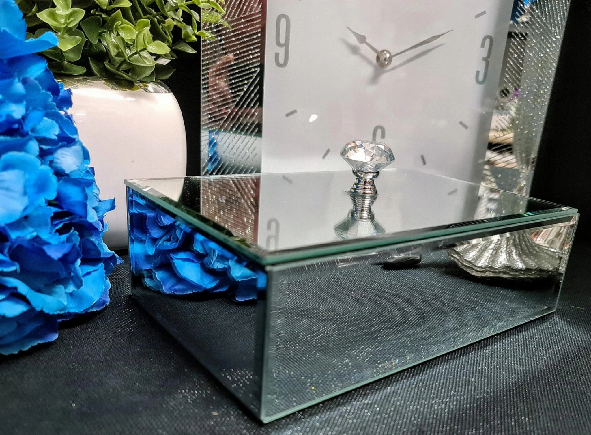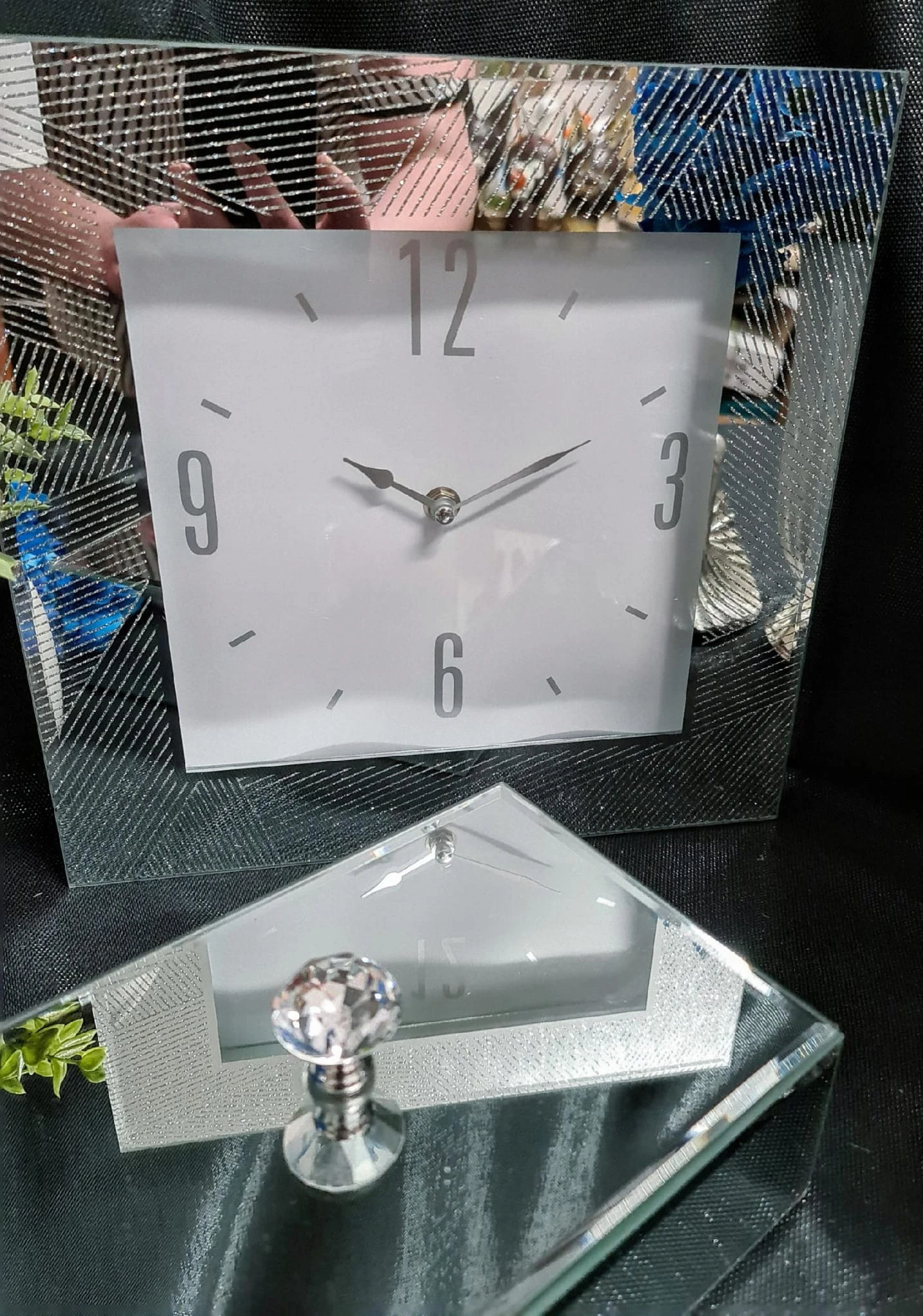 Kwadratowy zegar wykonany ze szkła, ozdobiony brokatowym wzorem. Połączenie lustrzanej powierzchni z blaskiem brokatu i prostą tarczą idealnie uzupełni modny styl glamour, ale nie tylko – z powodzeniem dopasuje się do klasyki i nowoczesności.