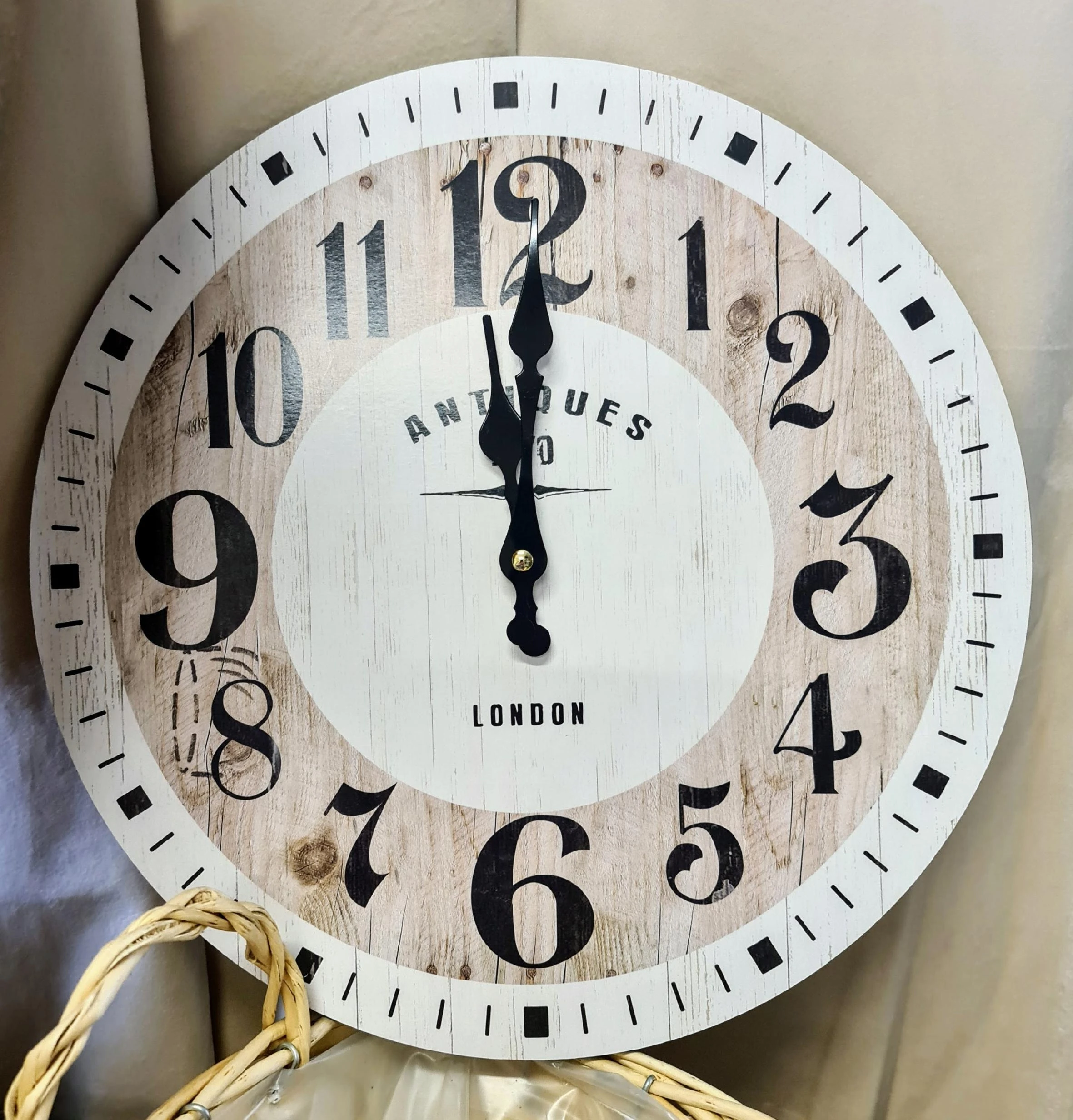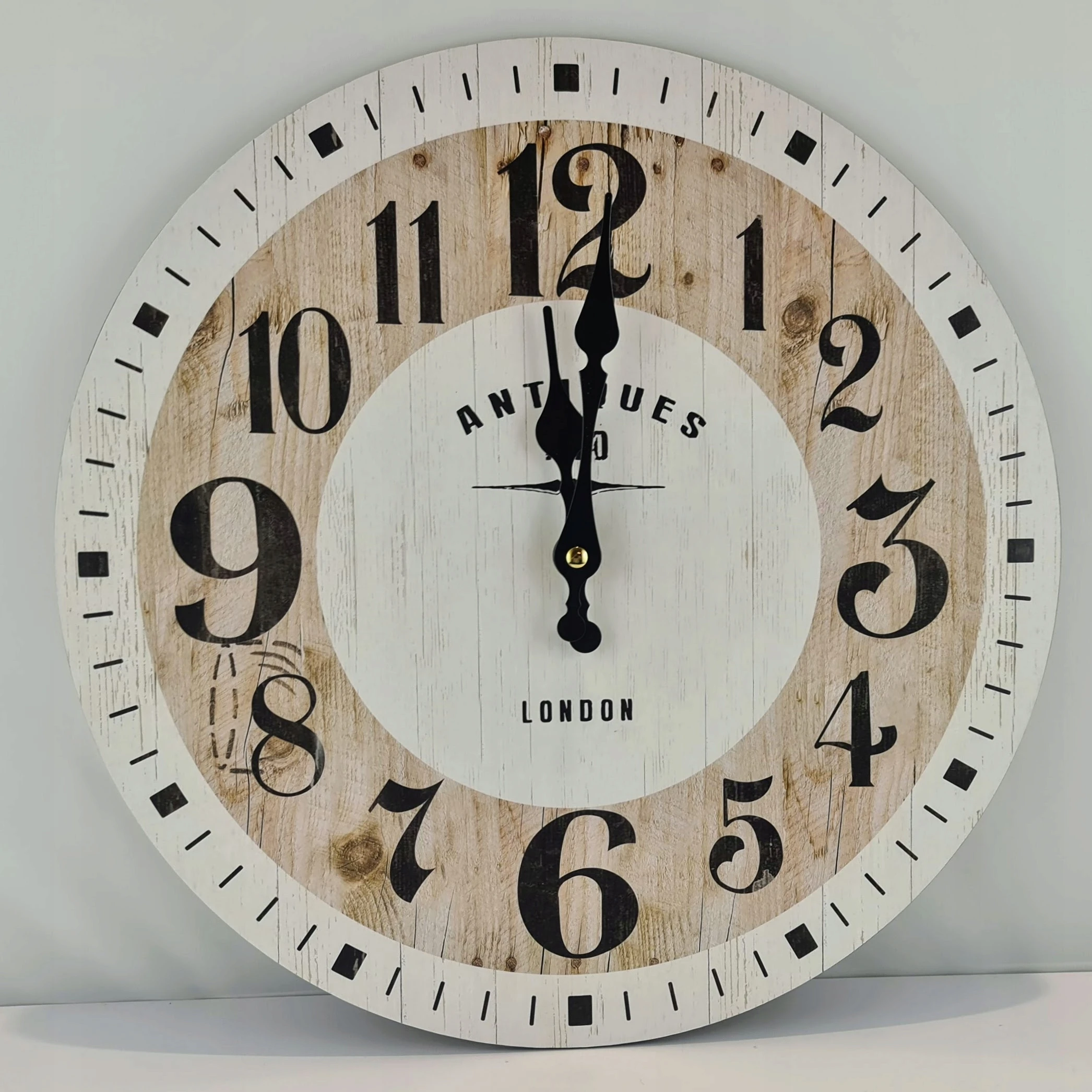 Drewniany zegar, idealnie wkomponuje się w klasyczne wnętrze, jak i w styl vintage. Kolorystyka naturalnego drewna połączona z bielą. Czarne wskazówki, napisy i cyfry.