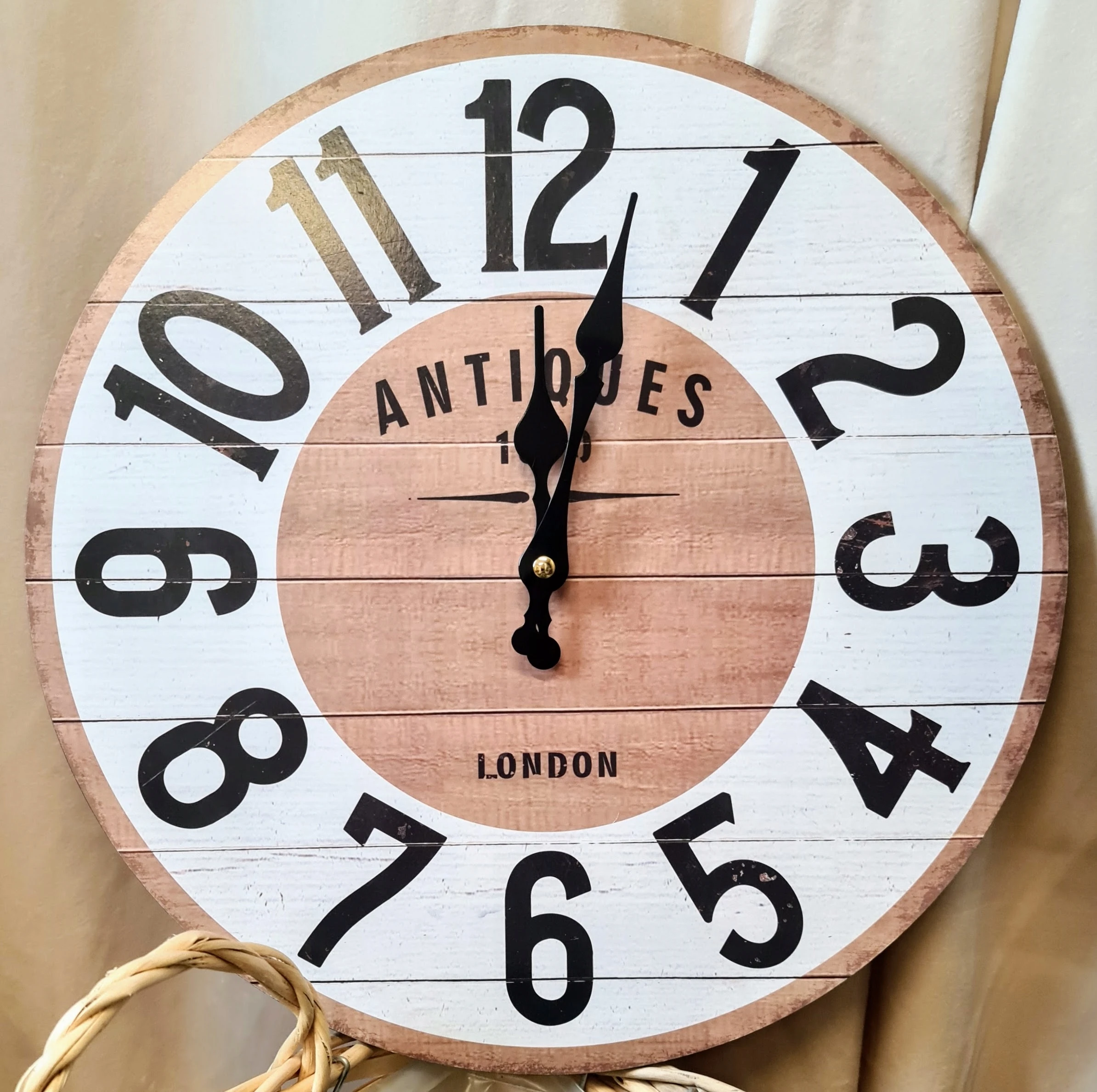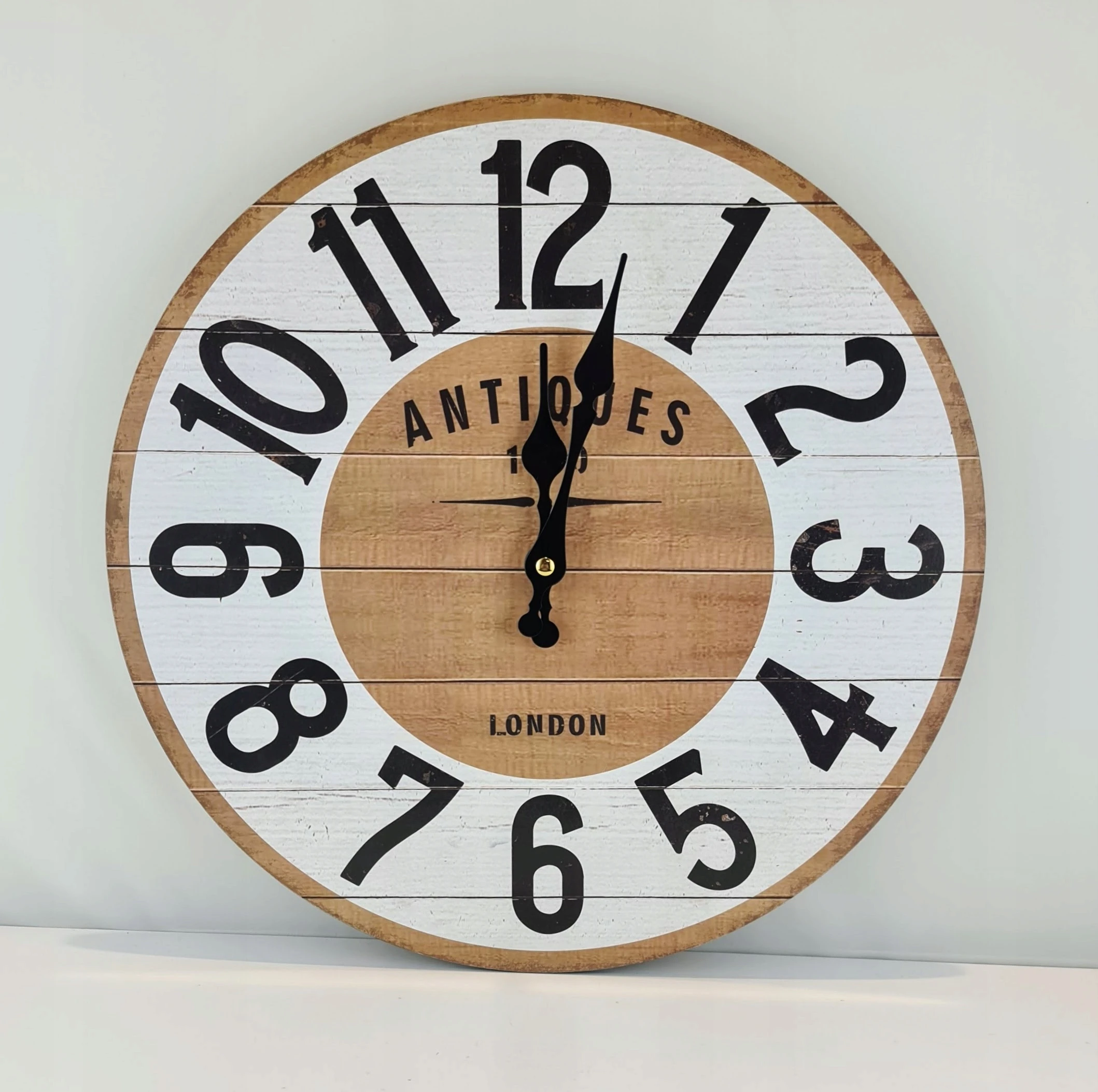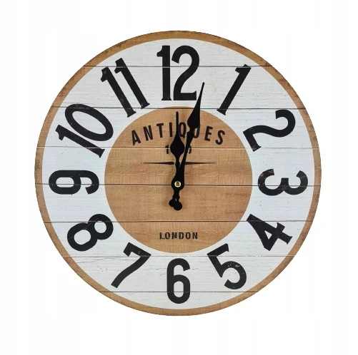 Drewniany zegar, idealnie wkomponuje się w klasyczne wnętrze, jak i w styl vintage. Kolorystyka naturalnego drewna połączona z bielą. Czarne wskazówki, napisy i cyfry.