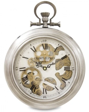 Zegar ścienny stylizowany na antyczny zegarek kieszonkowy z widocznym, ruchomym mechanizmem zębatym.