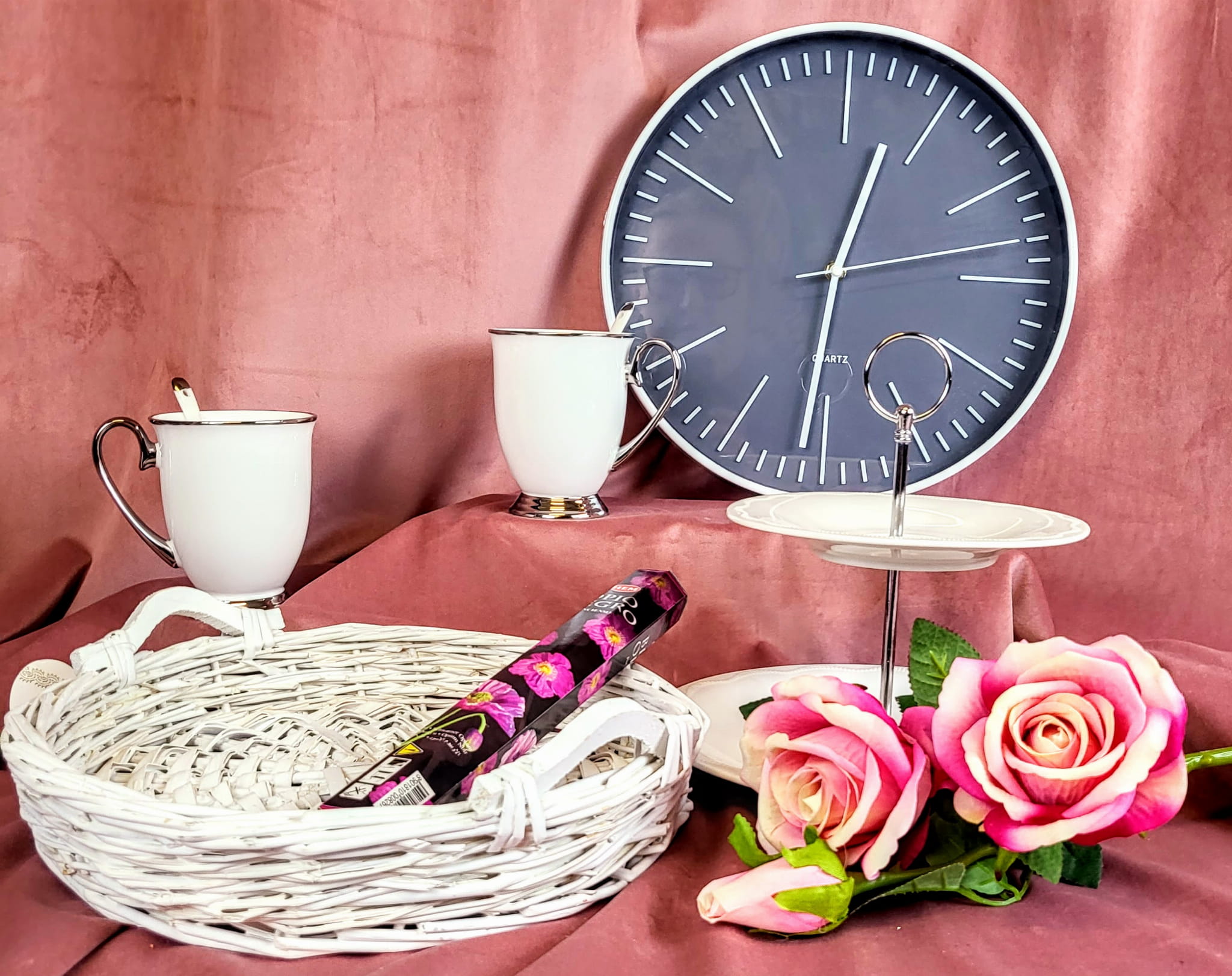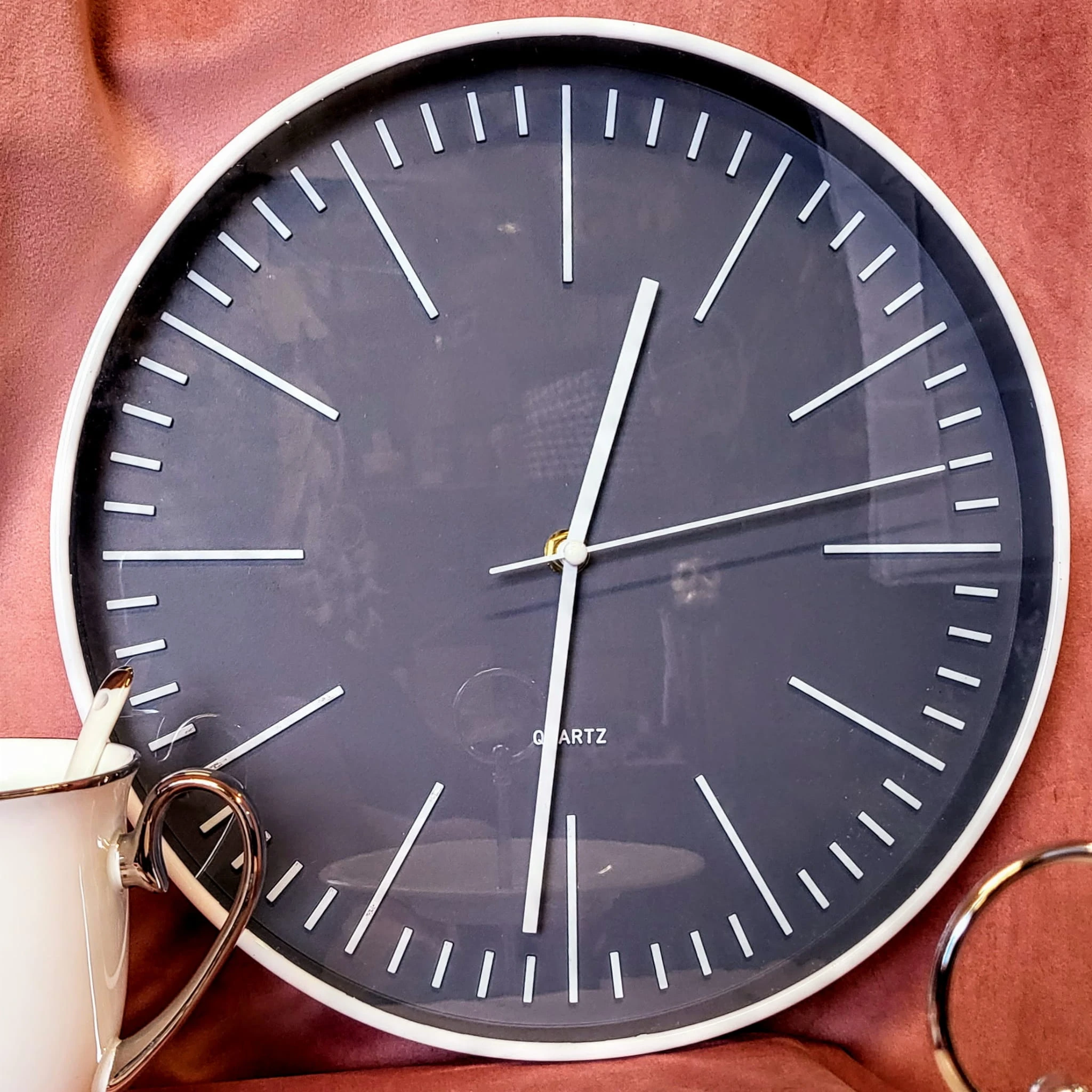 Zegar w kolorze szarym z białymi akcentami. Dzięki swojej prostocie wkomponuje się w każde wnętrze.