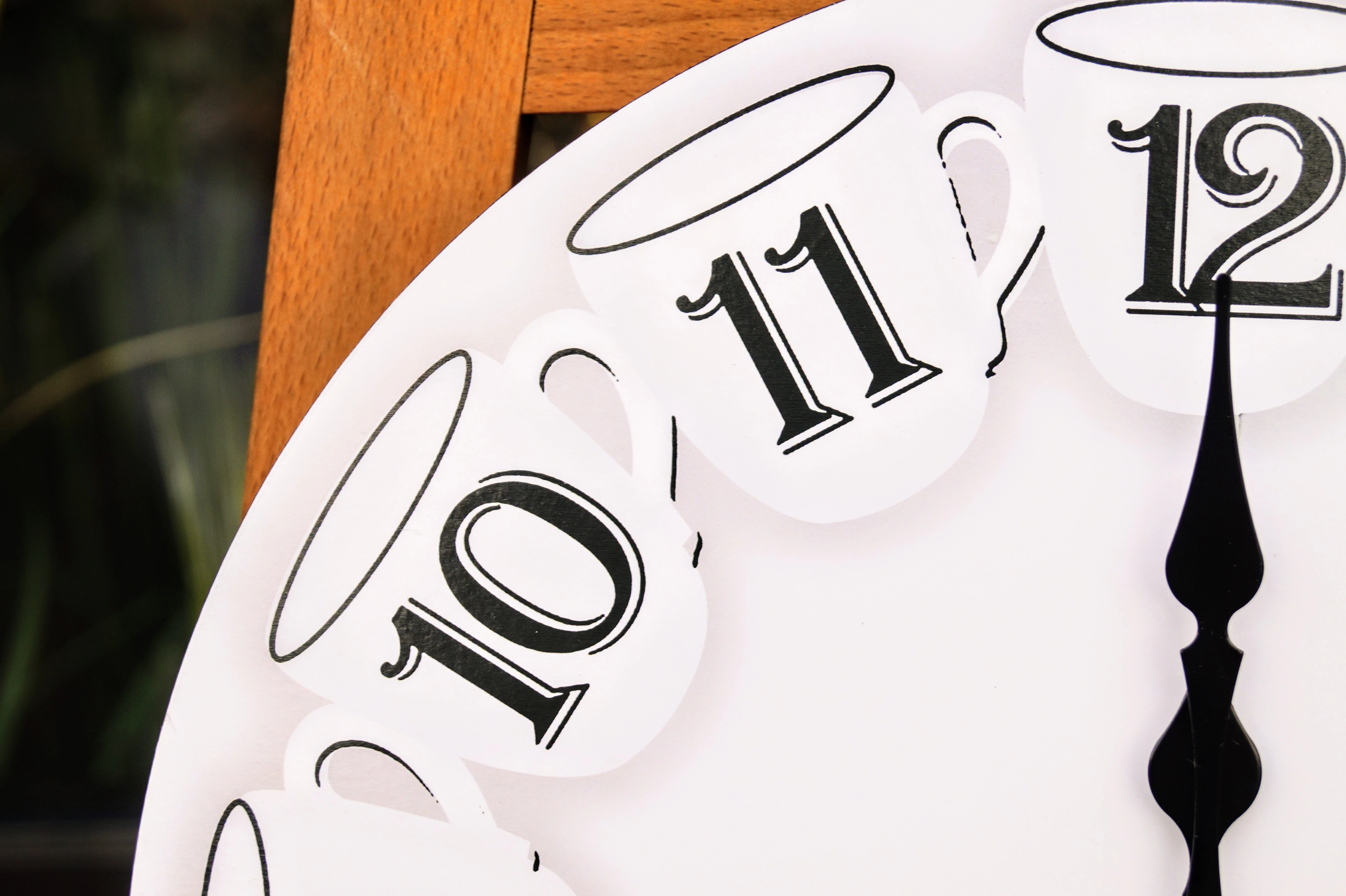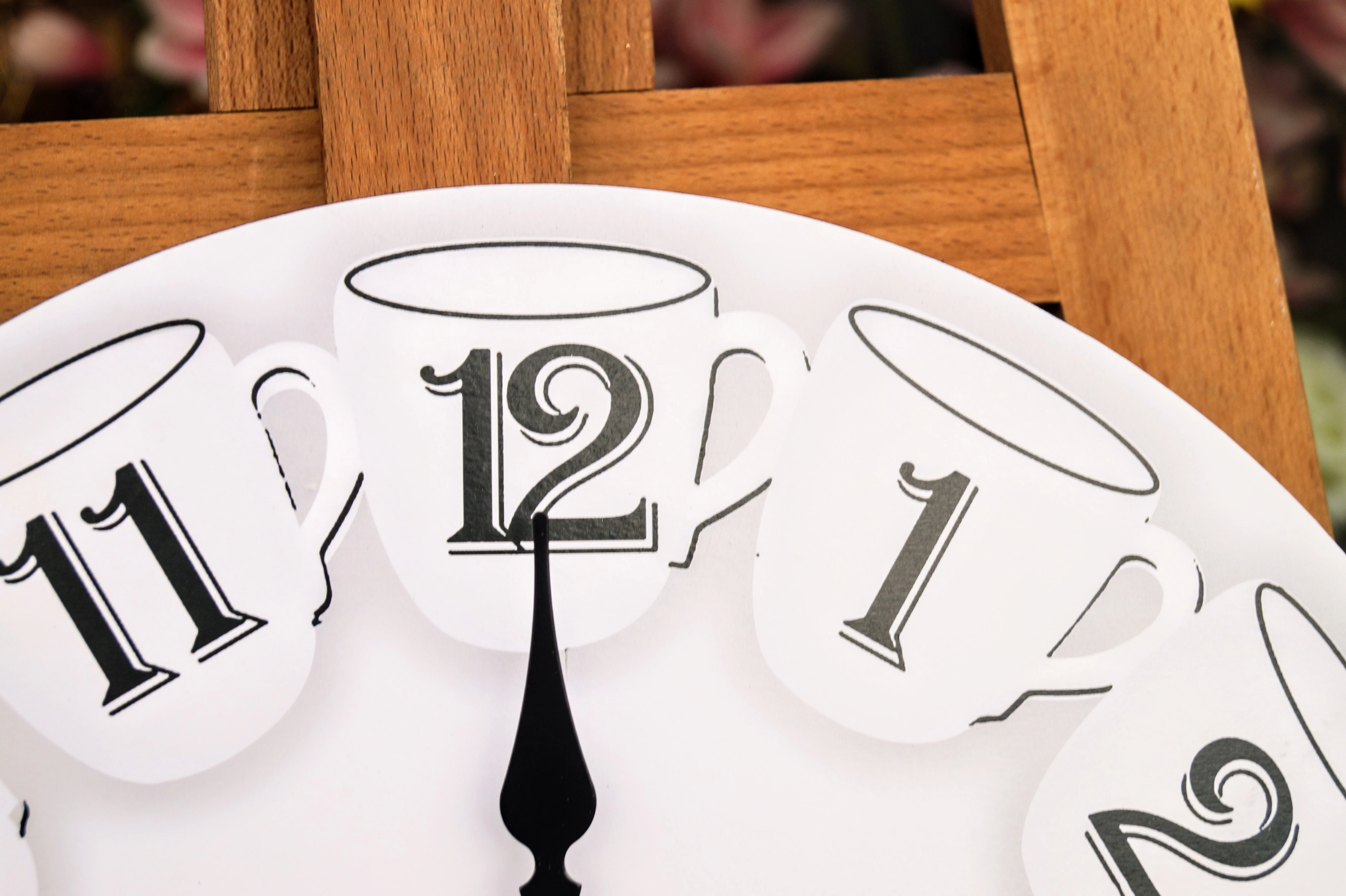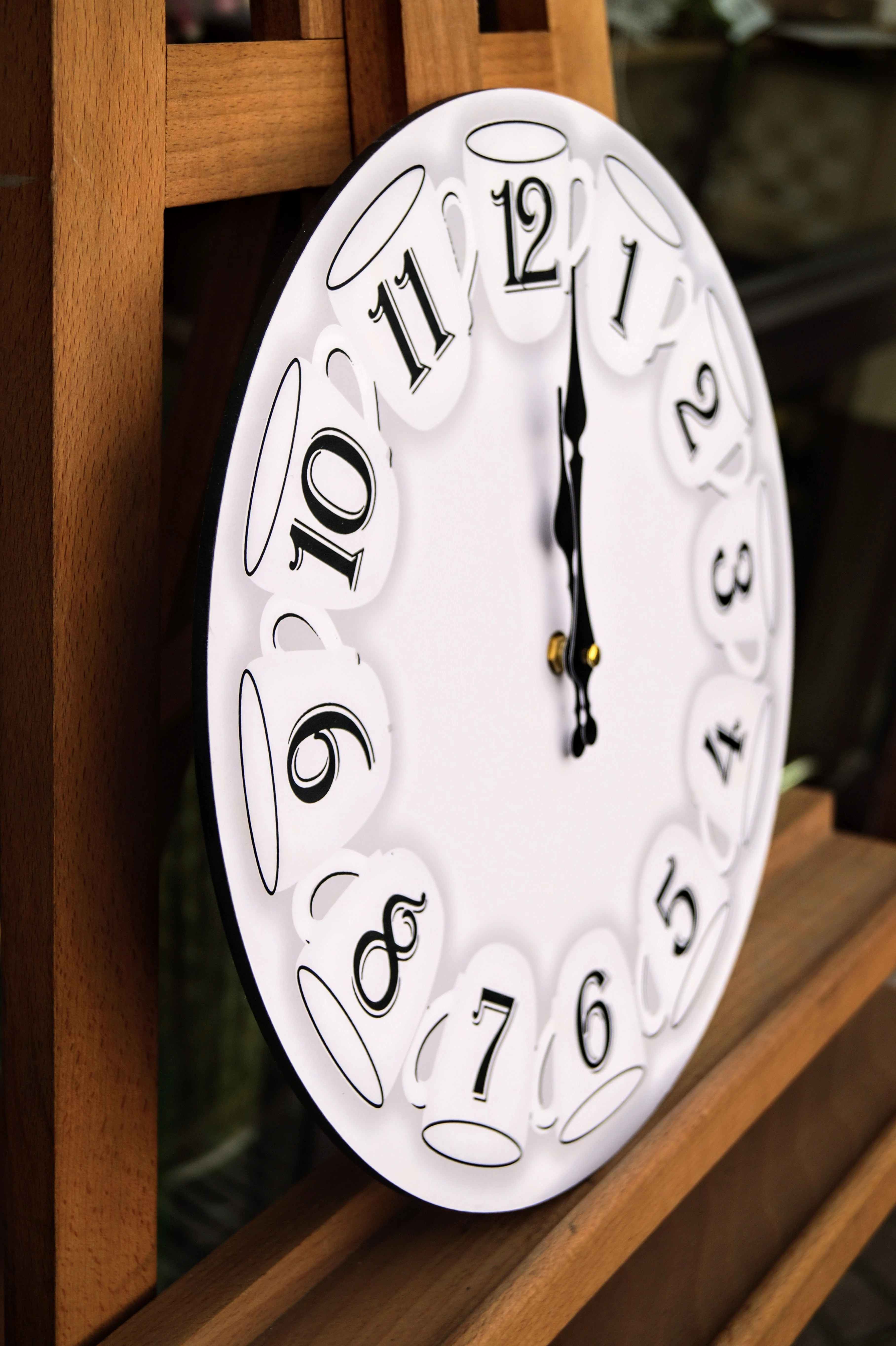 Drewniany zegar, zdobiony wzorem filiżanek, idealnie wkomponuje się w klasyczne wnętrze, jak i w styl vintage.