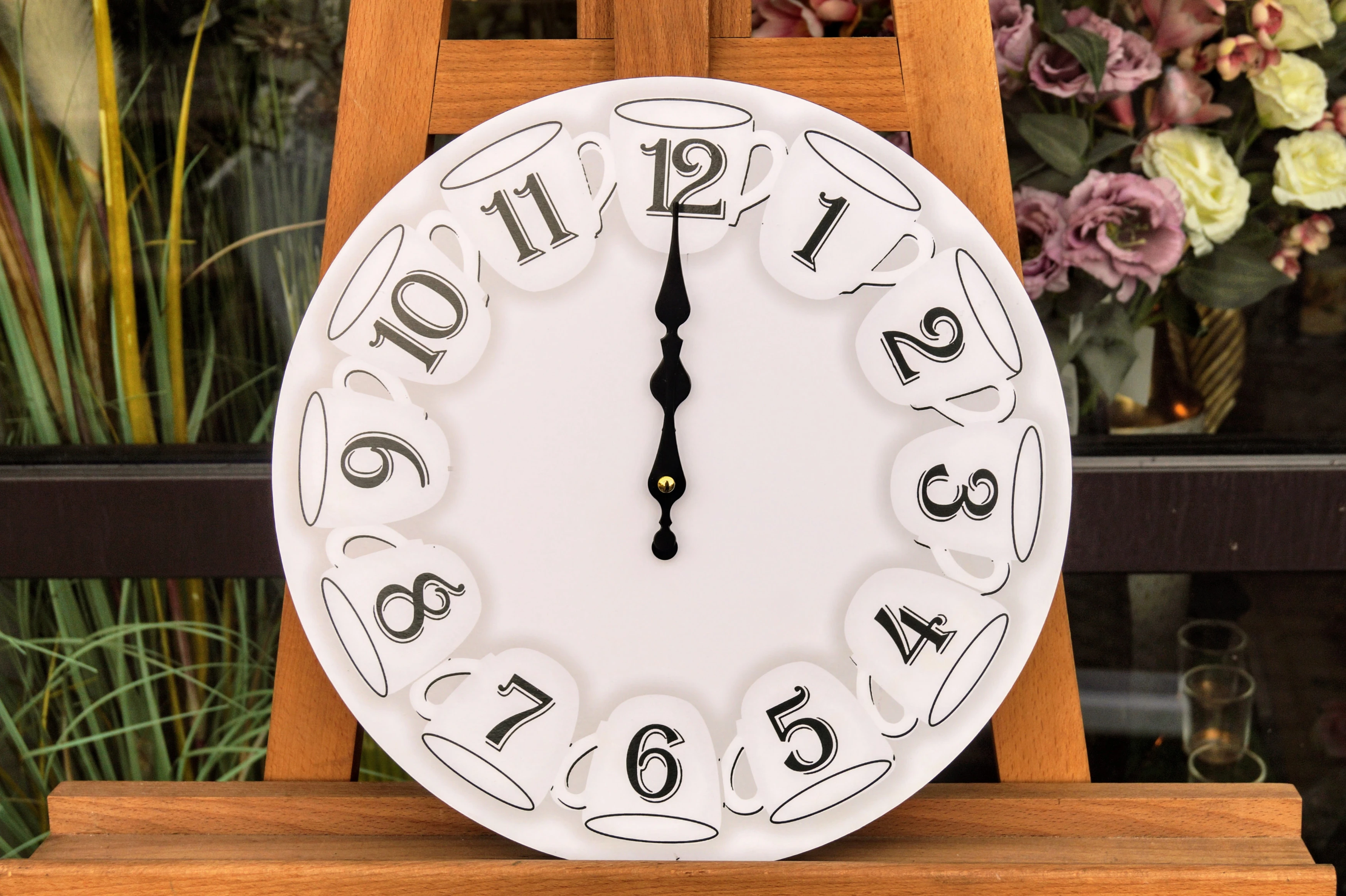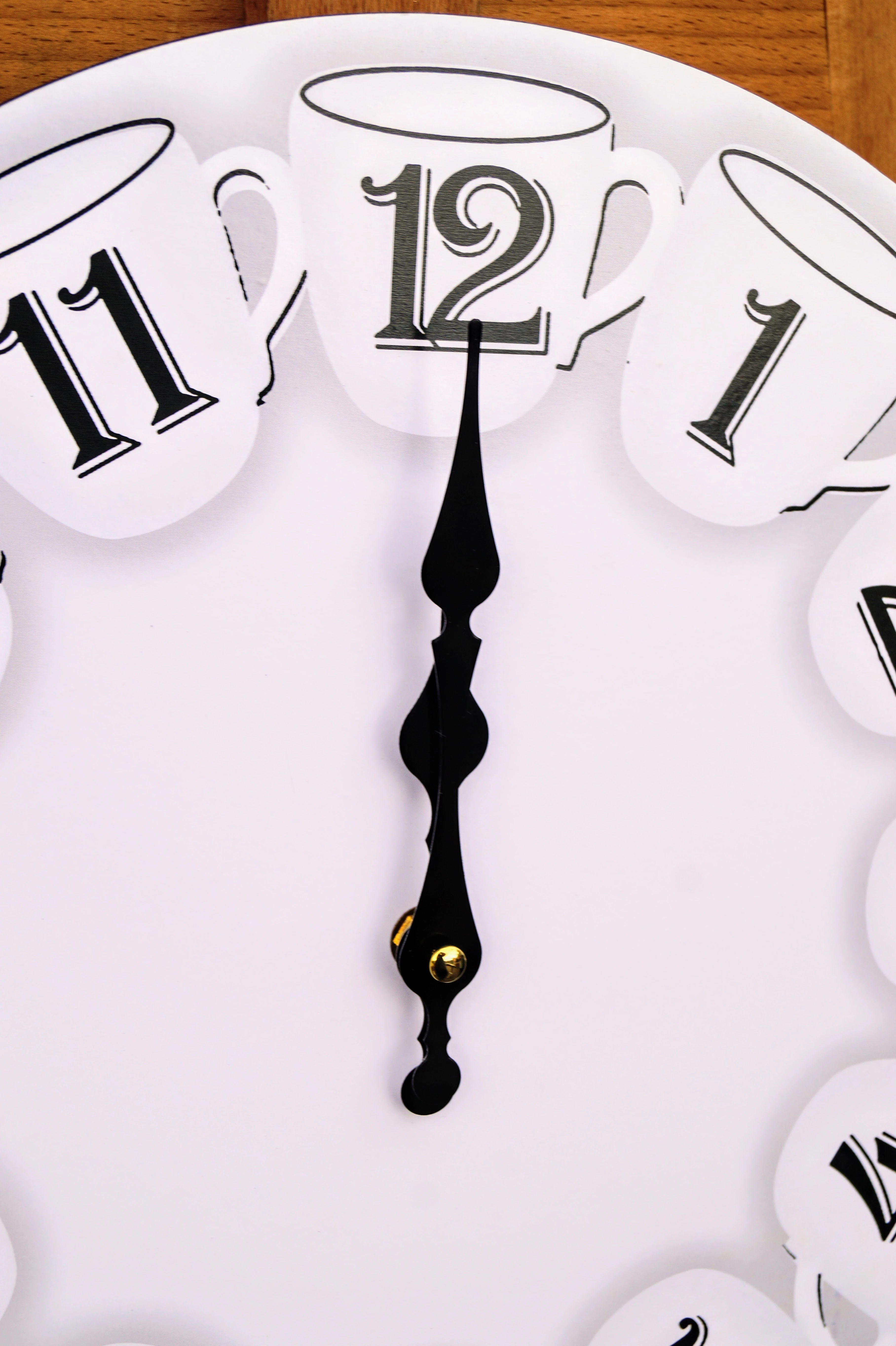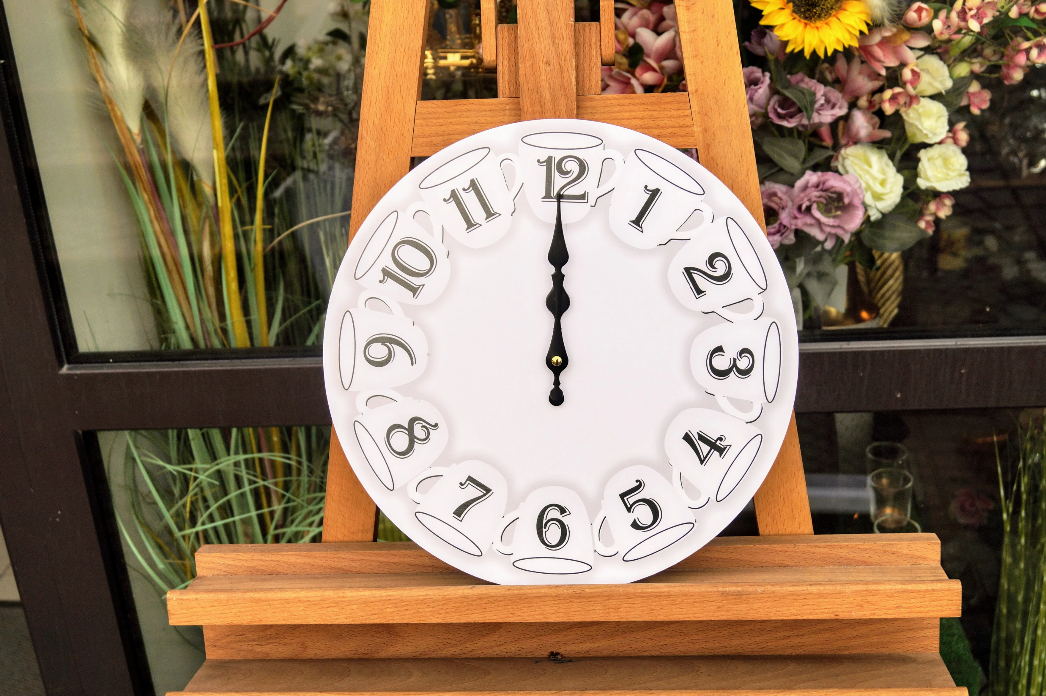Drewniany zegar, zdobiony wzorem filiżanek, idealnie wkomponuje się w klasyczne wnętrze, jak i w styl vintage.