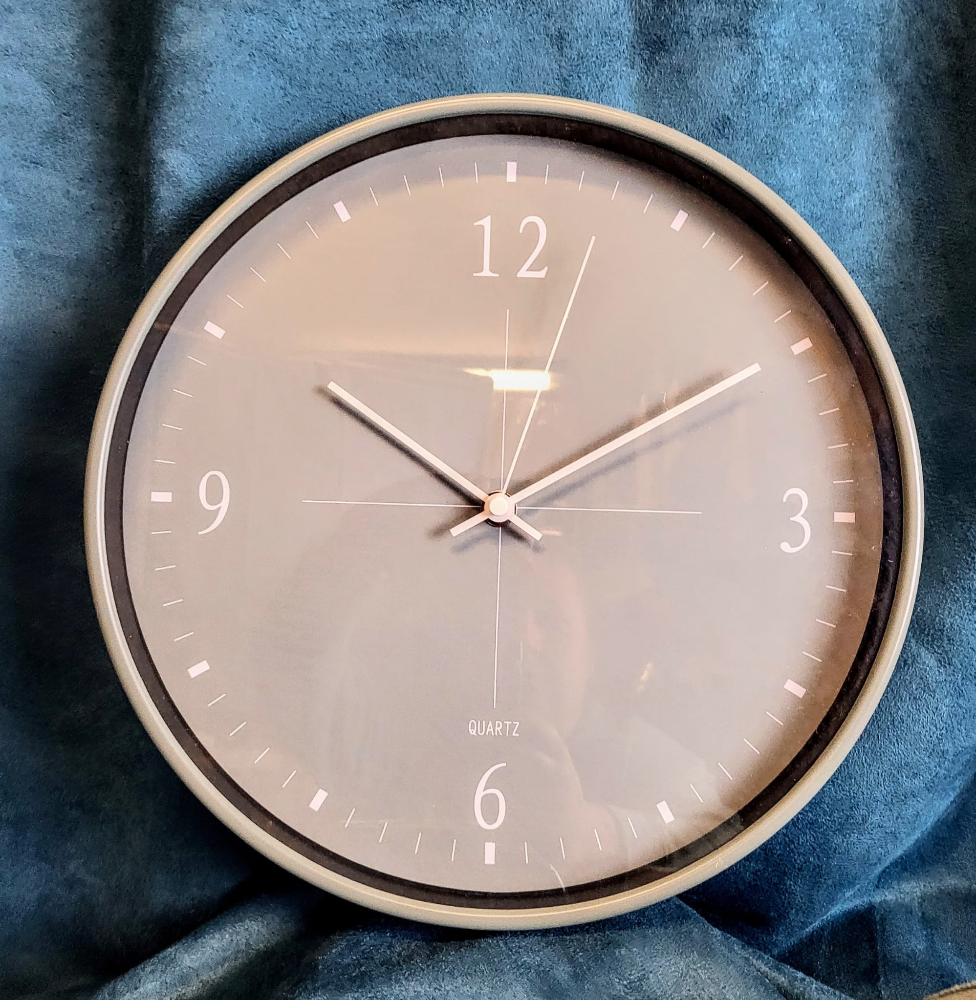 Zegar w kolorze szaro-niebieskim z białymi arabskimi cyframi. Dzięki swojej prostocie wkomponuje się w każde wnętrze.