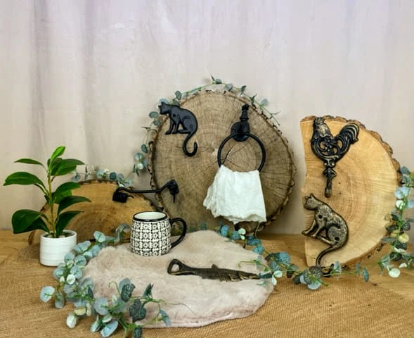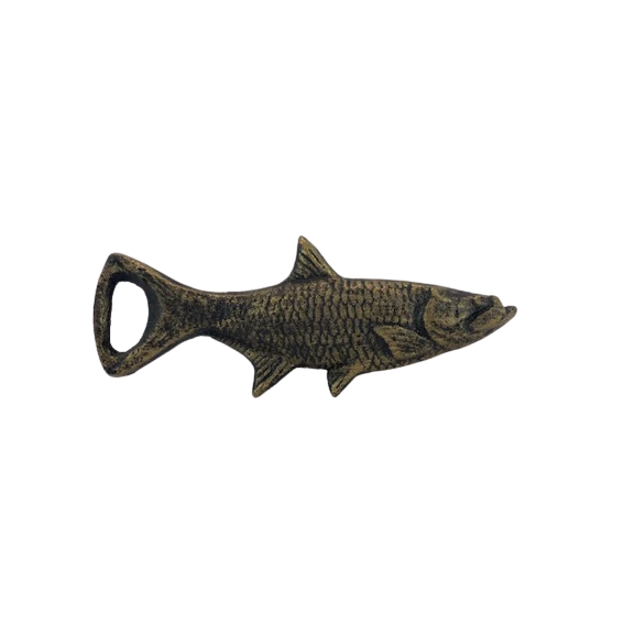 Żeliwny otwieracz do butelek, zdobiony motywem ryby.