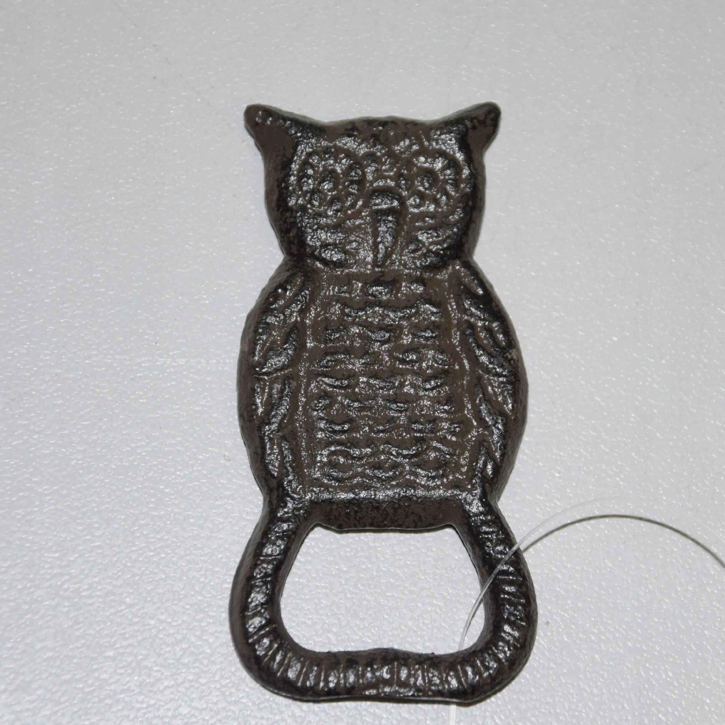 Żeliwny otwieracz do butelek w kształcie sowy.