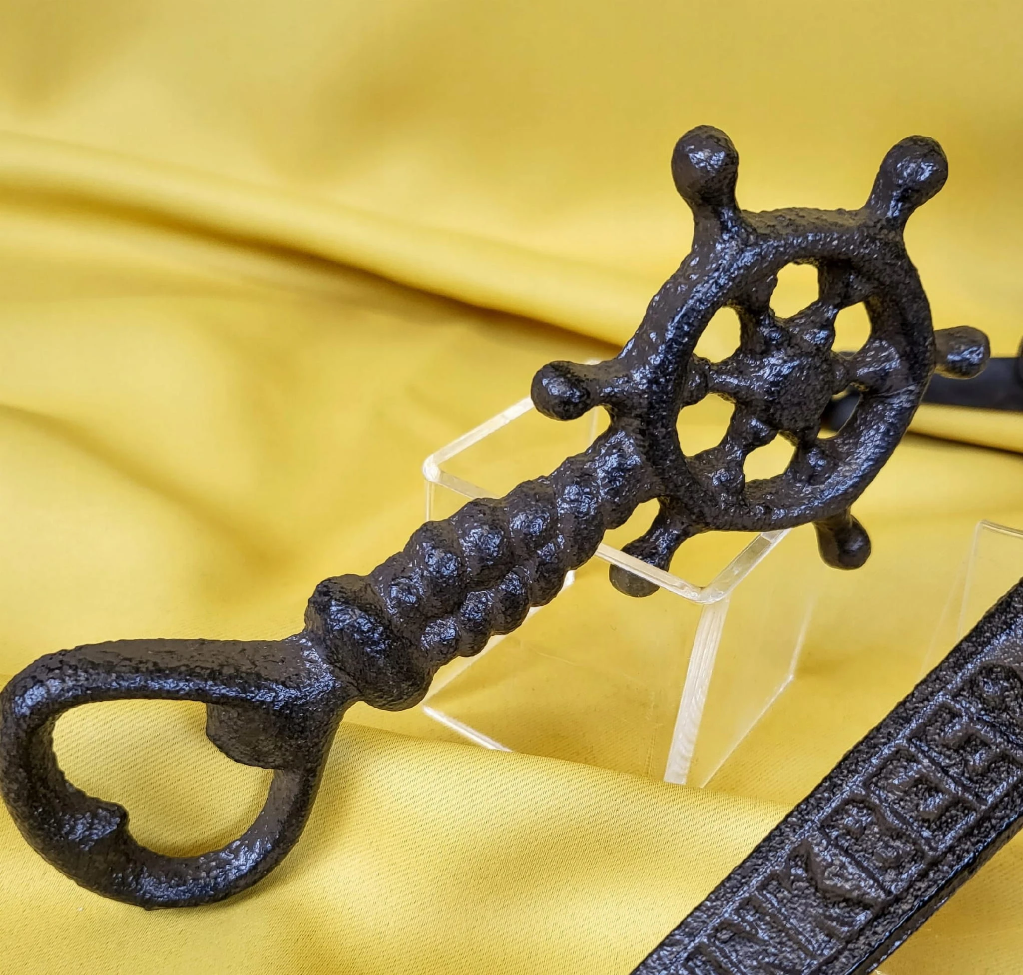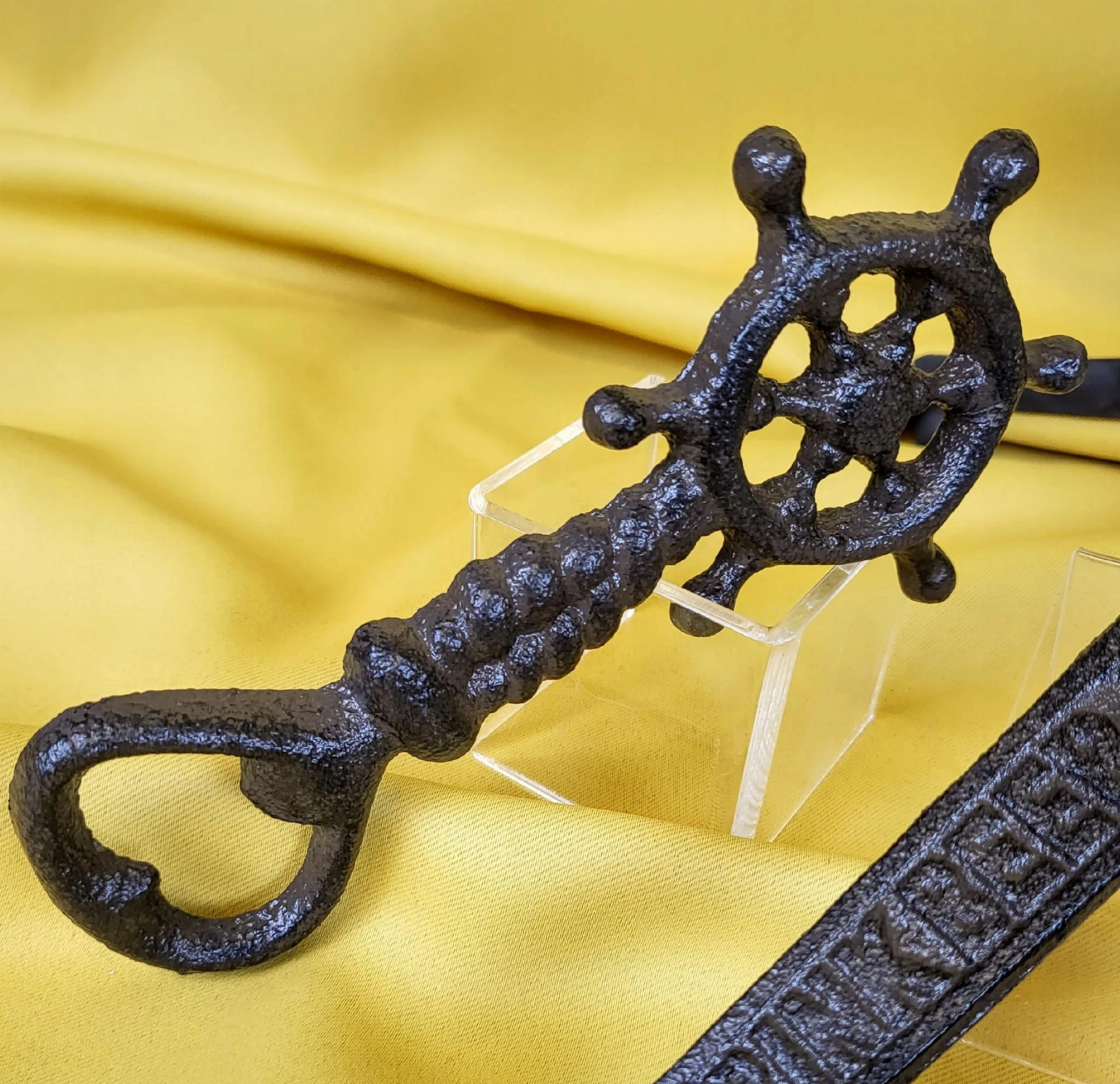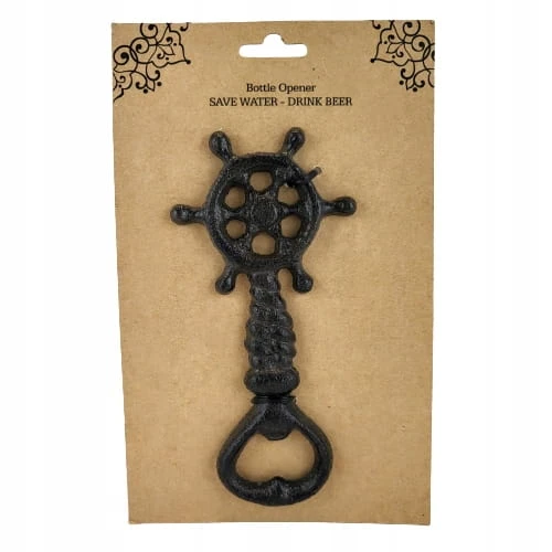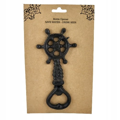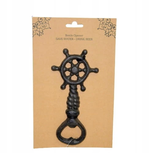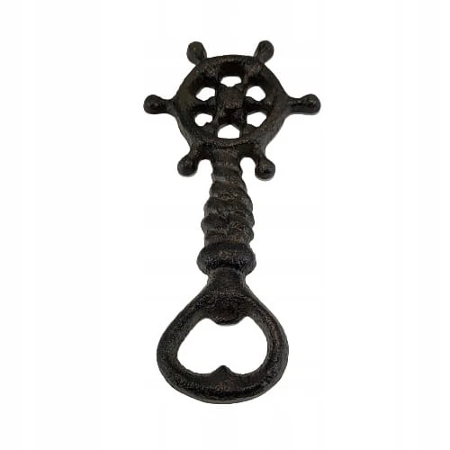 Żeliwny otwieracz do butelek, zdobiony motywem koła sterowego.