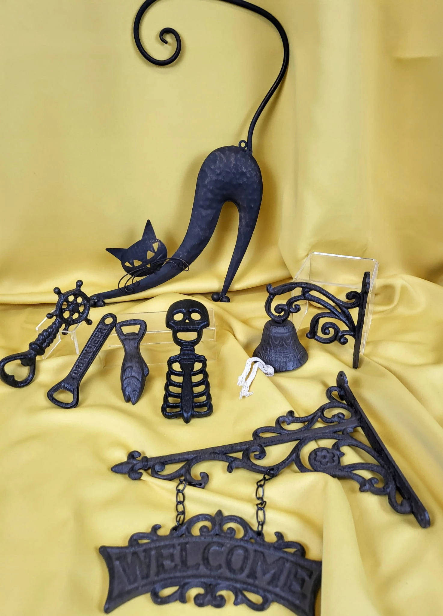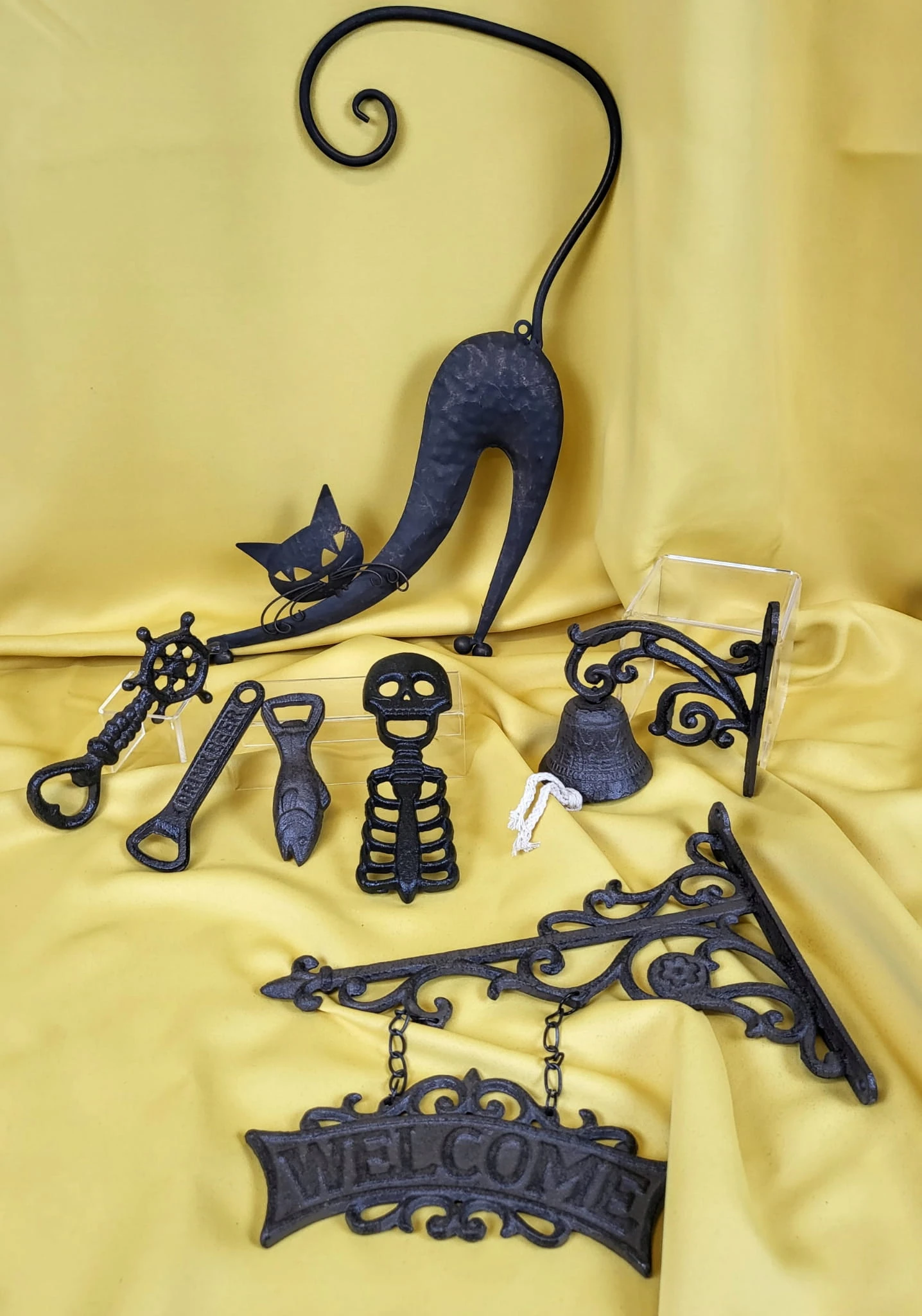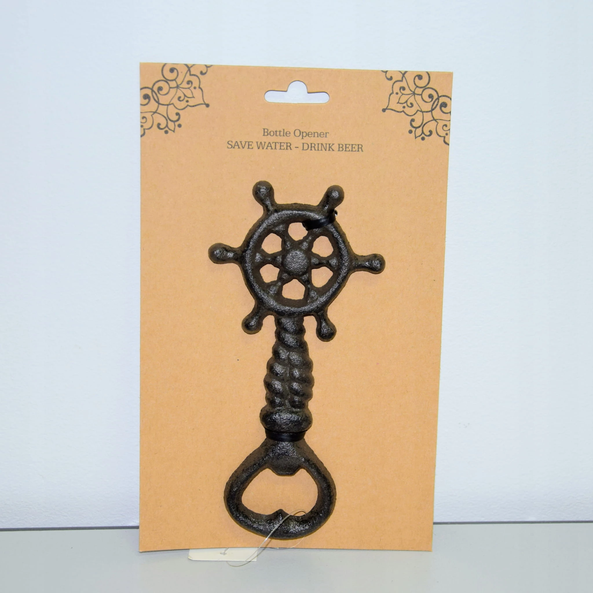 Żeliwny otwieracz do butelek, zdobiony motywem koła sterowego.