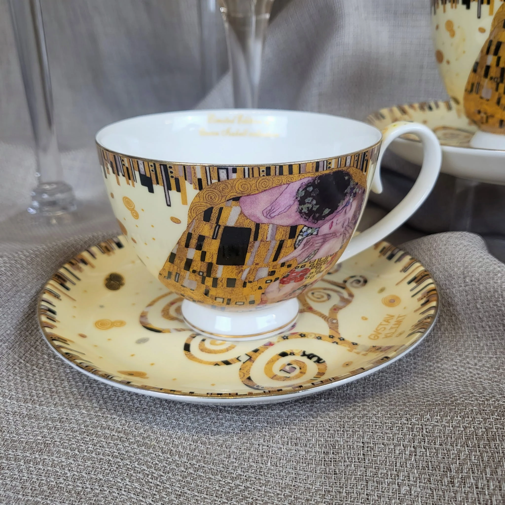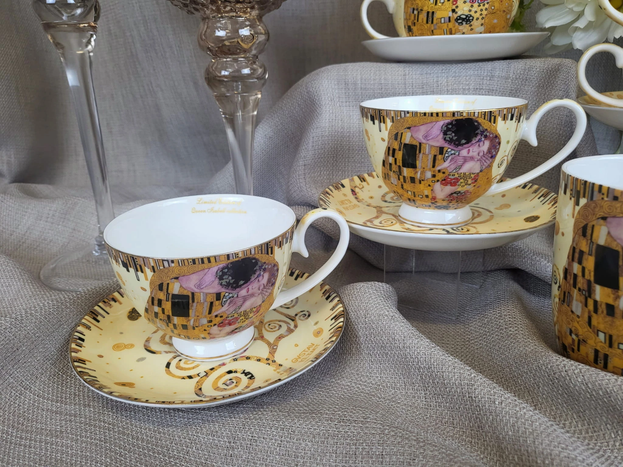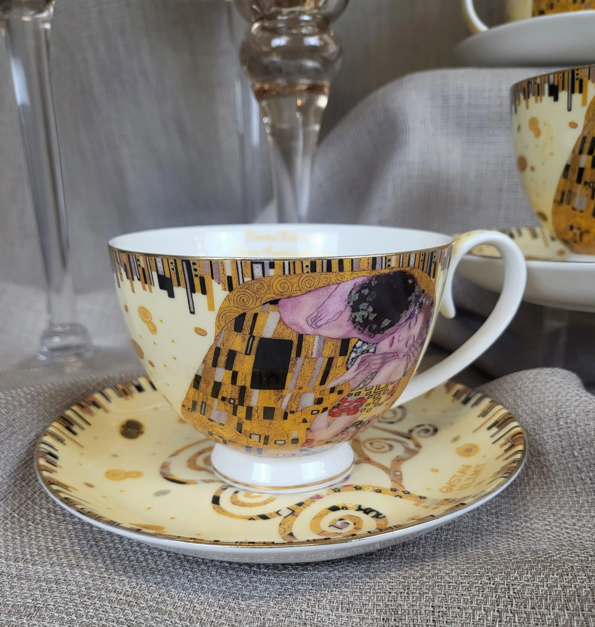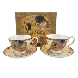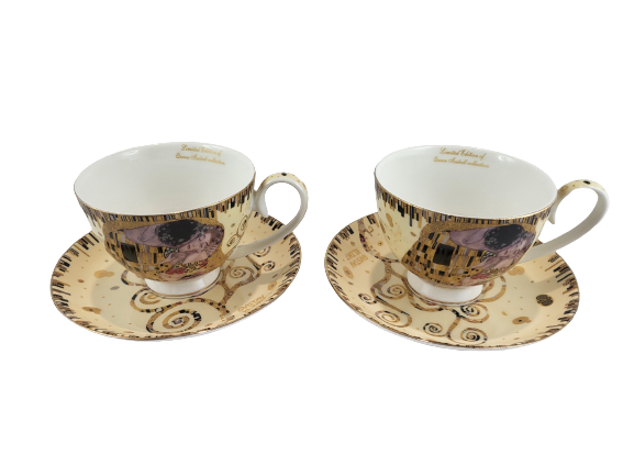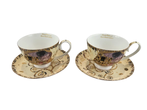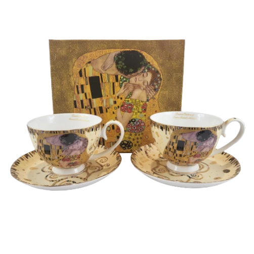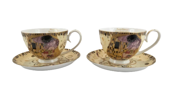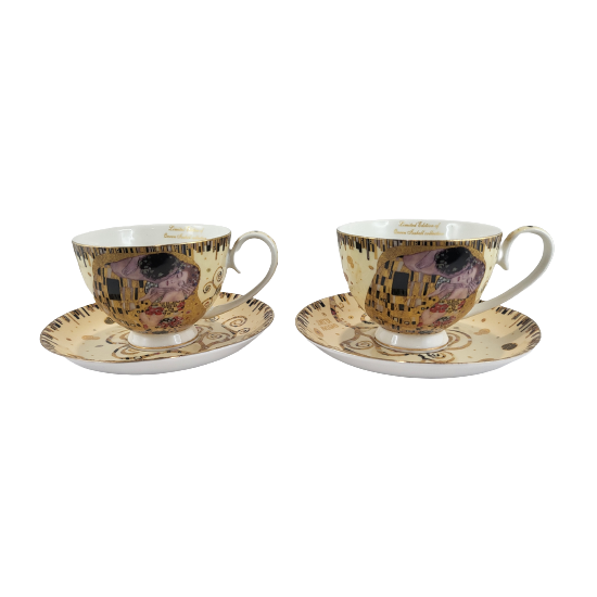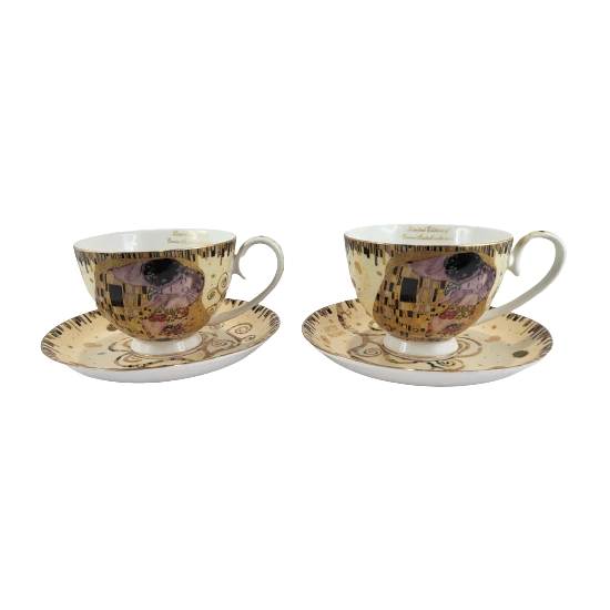 Elegancki zestaw 2 filiżanek z talerzykami z motywem obrazu "Pocałunek". Idealny pomysł na upominek dla miłośników twórczości Gustava Klimta lub sztuki secesji.