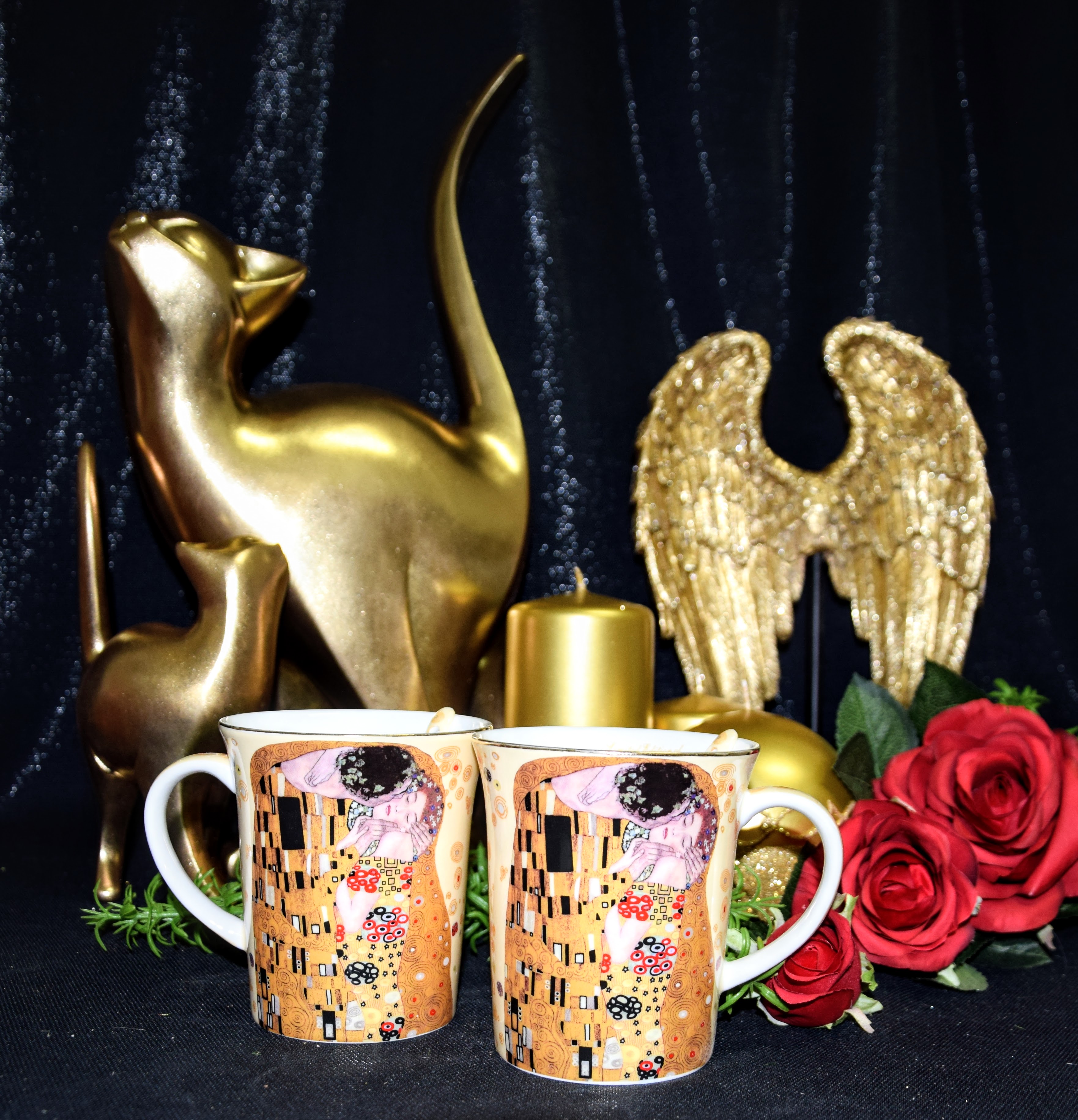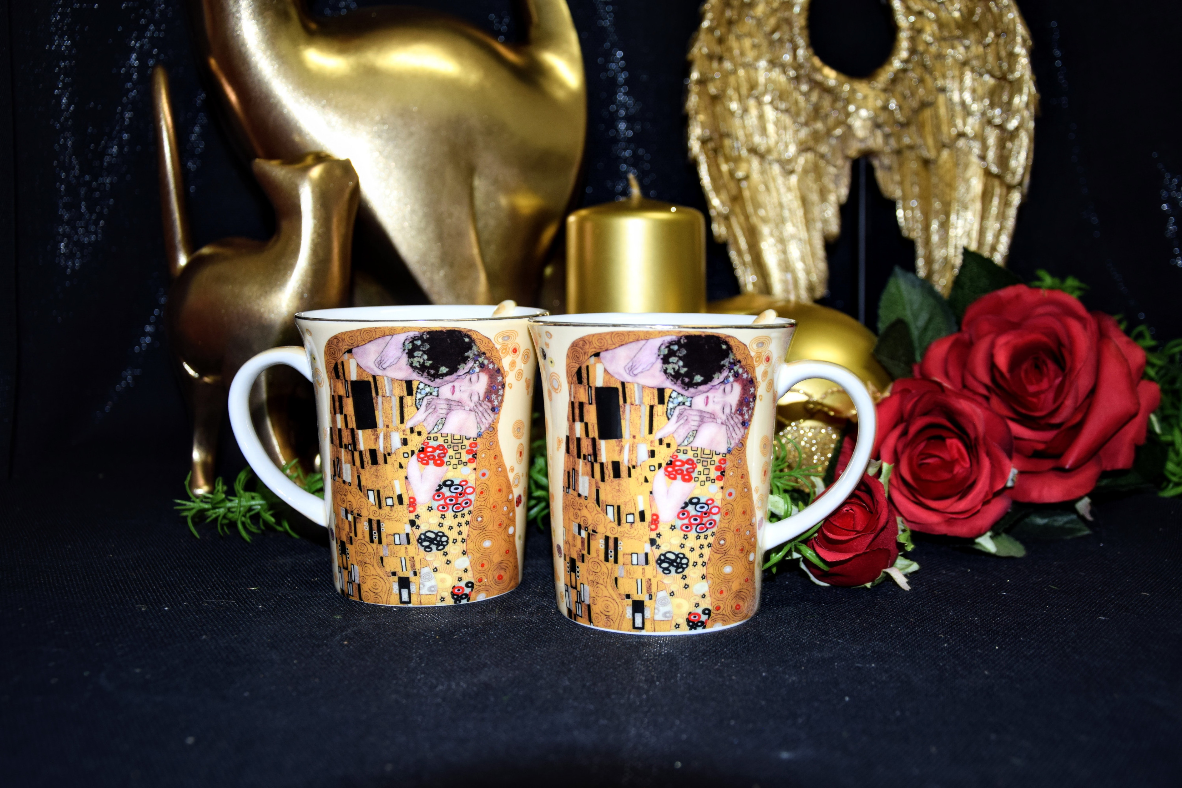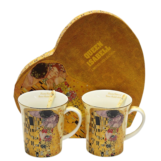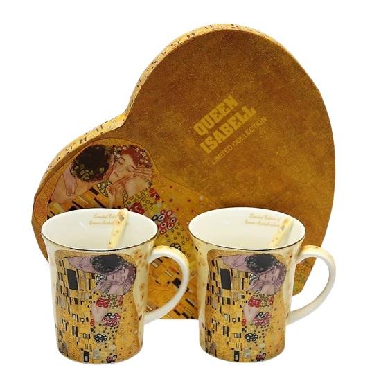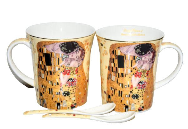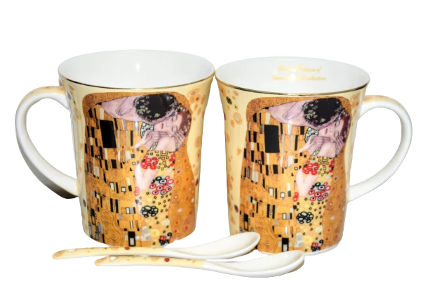 Elegancki zestaw 2 kubków z łyżeczkami z motywem obrazu "Pocałunek". Idealny pomysł na upominek dla miłośników twórczości Gustava Klimta lub sztuki secesji.