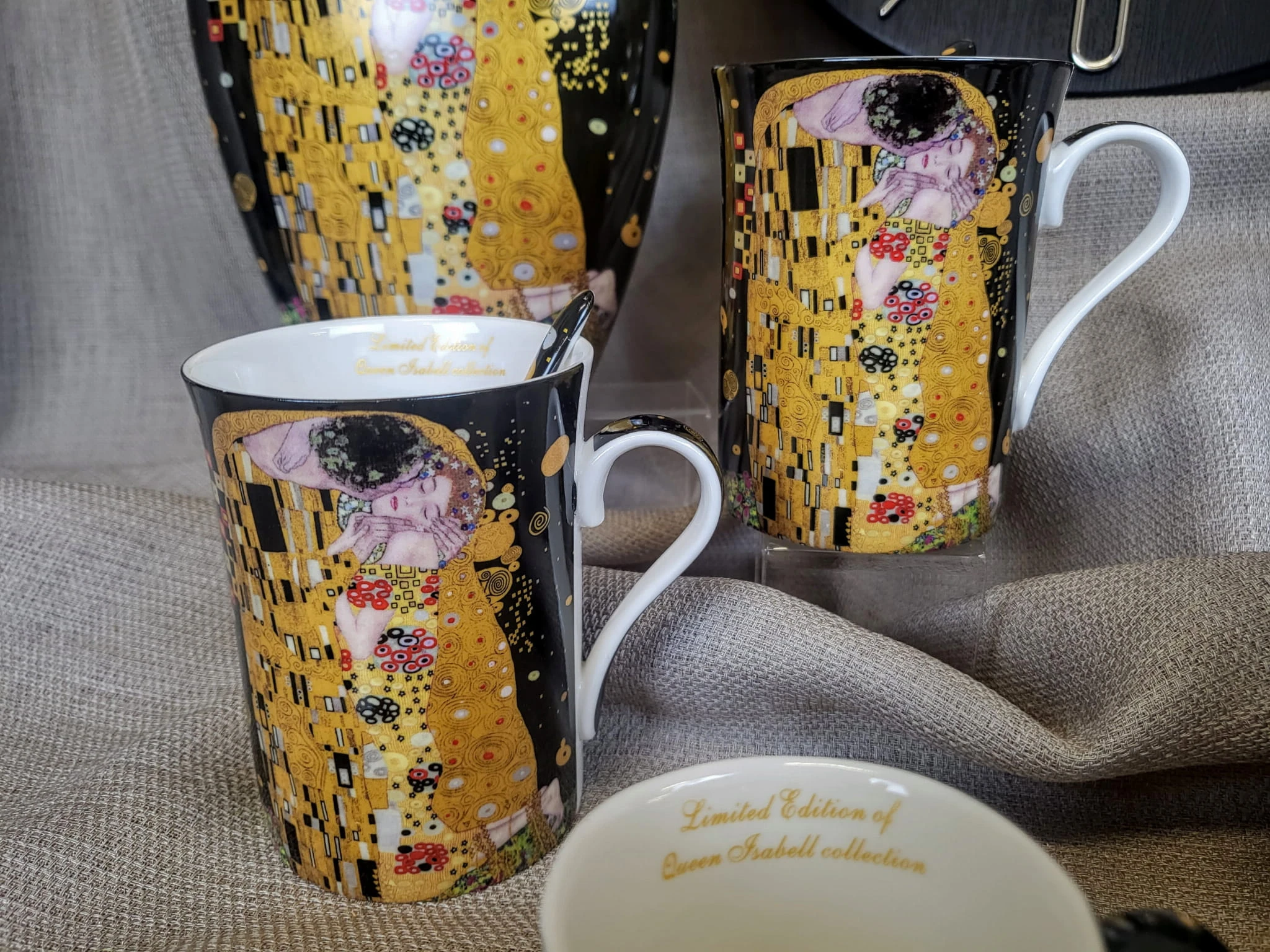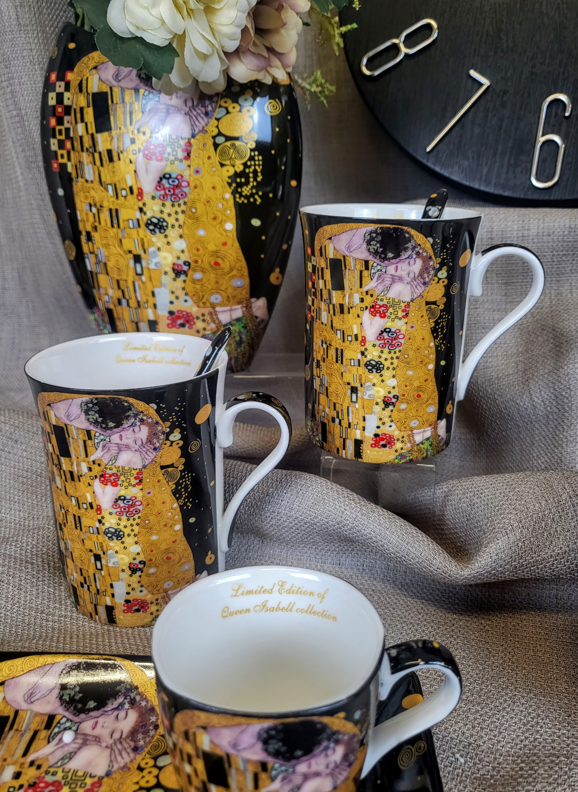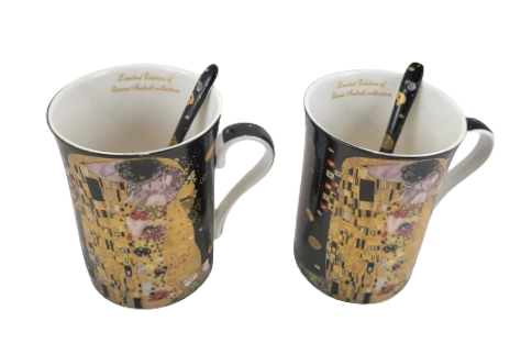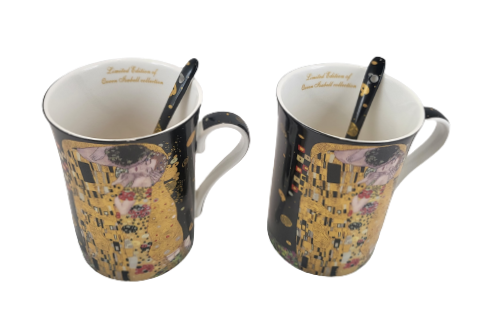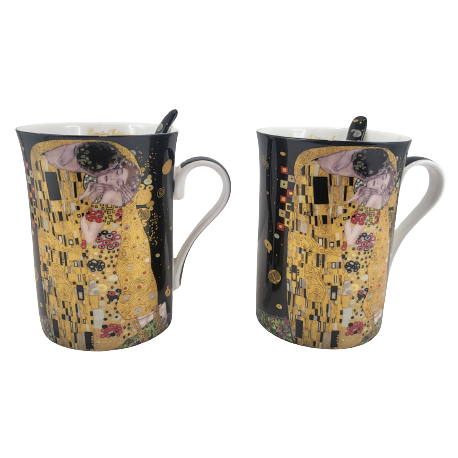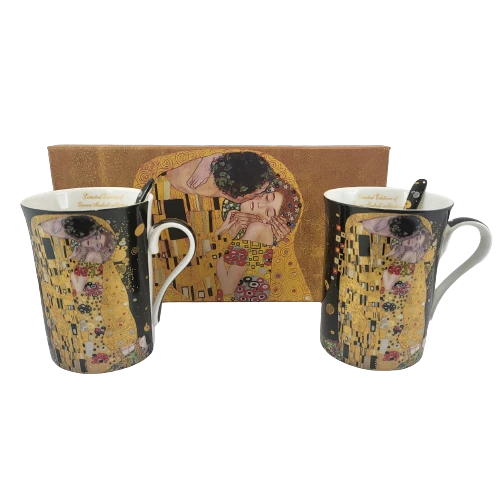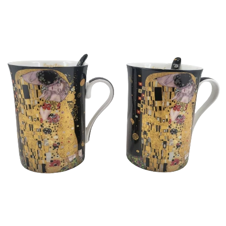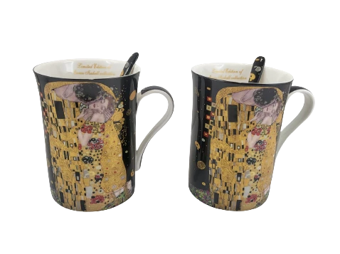 Elegancki zestaw 2 kubków z łyżeczkami z motywem obrazu "Pocałunek". Idealny pomysł na upominek dla miłośników twórczości Gustava Klimta lub sztuki secesji.