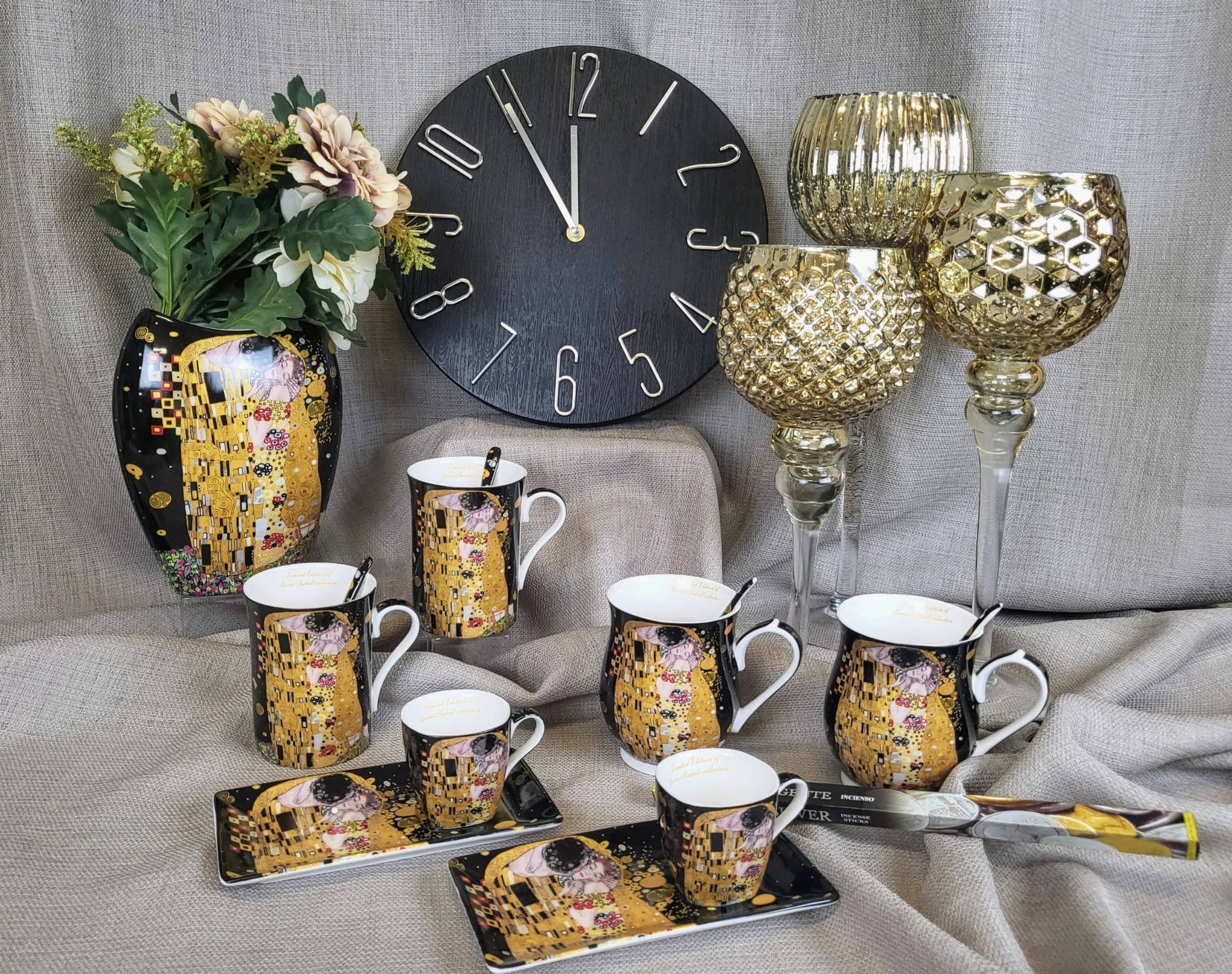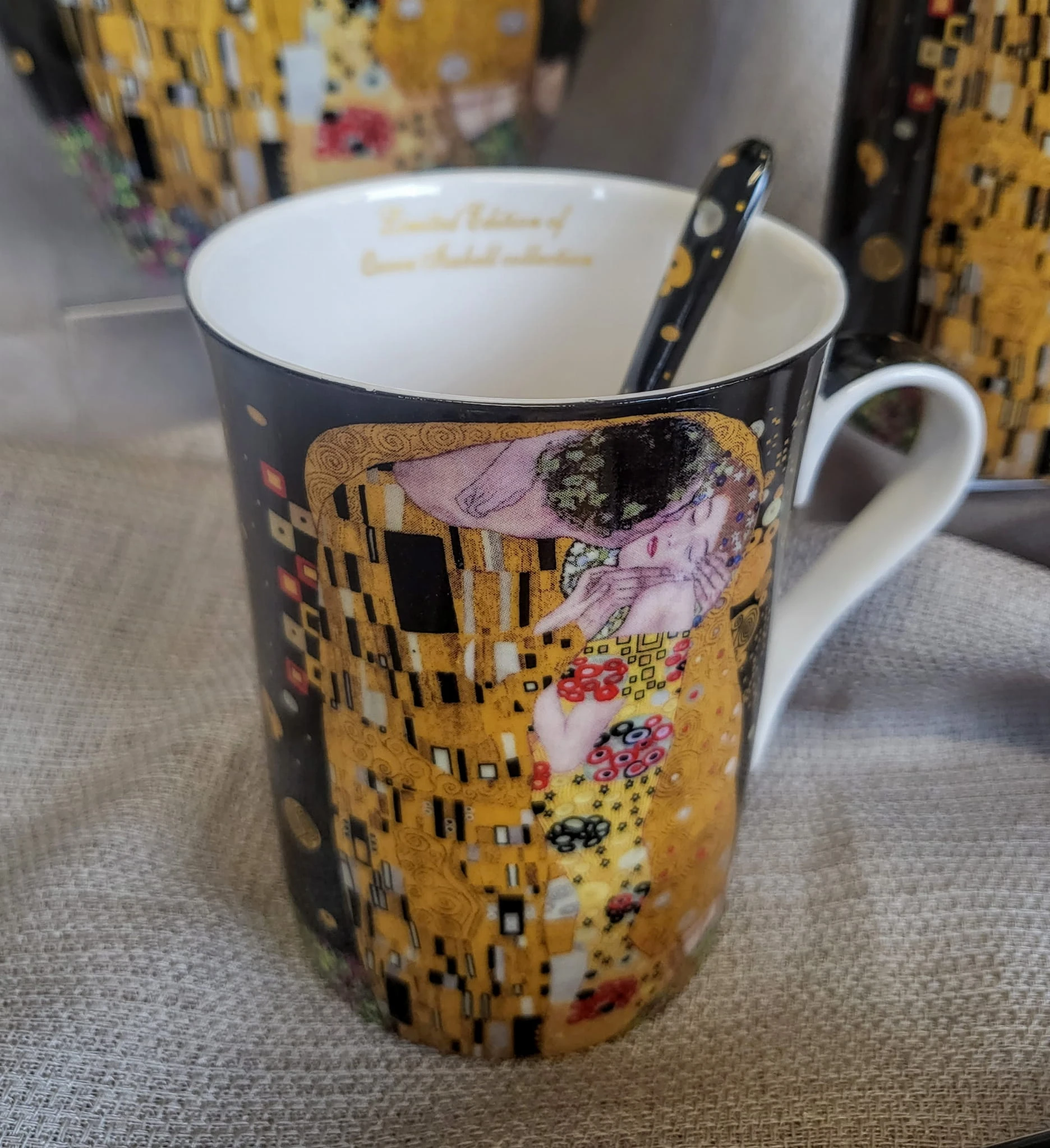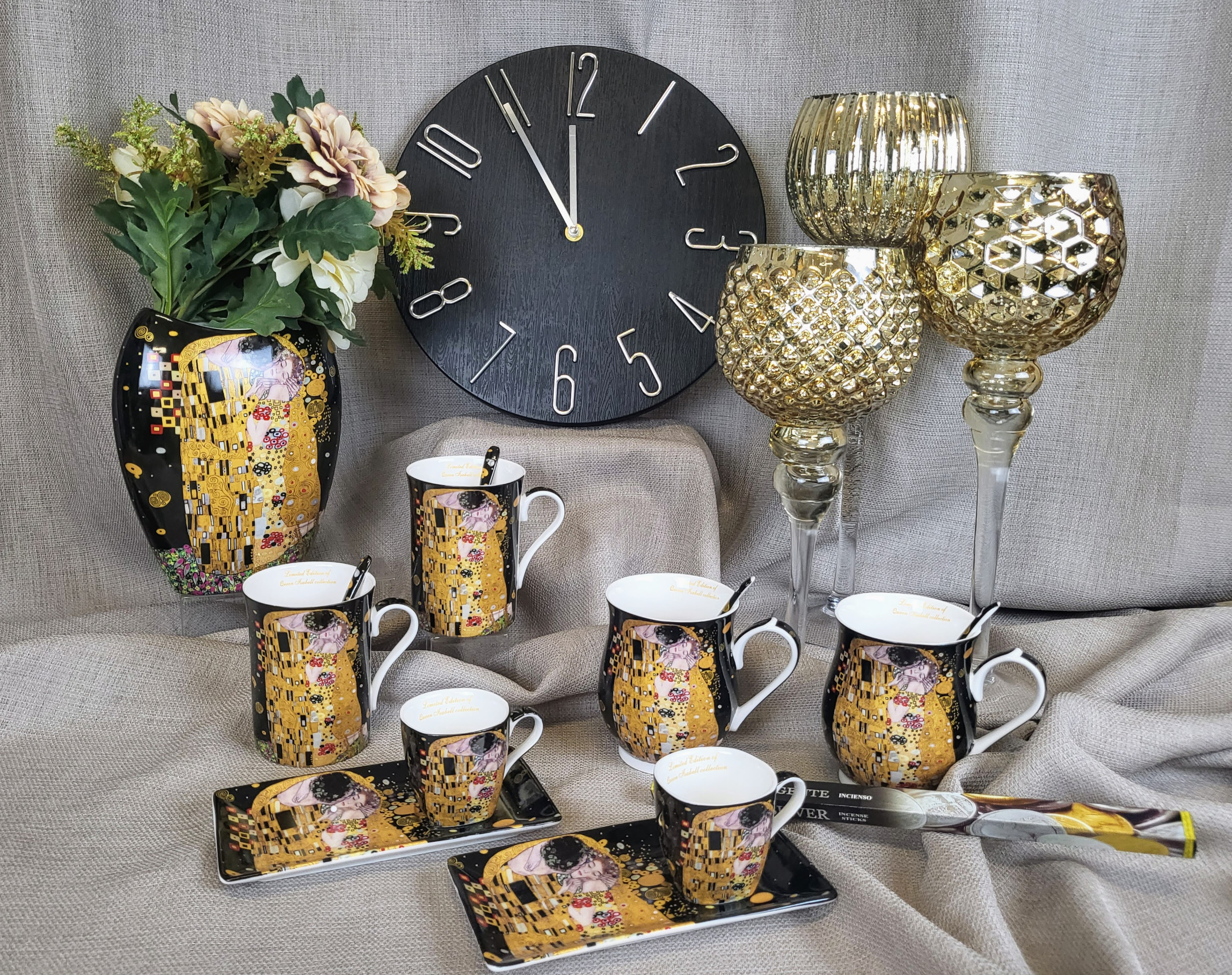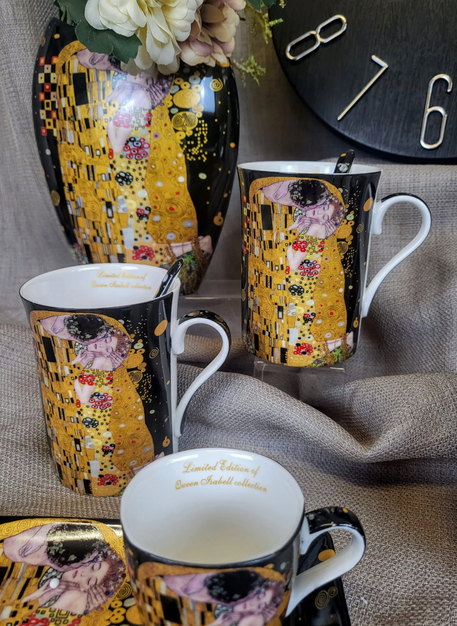 Elegancki zestaw 2 kubków z łyżeczkami z motywem obrazu "Pocałunek". Idealny pomysł na upominek dla miłośników twórczości Gustava Klimta lub sztuki secesji.