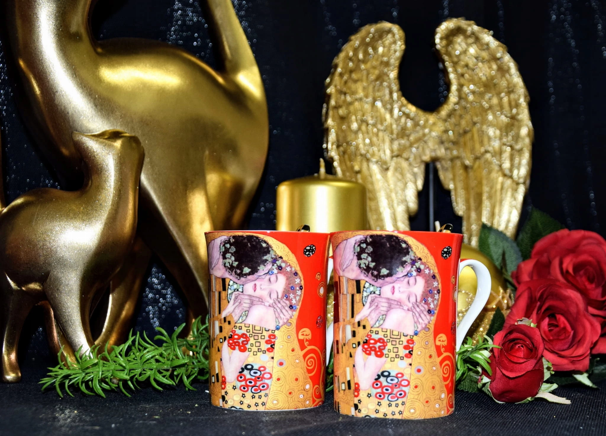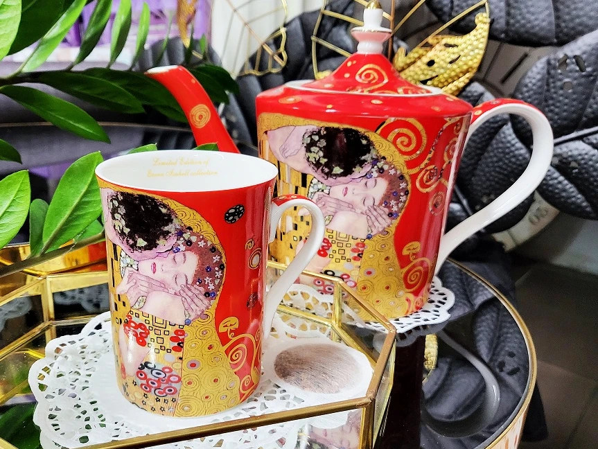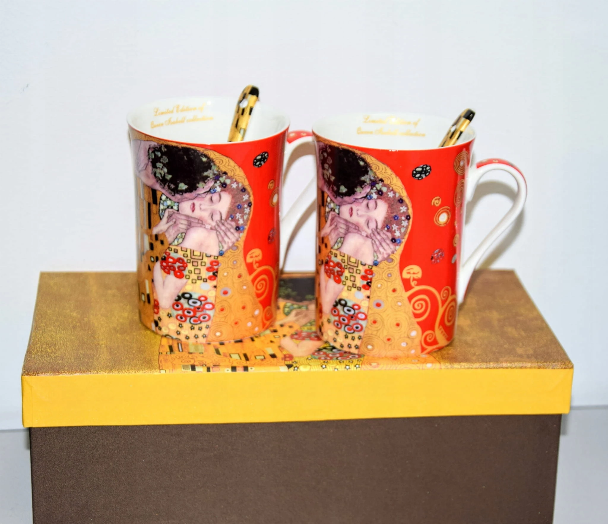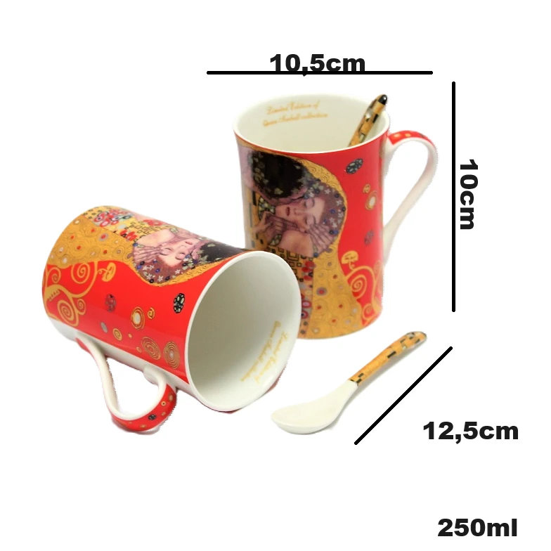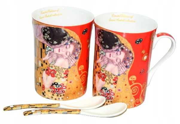Komplet dwóch kubków z łyżeczką posiadający zdobienie przedstawiające obraz Gustawa Klimta- Pocałunek.Idealny pomysł na upominek dla miłośników malarstwa i sztuki.